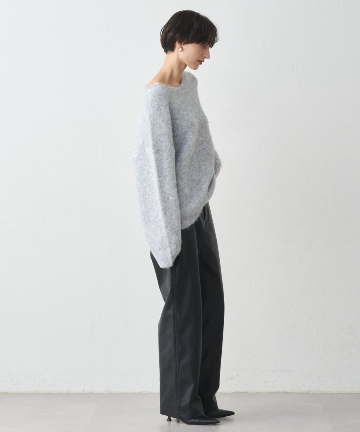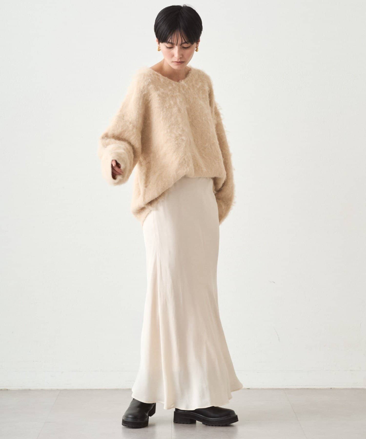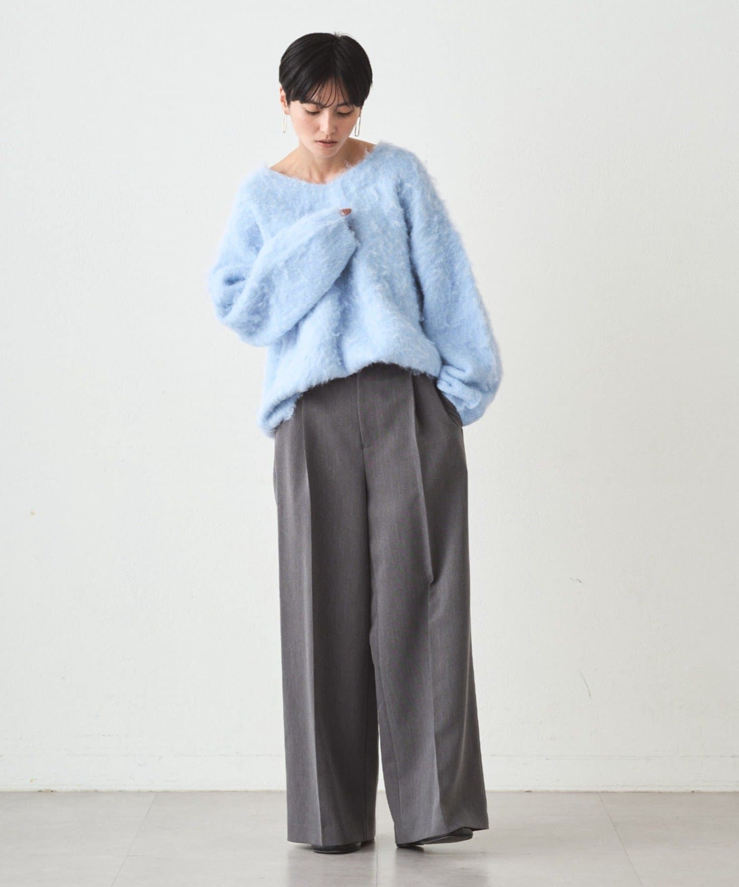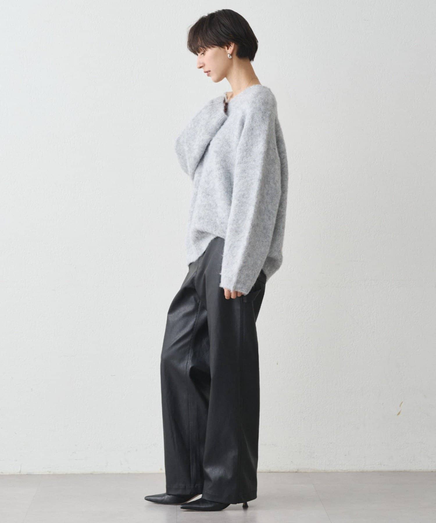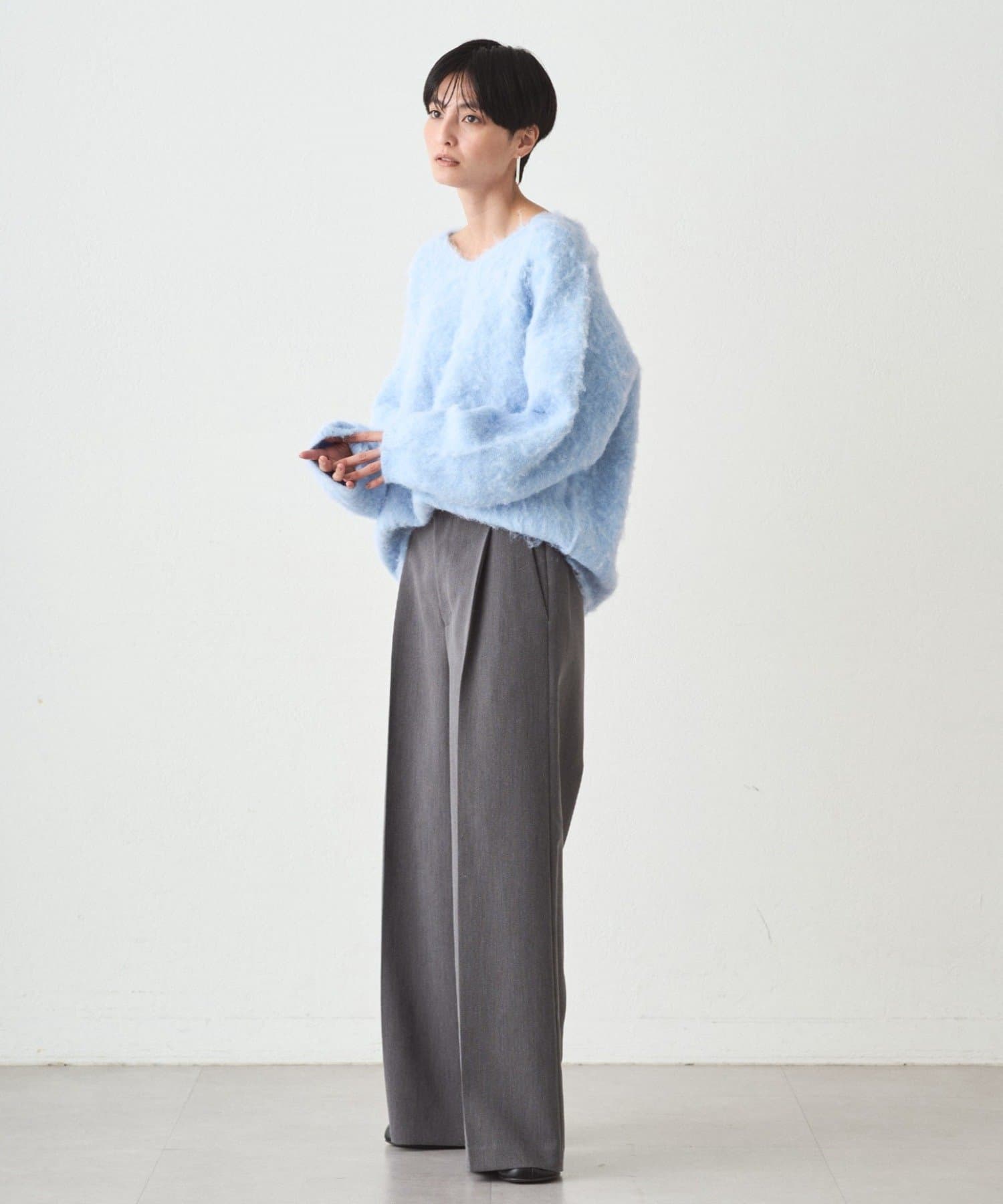 ・ゆるっとしたオーバーサイズでありながら、深めのVネックがデコルテを美しく見せてくれます