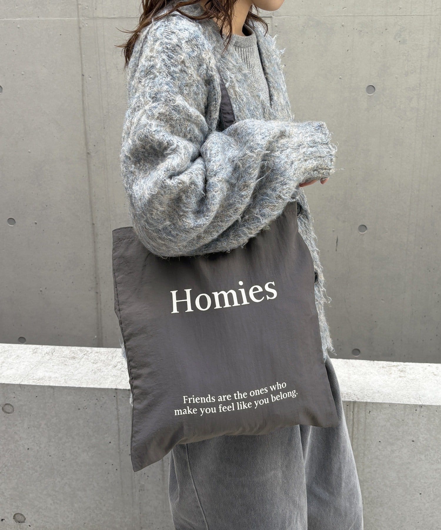 スタイリングのポイントになるロゴトートバッグ
