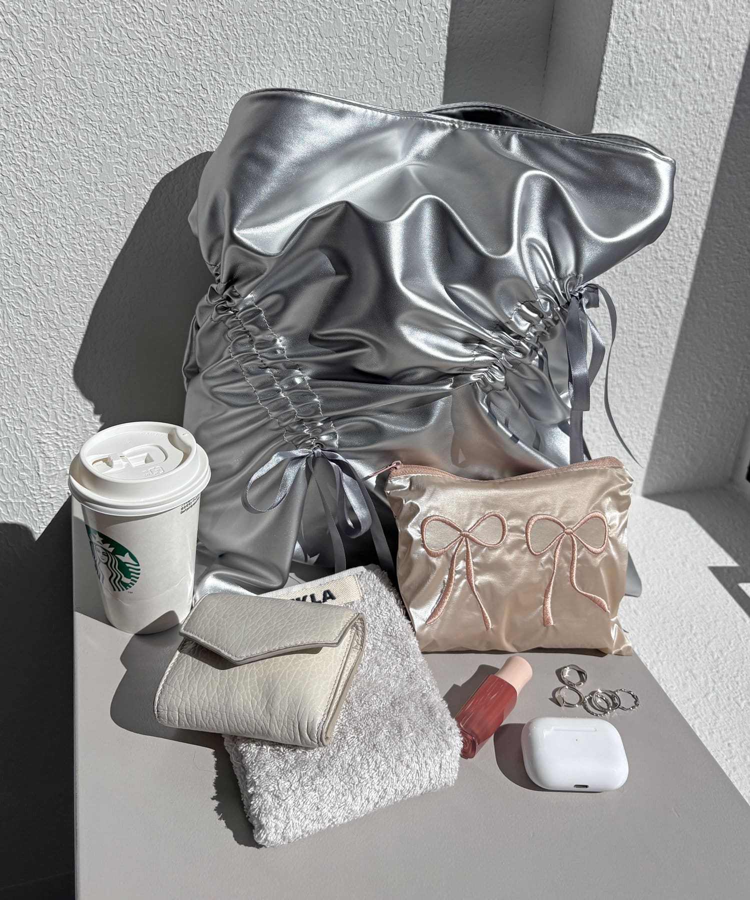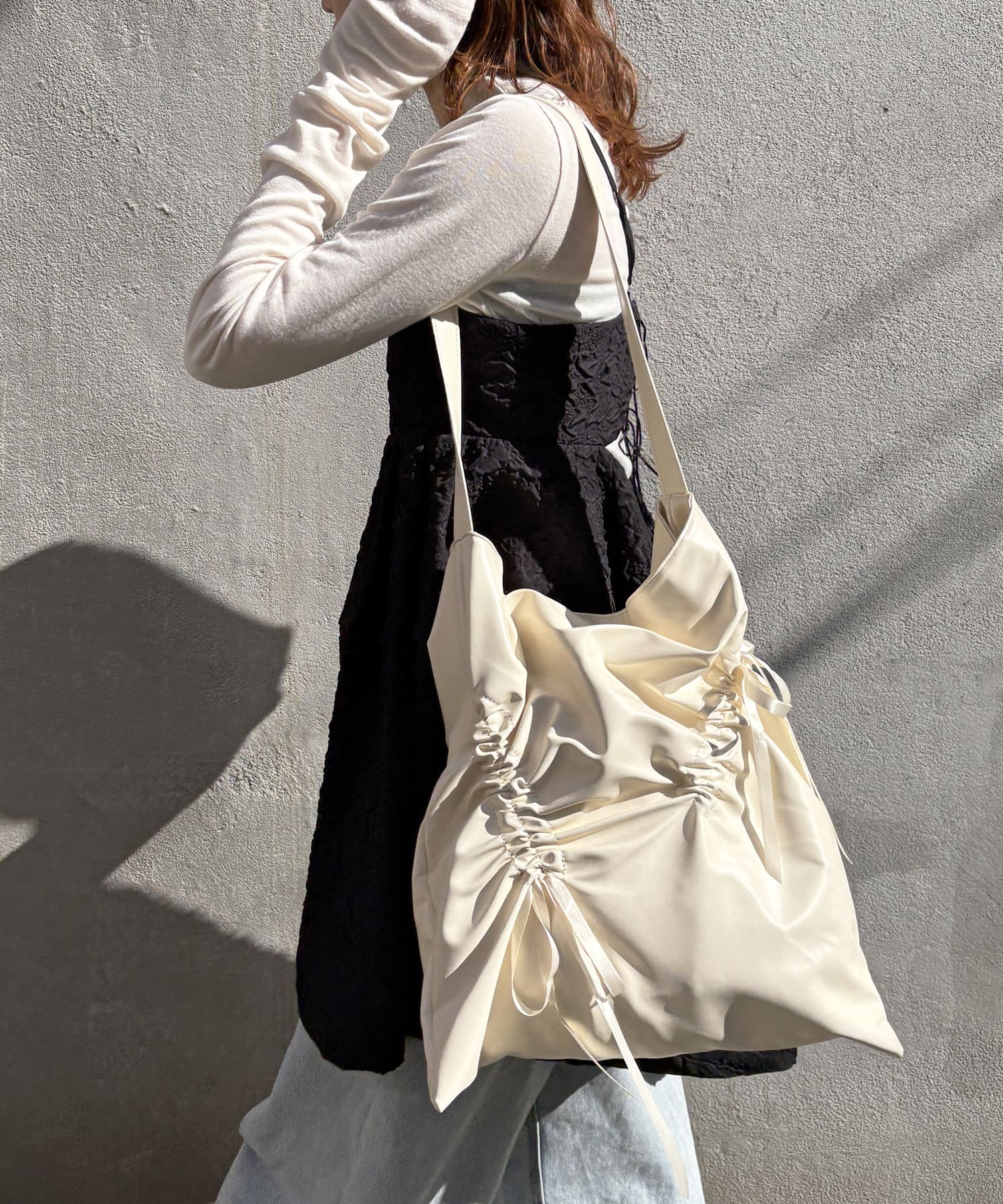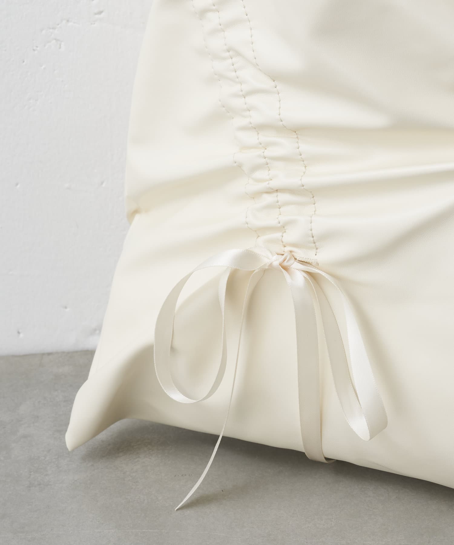 トレンドライクなリボンとギャザーのバッグ。