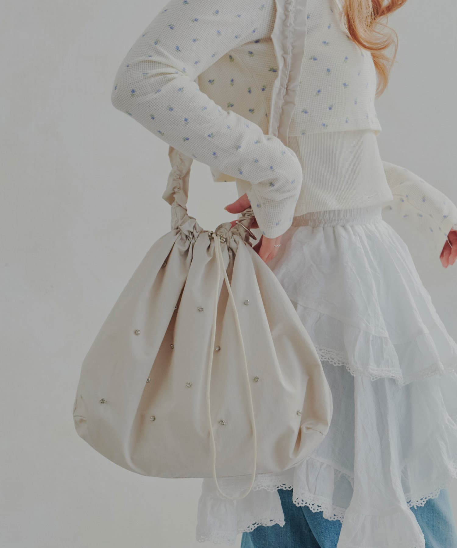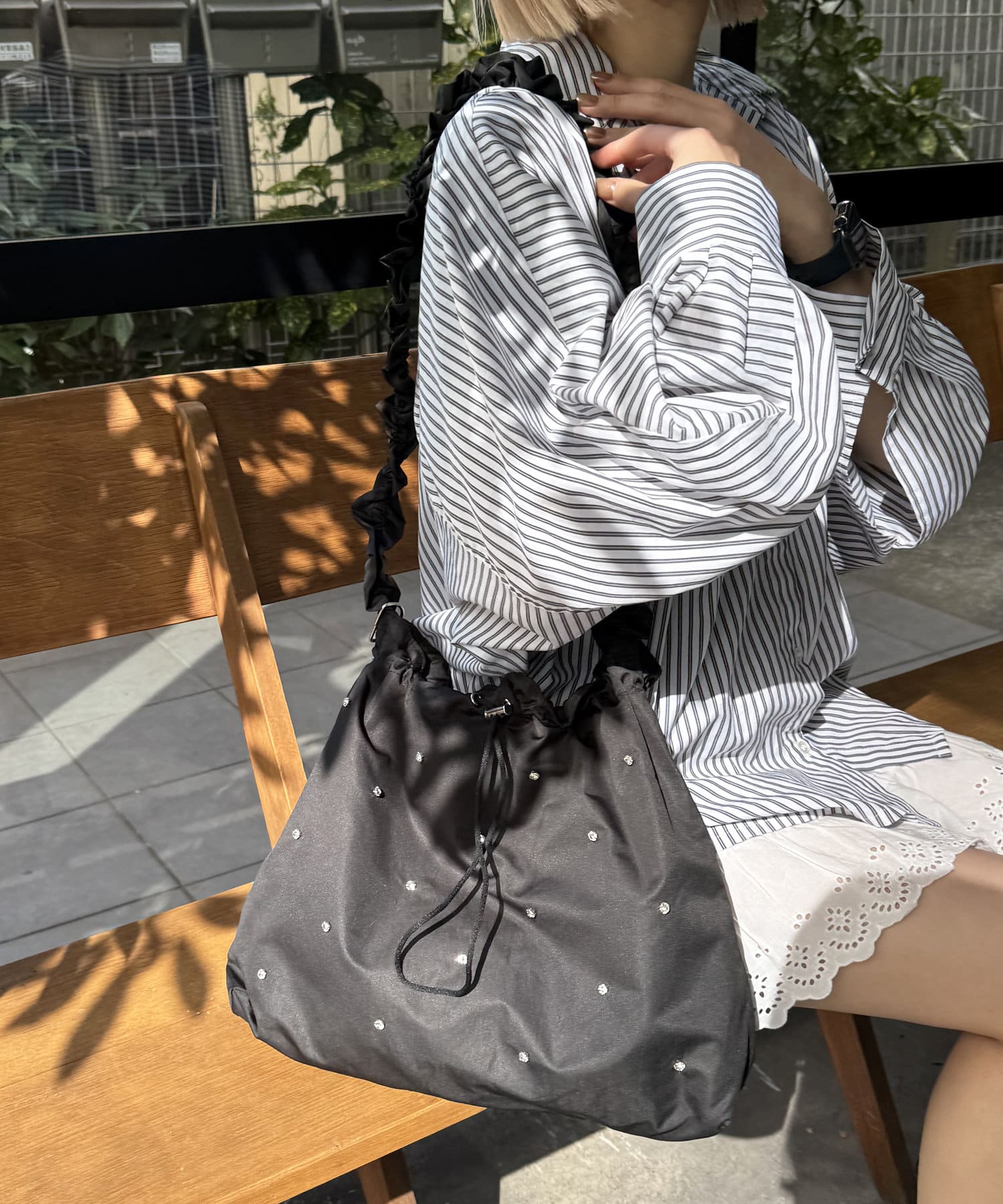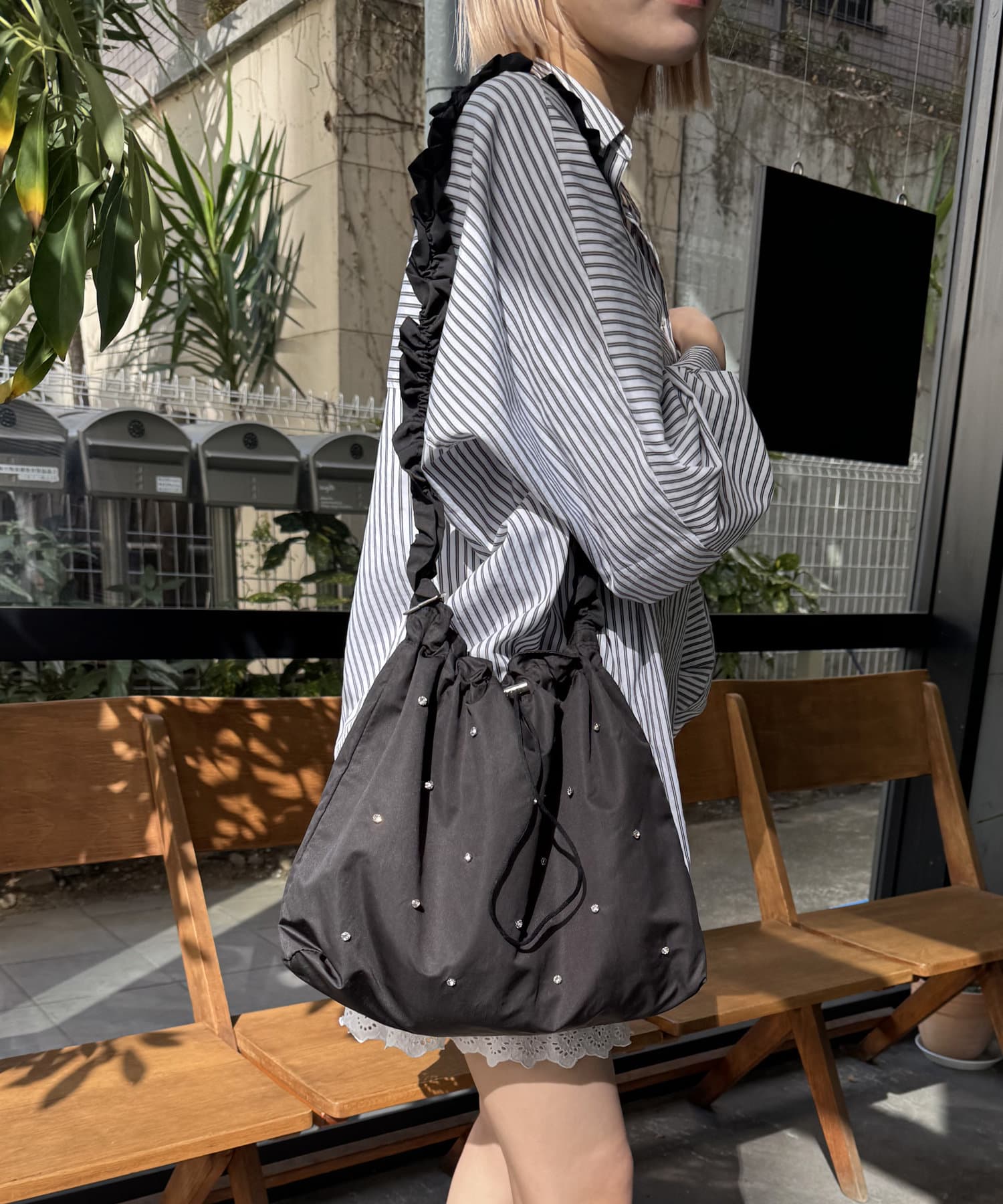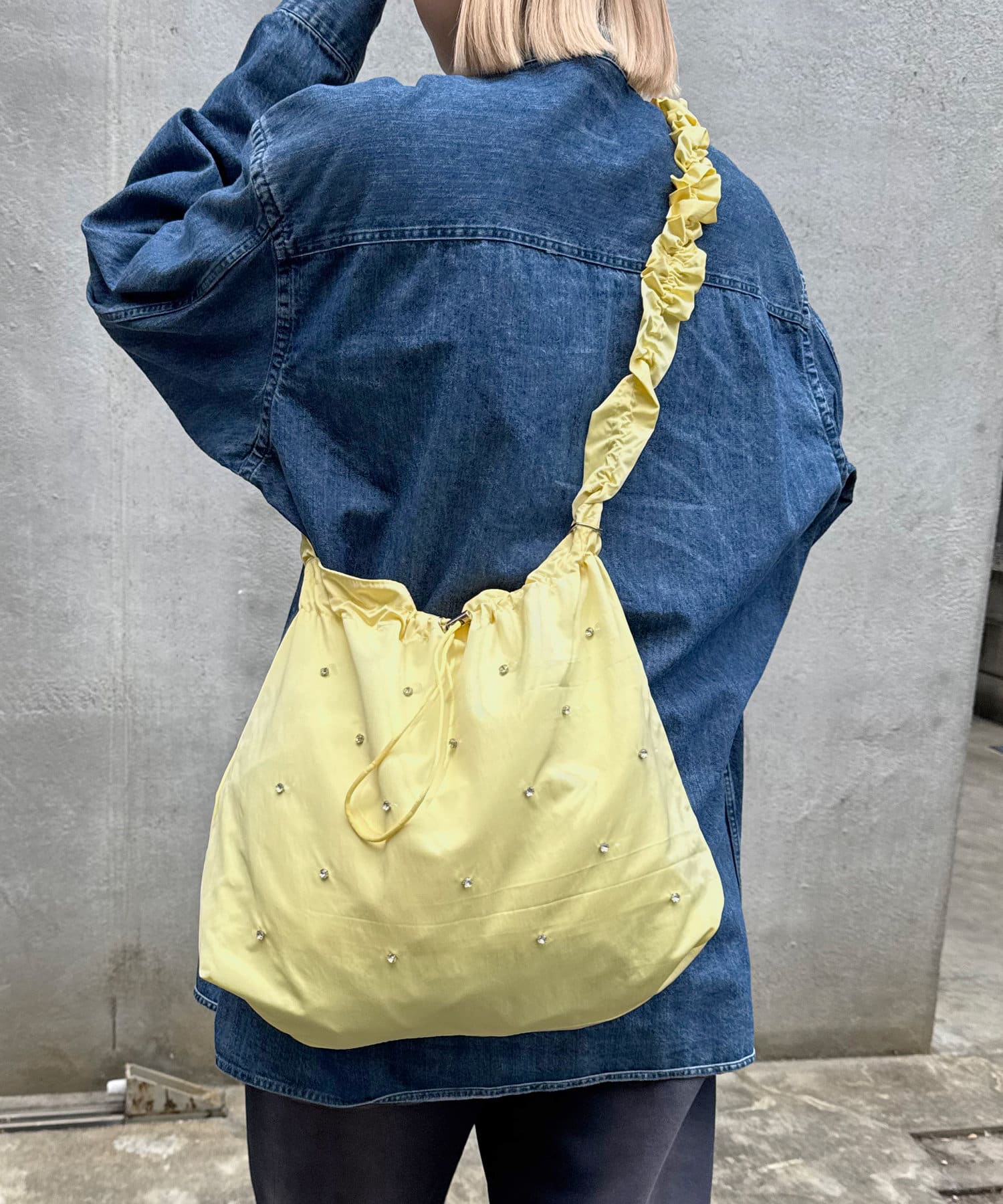 ギャザーとストーンがトレンドライクなショルダーバッグ。
