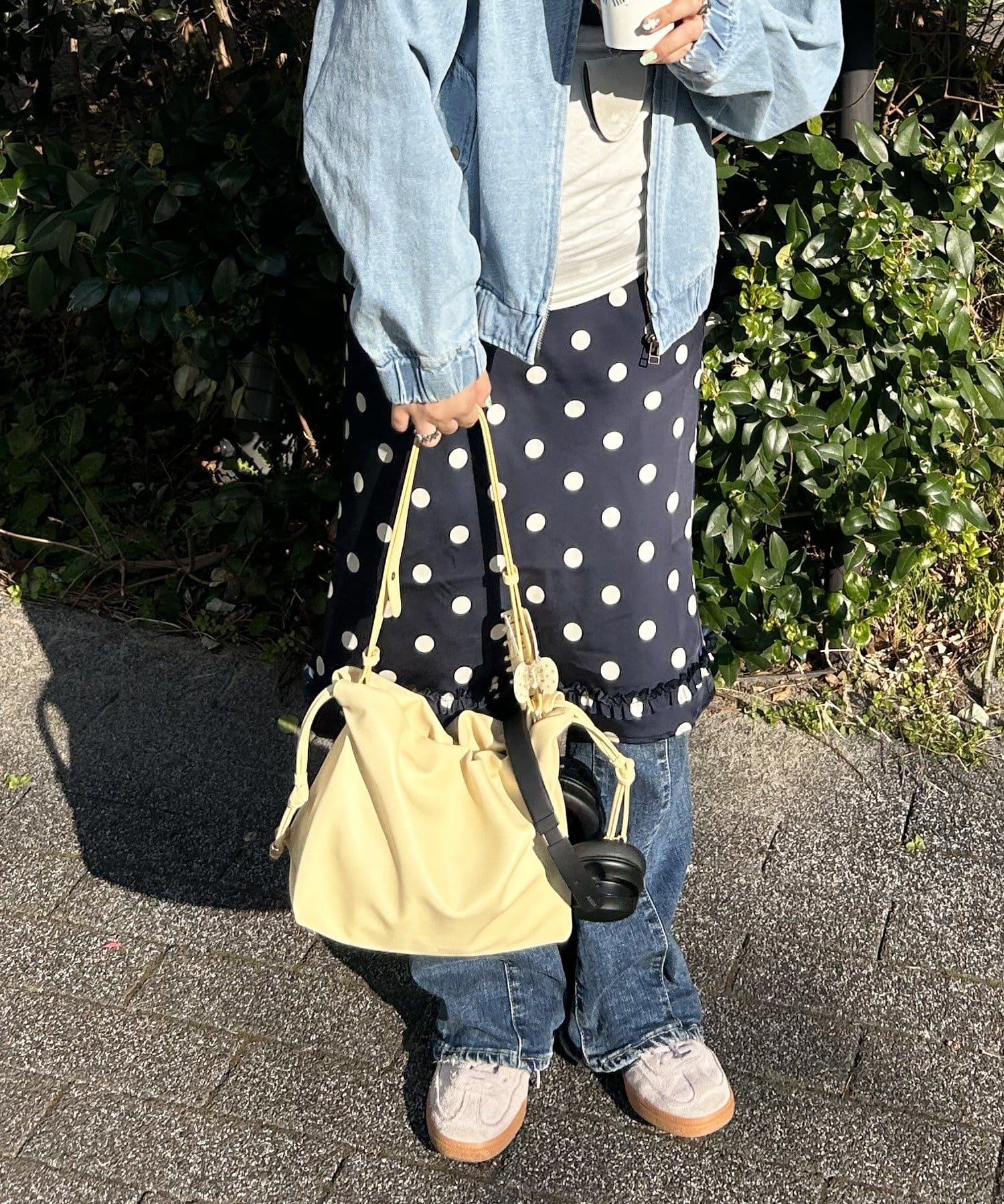 トレンド感のある巾着バッグ。