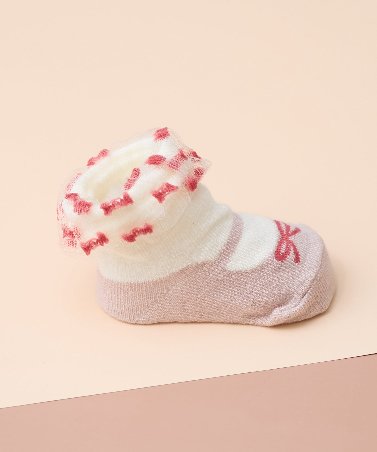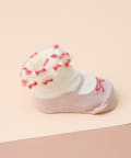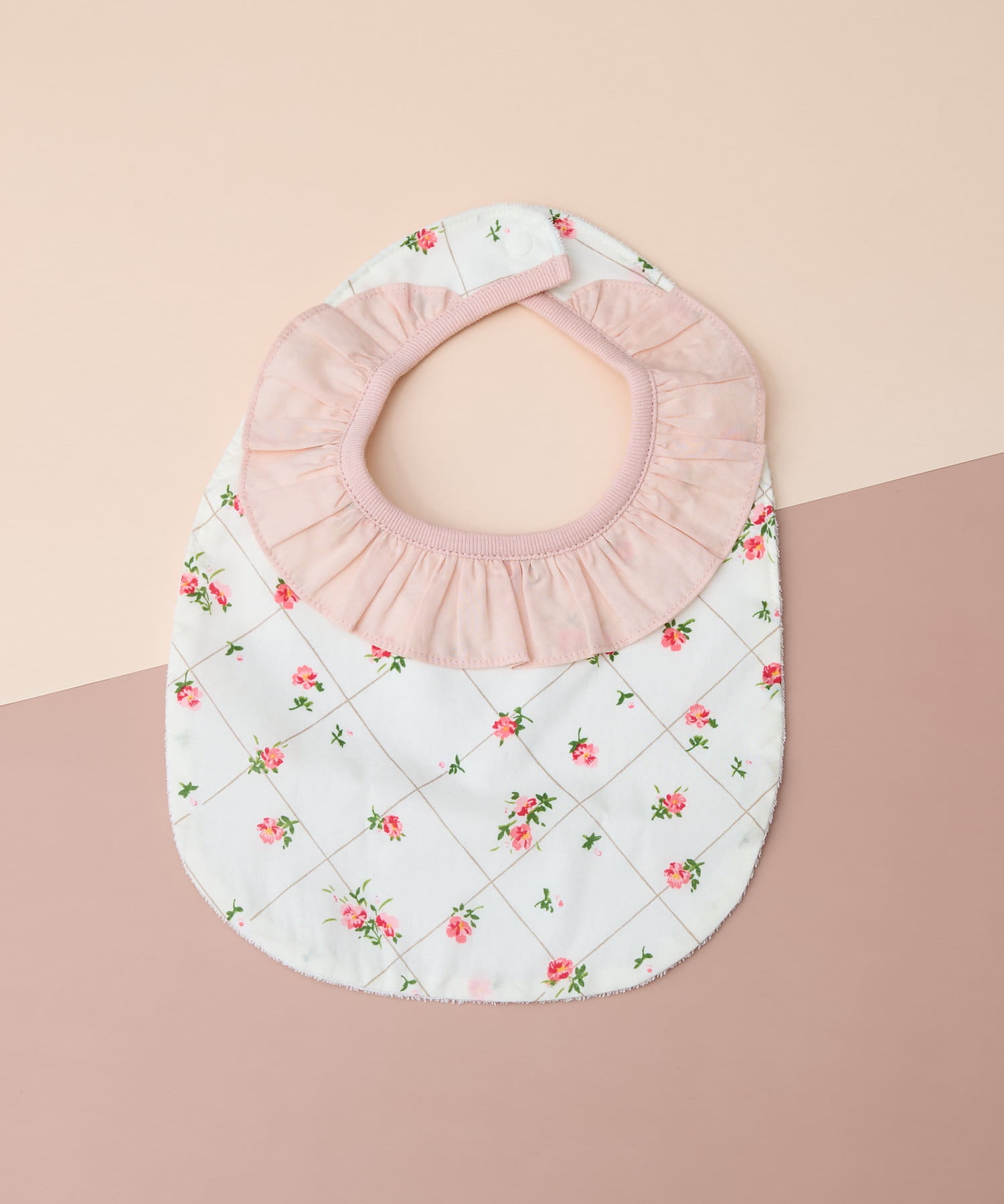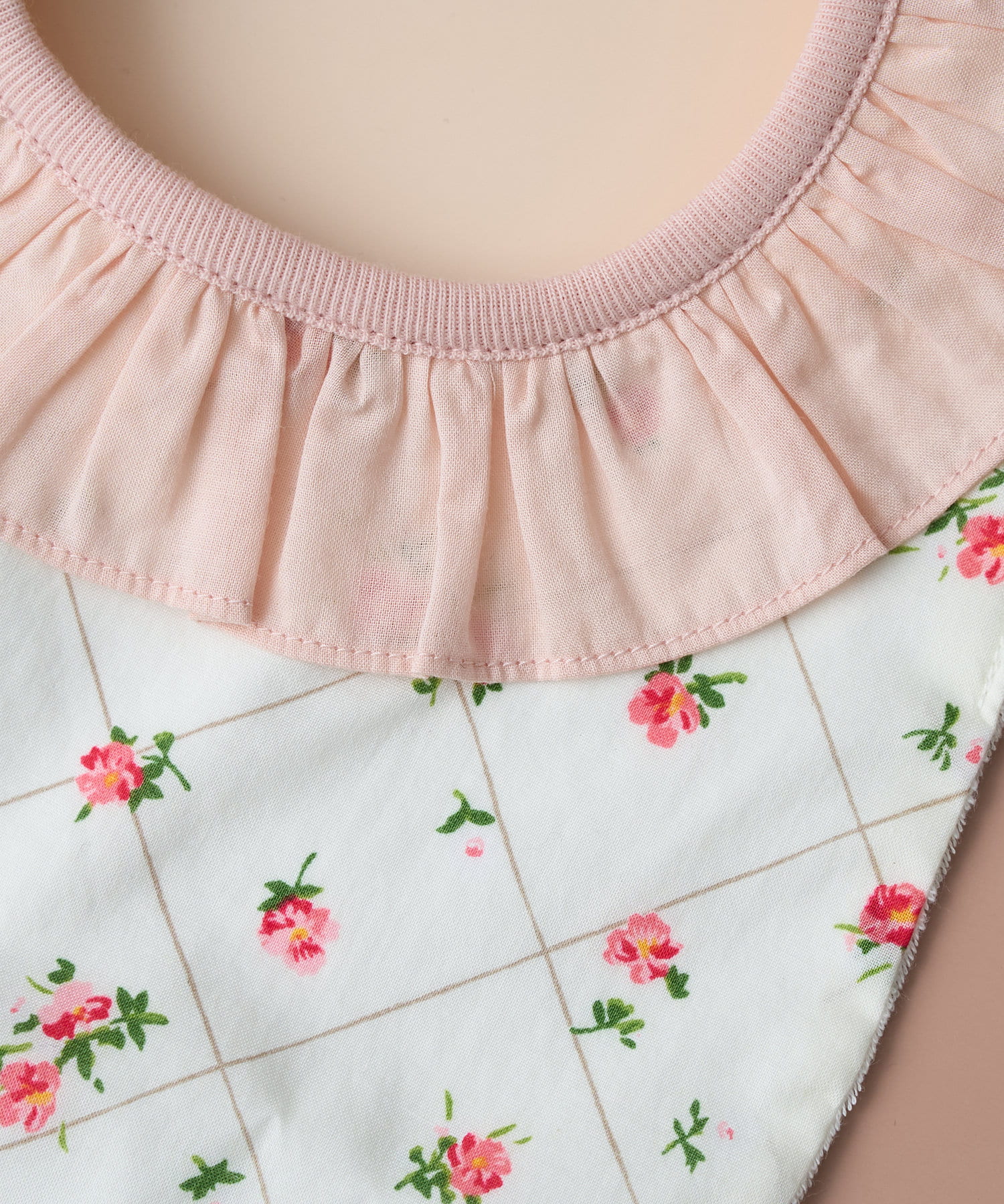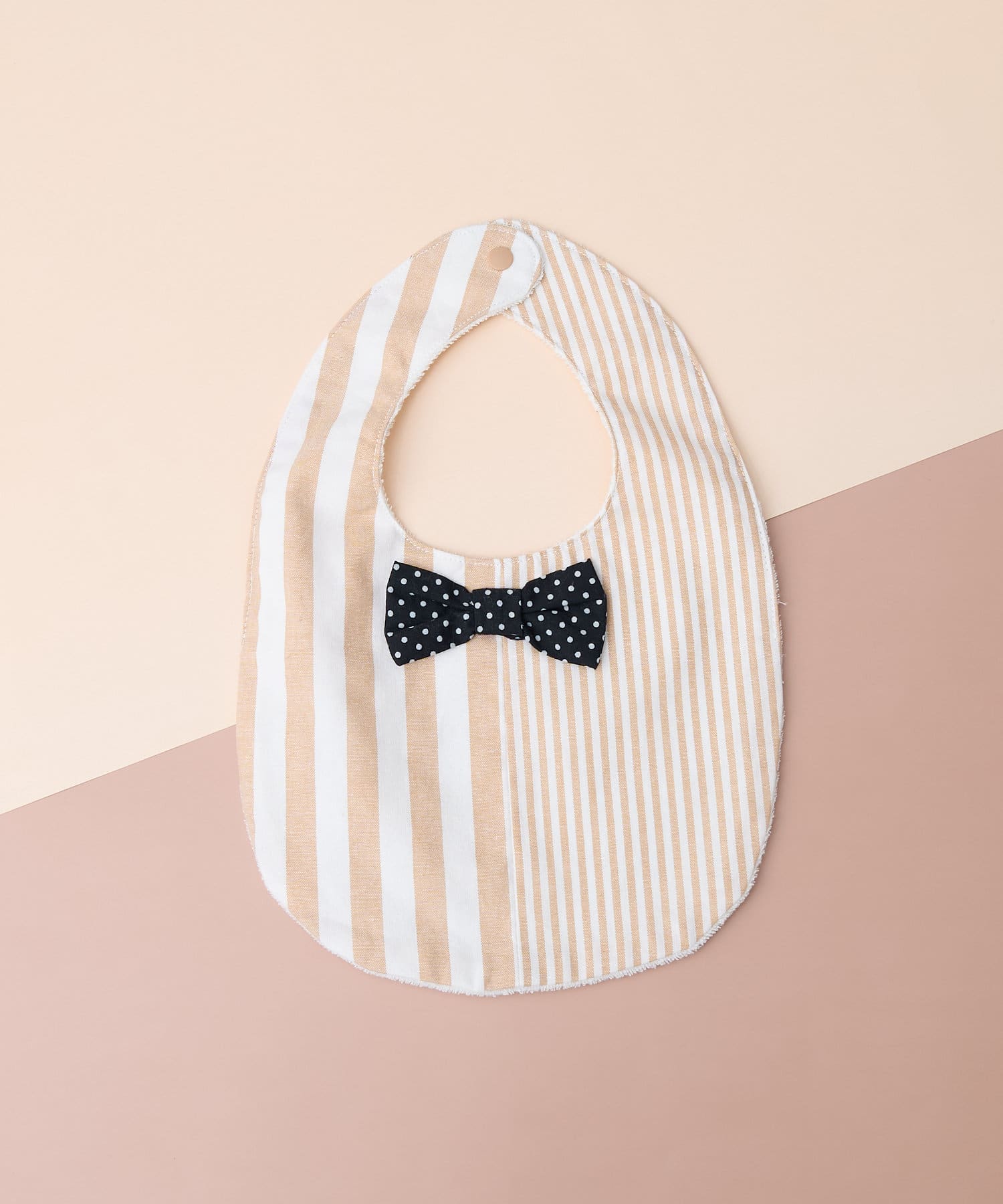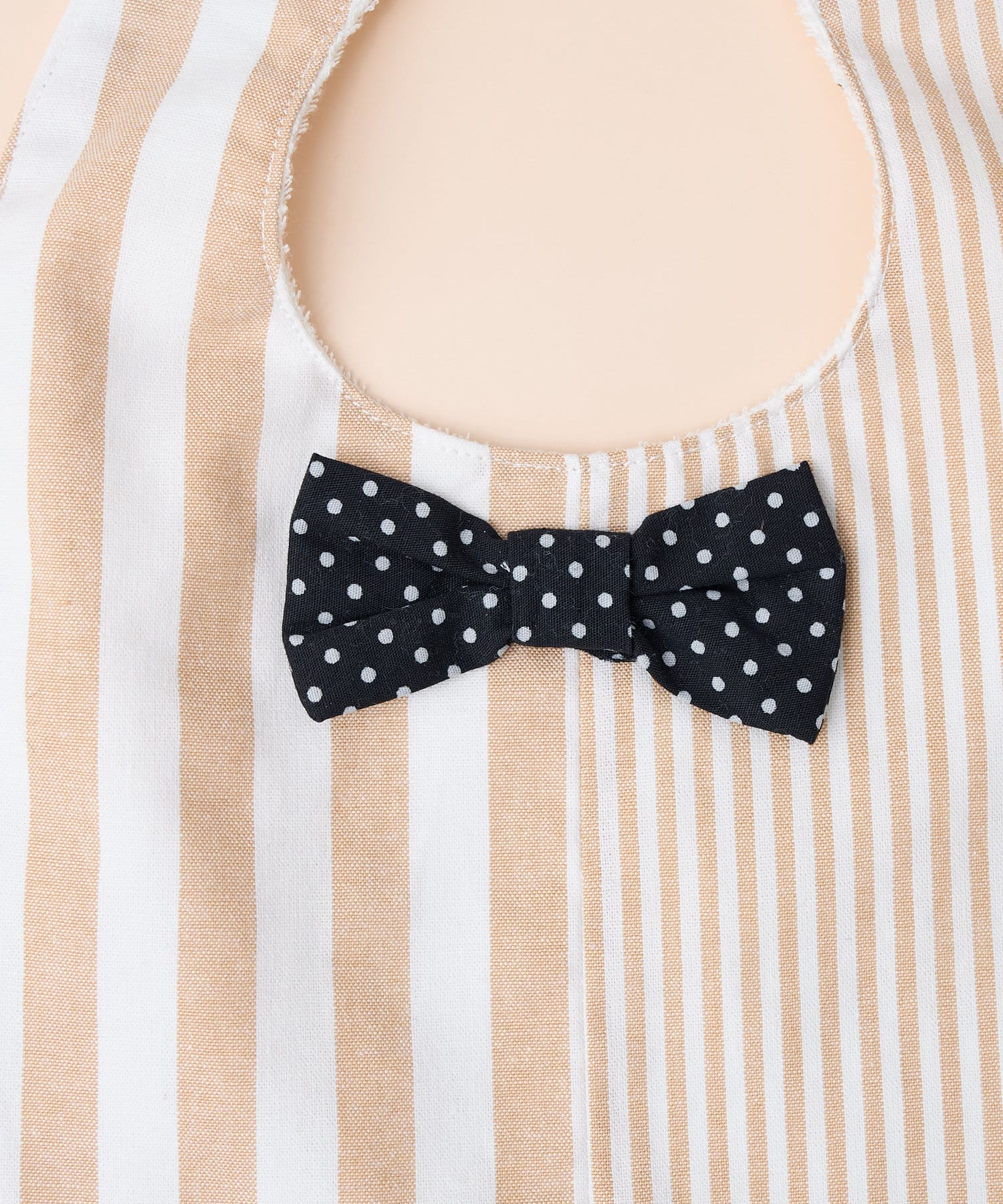 ビブのストライプ柄にはリボン、フラワー柄にはフリルをあしらい、ベビーの可愛らしさを引き立てるデザイン。スナップボタン仕様なので、着脱も楽々。ビブとソックスをセットで着用いただくと、より一層可愛らしいコーディネートが完成します。