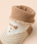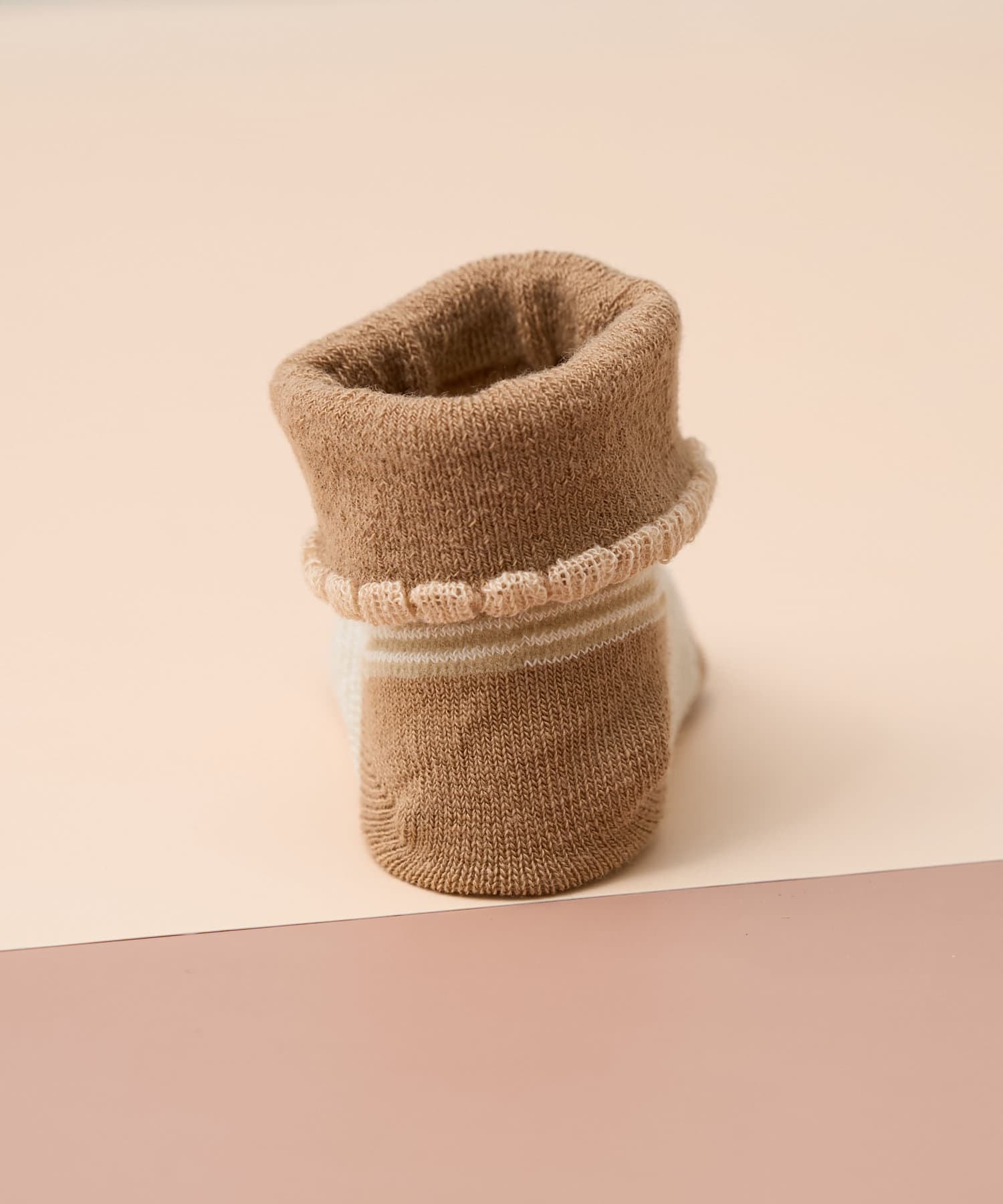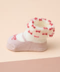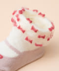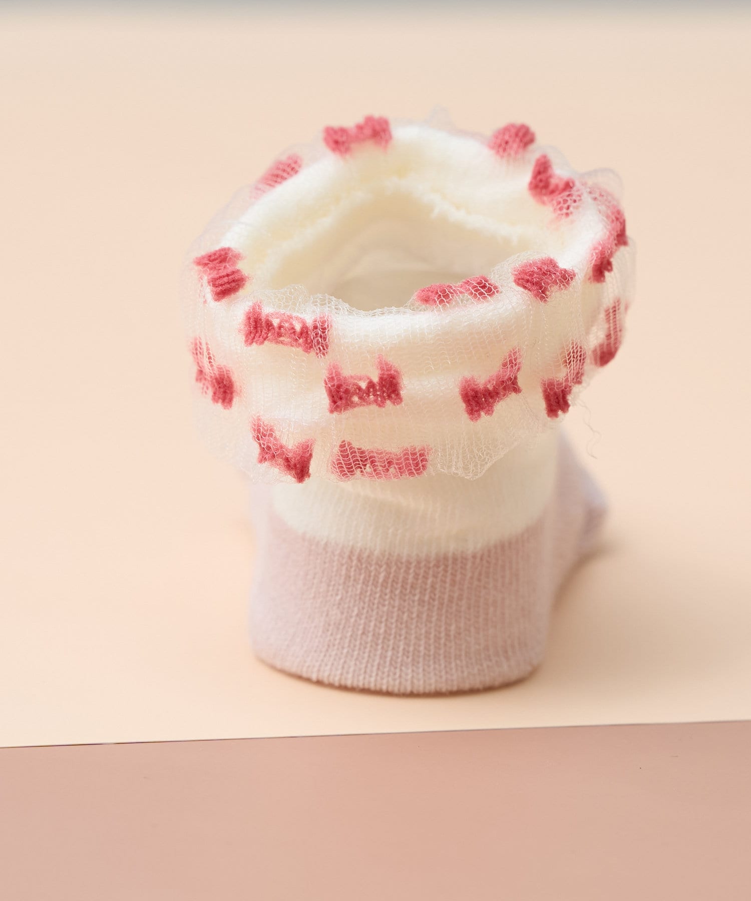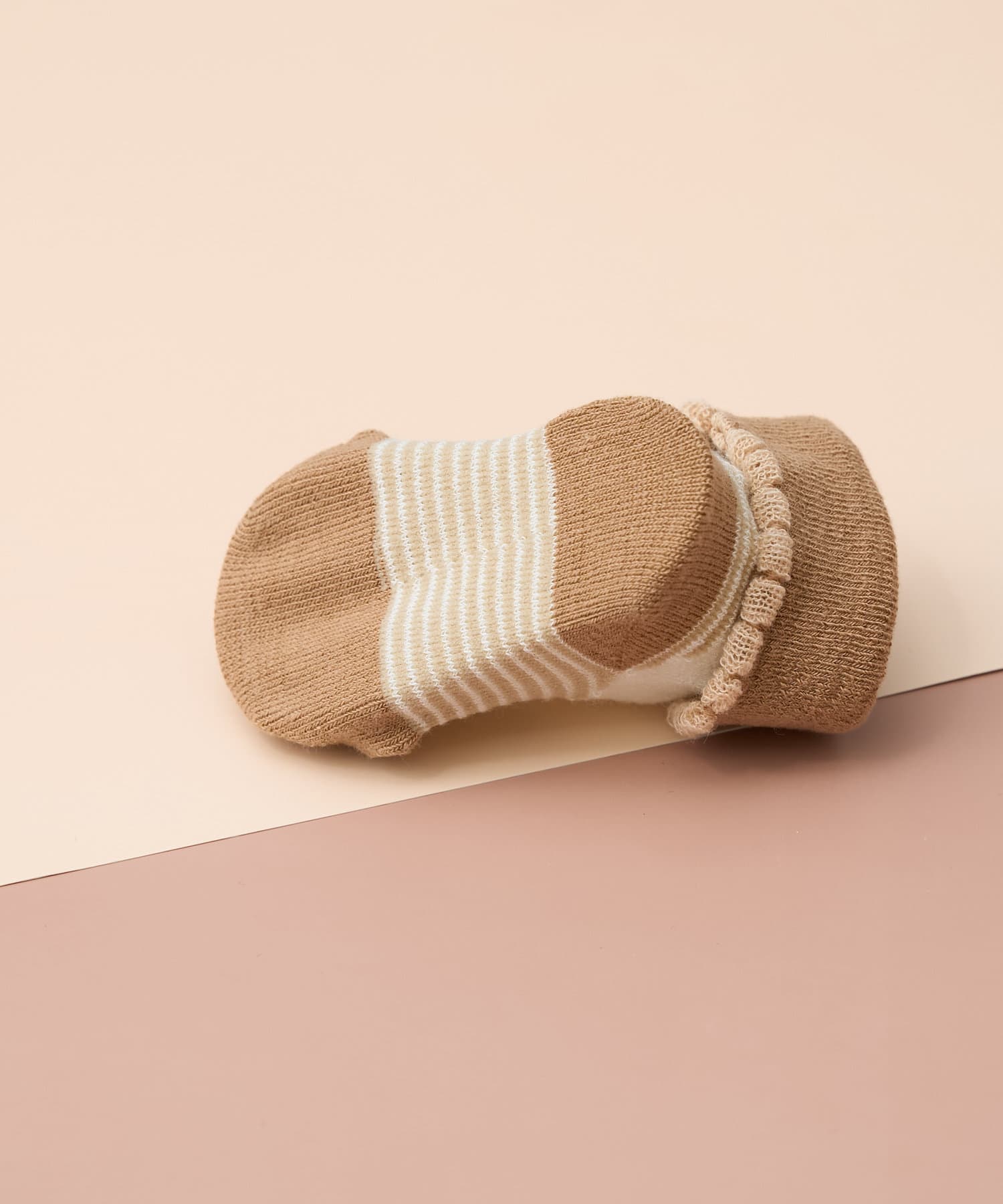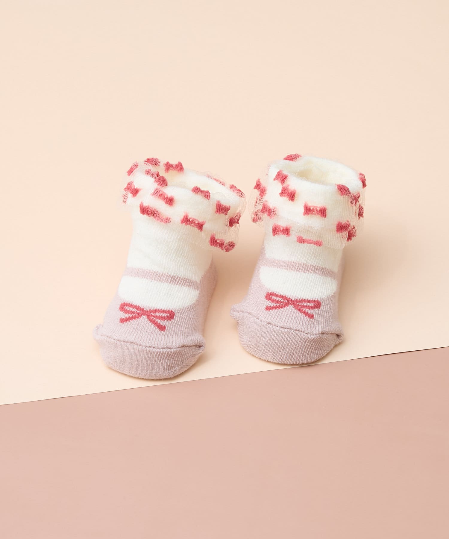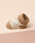 ビブのストライプ柄にはリボン、フラワー柄にはフリルをあしらい、ベビーの可愛らしさを引き立てるデザイン。スナップボタン仕様なので、着脱も楽々。ビブとソックスをセットで着用いただくと、より一層可愛らしいコーディネートが完成します。