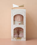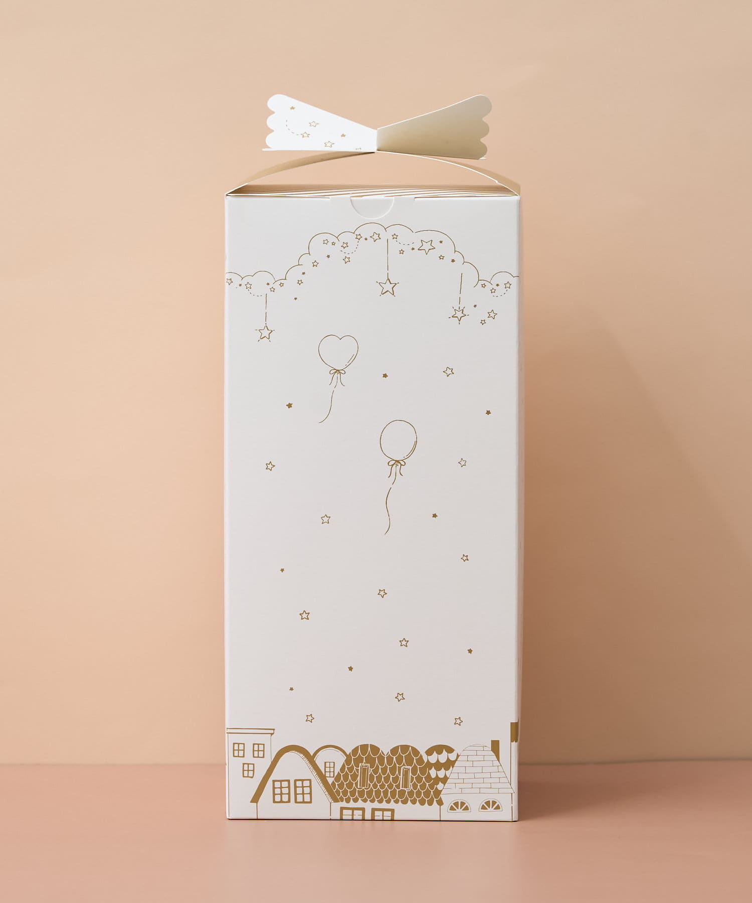 ケーキ箱のように可愛いボックスに入った、ベビーギフトや出産祝いにもおすすめしたいアイテムです。