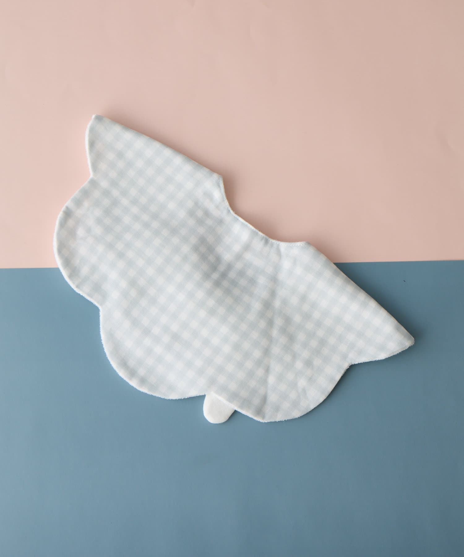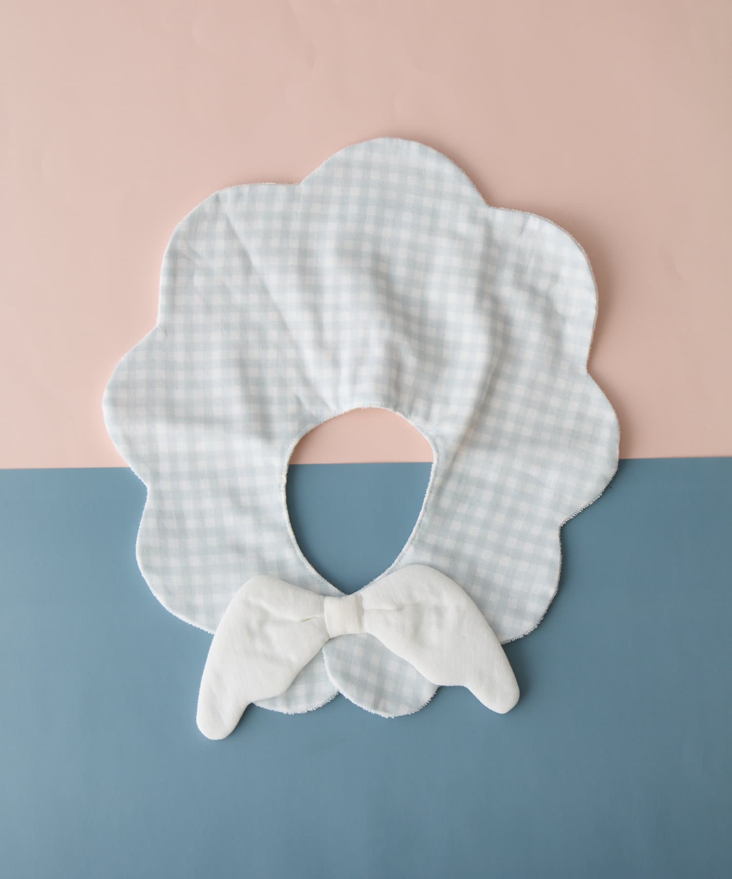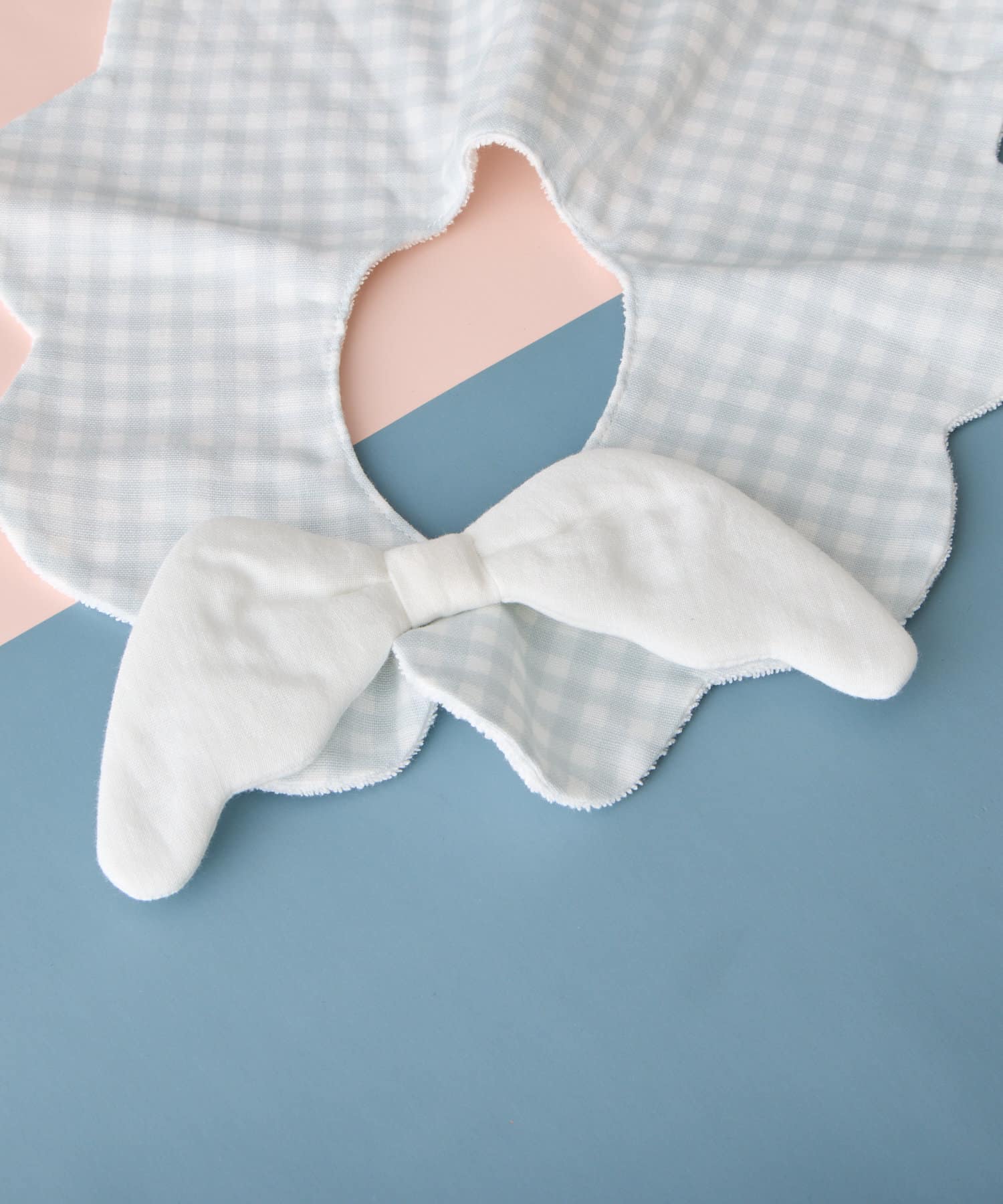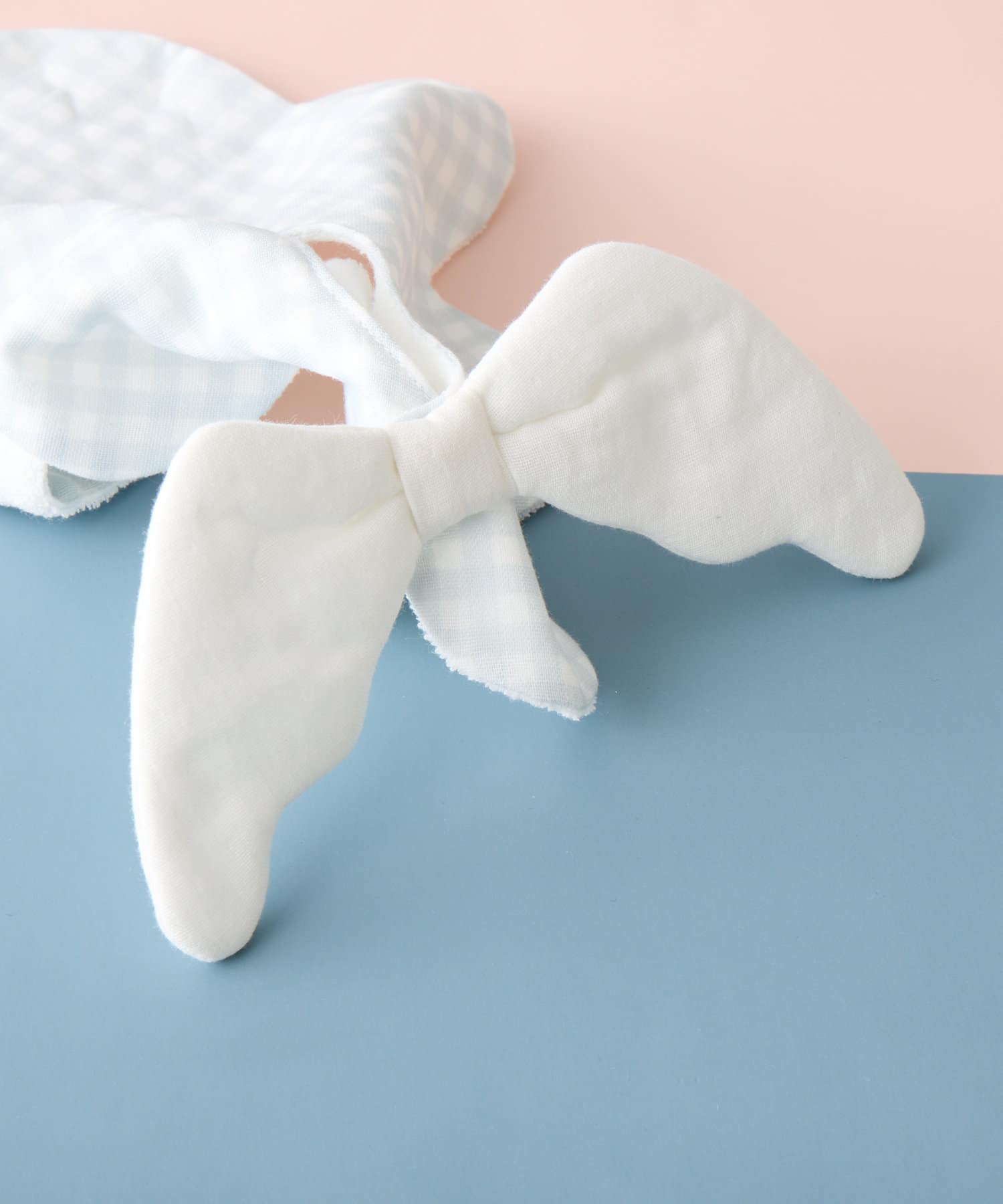背中の羽もスタイ本体も、やわらかさにこだわったダブルガーゼでお作りしました。裏地にはパイルを使用し、吸水性も抜群。