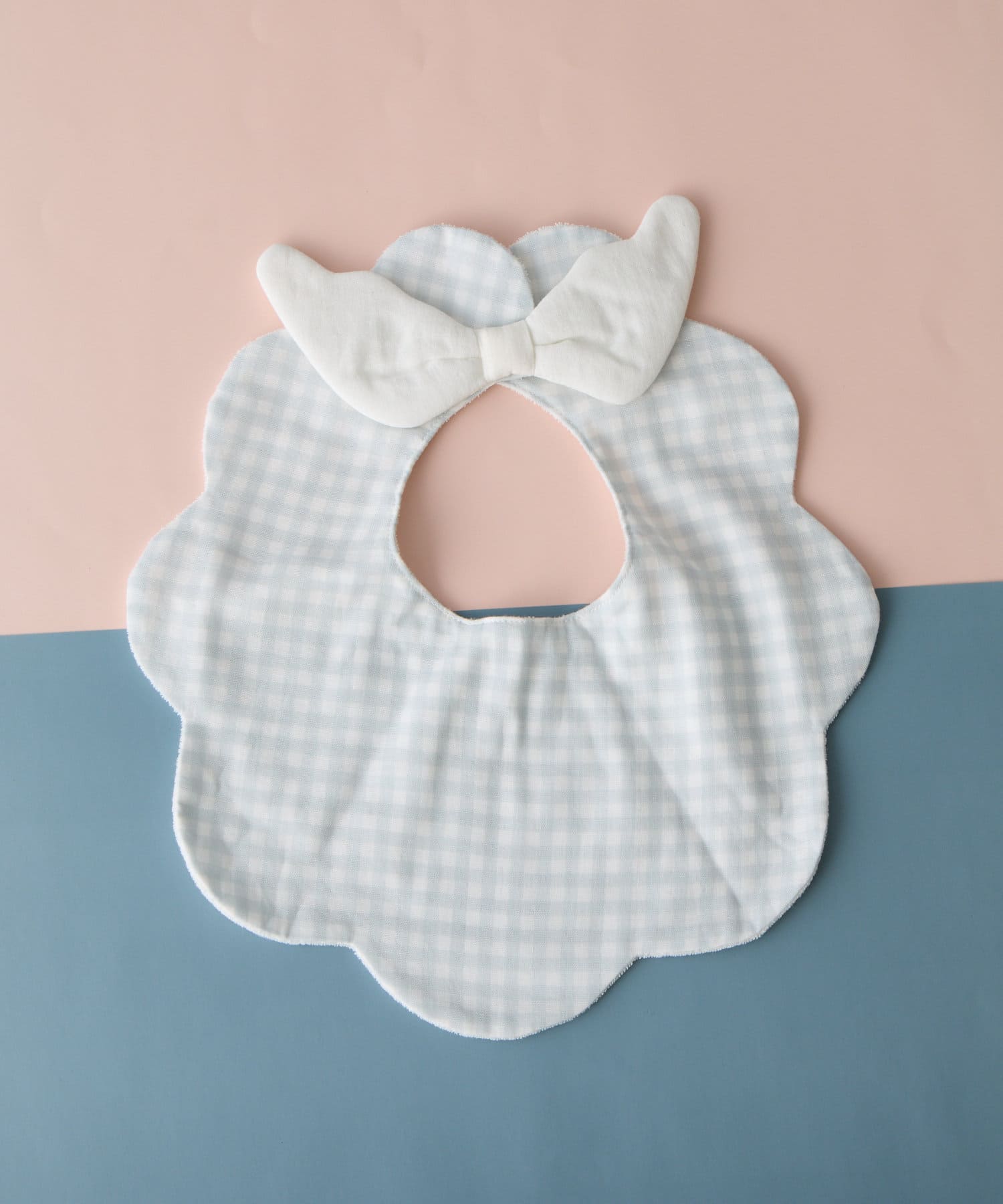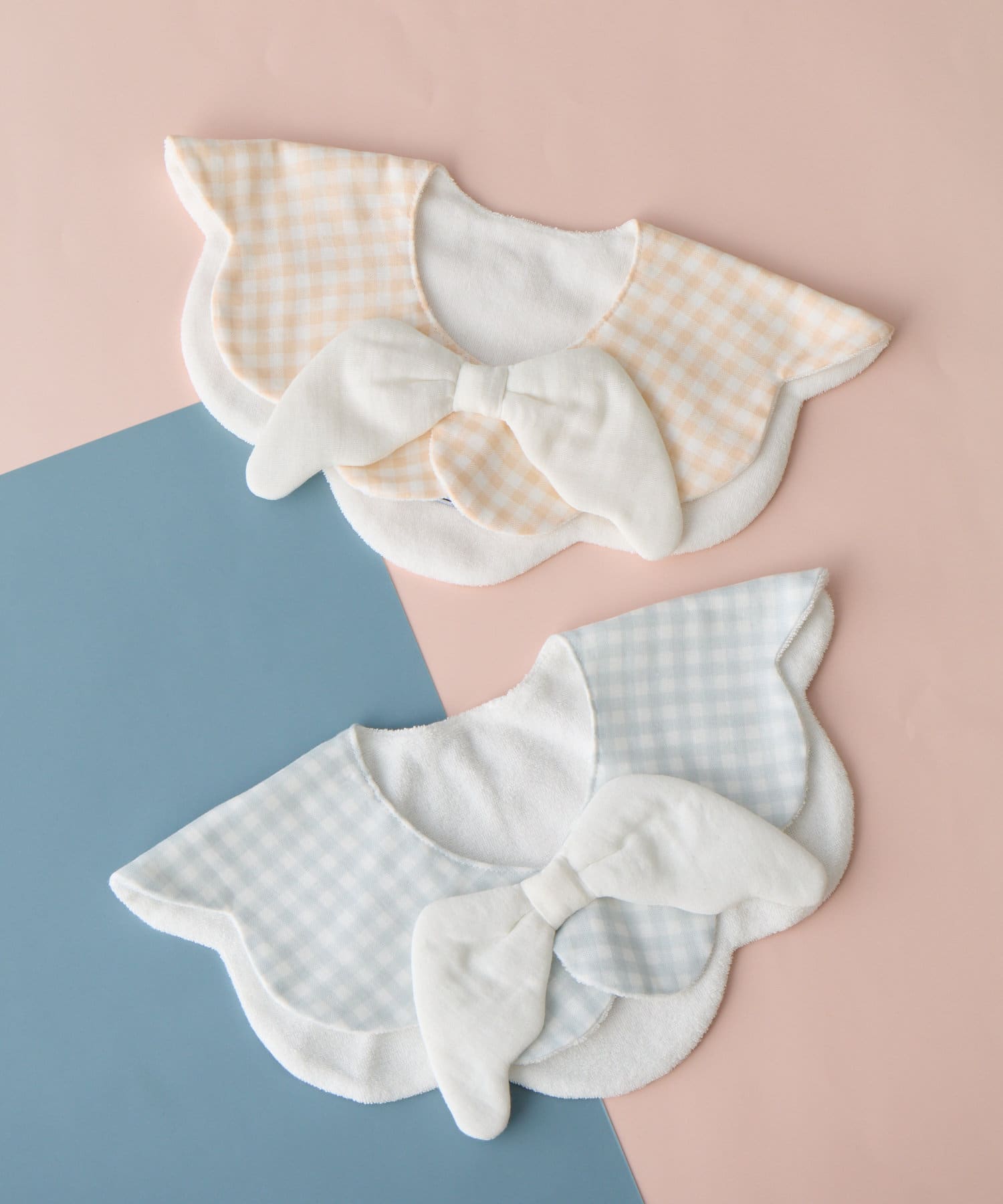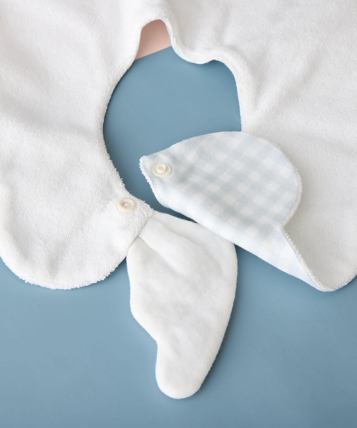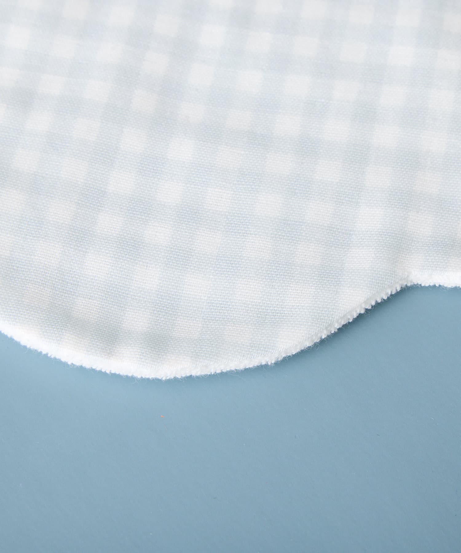 背中の羽もスタイ本体も、やわらかさにこだわったダブルガーゼでお作りしました。裏地にはパイルを使用し、吸水性も抜群。
