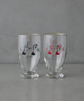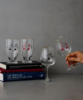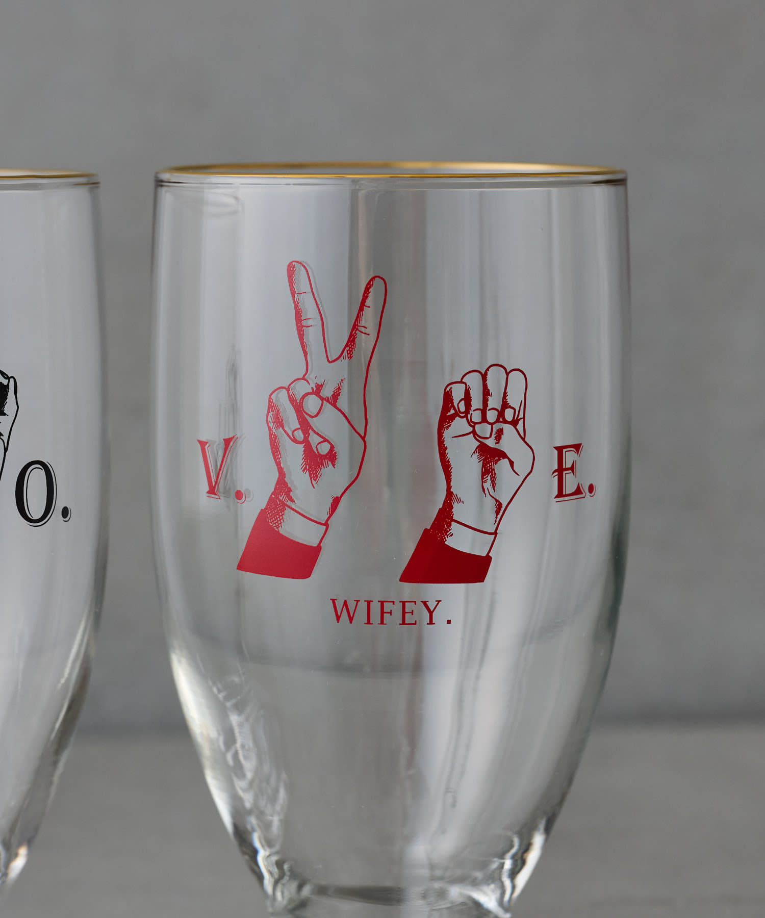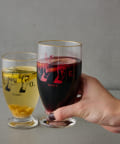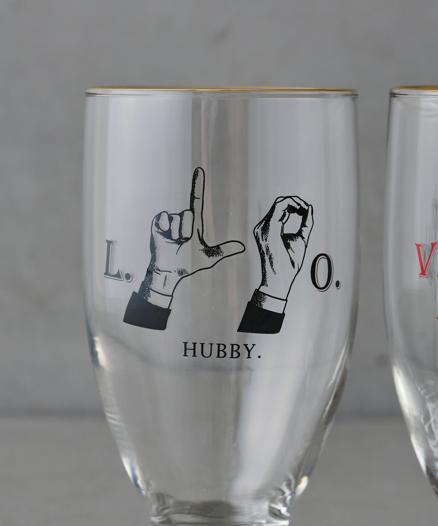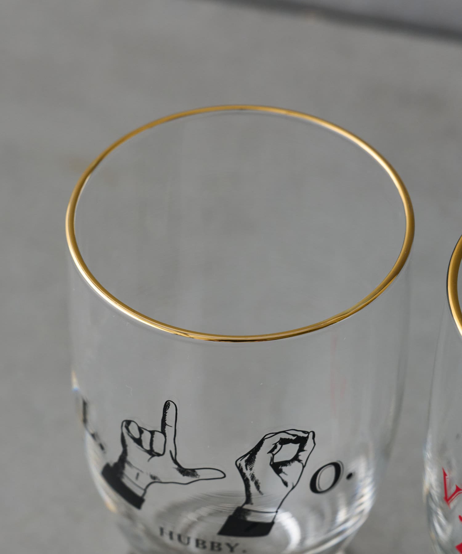 クリアなグラスにプリントされたハンドサインのイラストが目を惹くグラス。