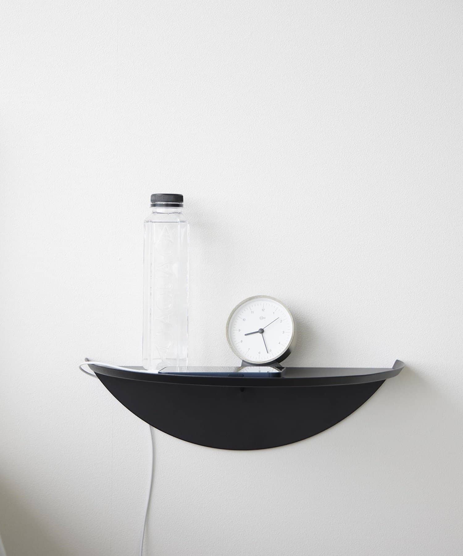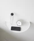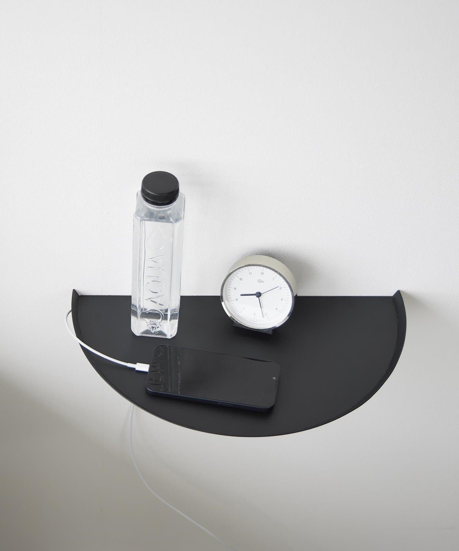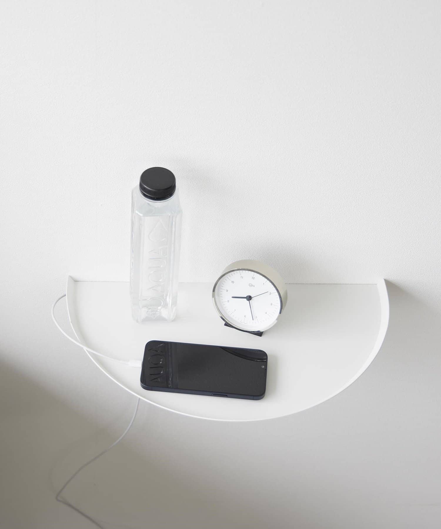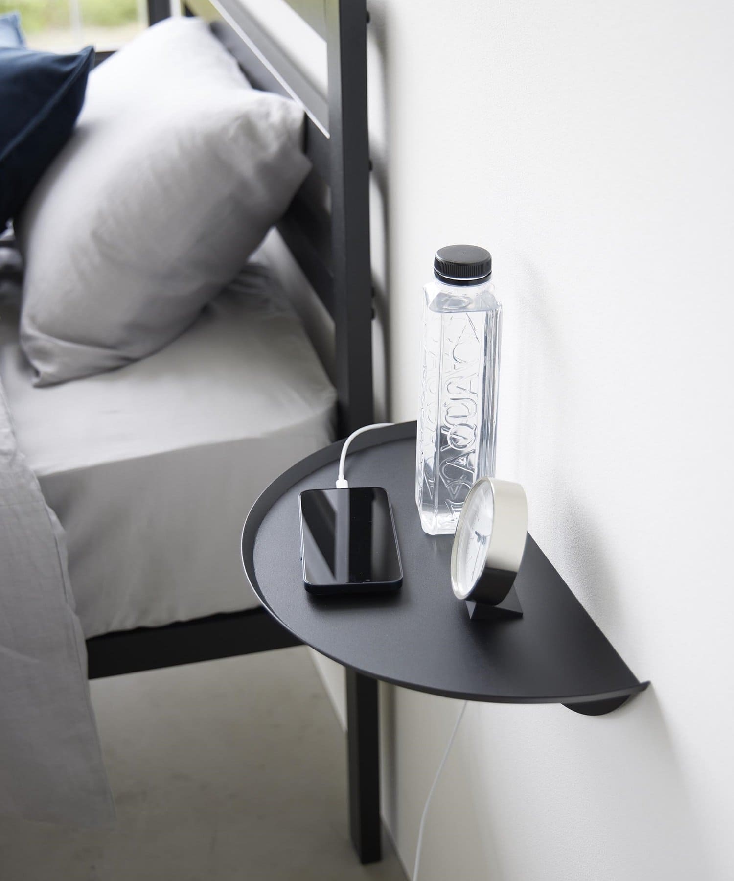 目覚まし時計やスマホ、リモコンなど様々な物が置けます。浮かせているので床のお掃除がラクラク。木ネジでも設置可能。取り付けベースを壁に取り付けて本体を差し込むだけ。