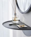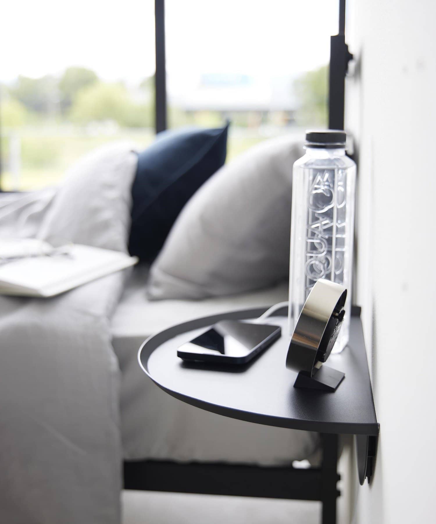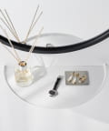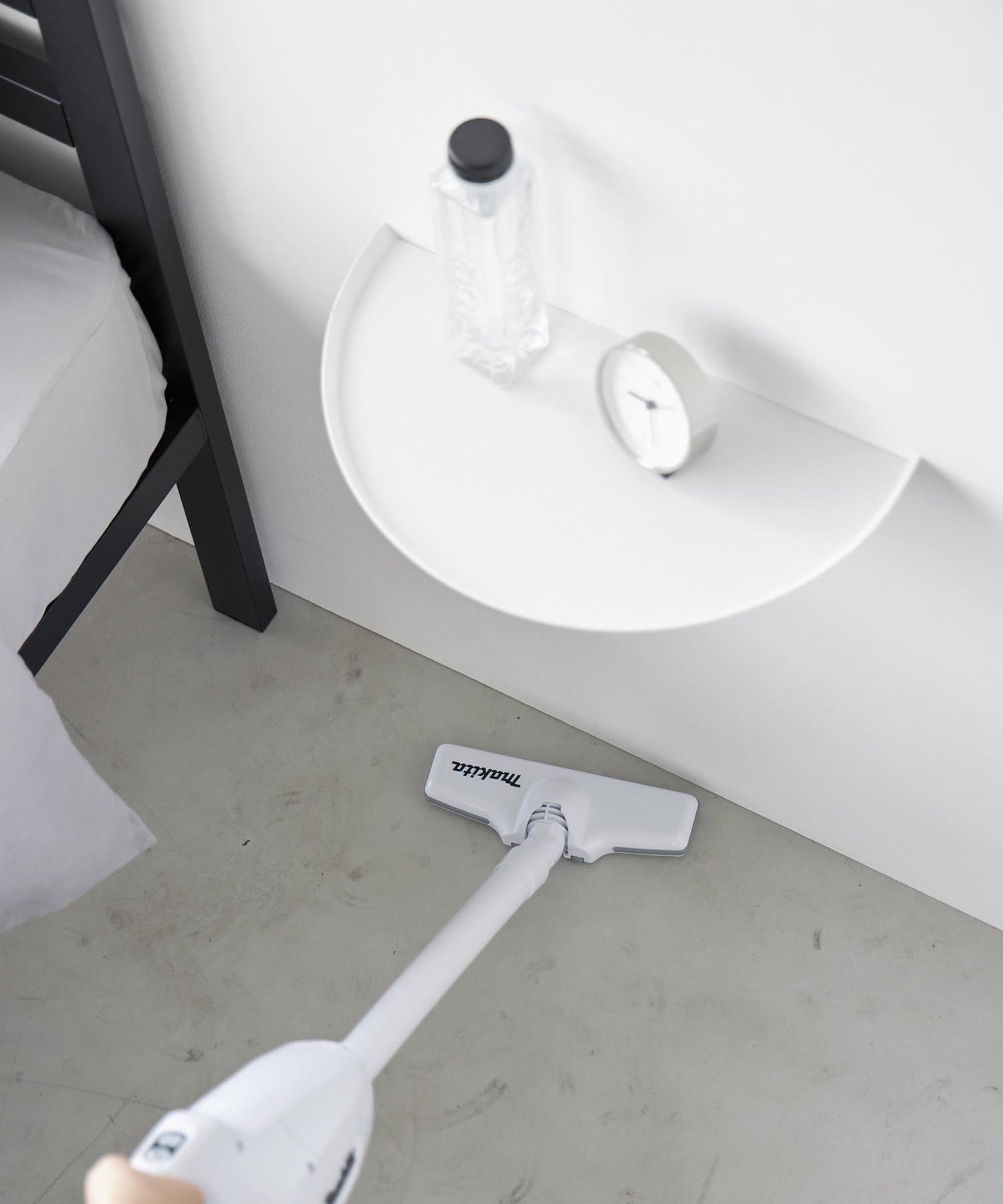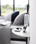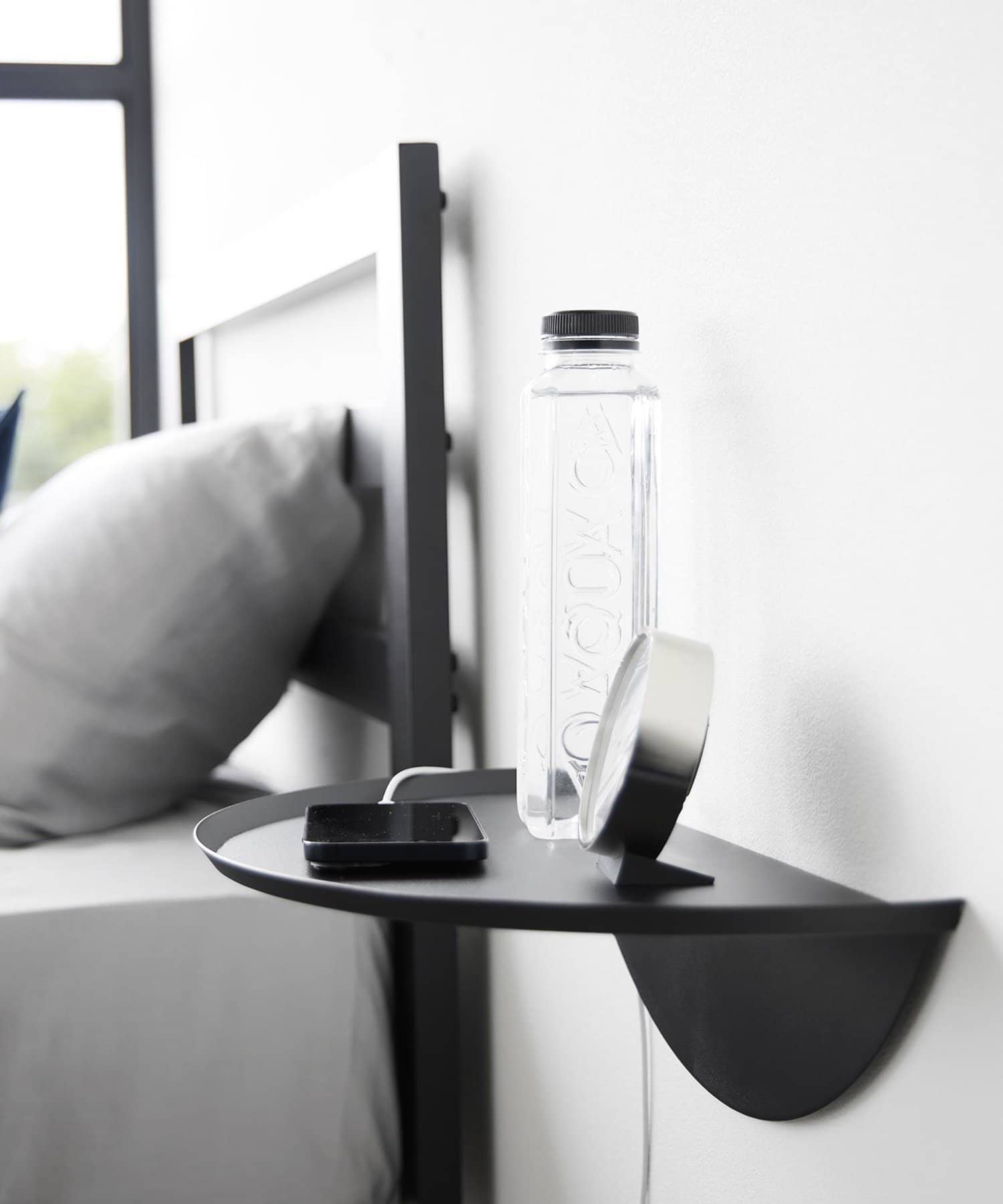 目覚まし時計やスマホ、リモコンなど様々な物が置けます。浮かせているので床のお掃除がラクラク。木ネジでも設置可能。取り付けベースを壁に取り付けて本体を差し込むだけ。