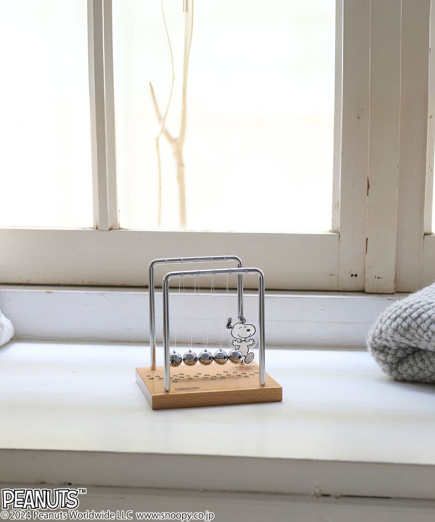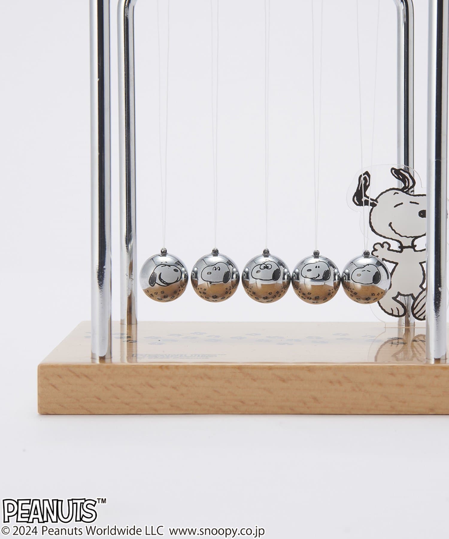 シルバーメタリックとナチュラルウッドの異素材の組合せが、洗練したお洒落なムードを演出する物理系インテリア。同じ重さの複数の金属の玉を吊るし、片端の玉をぶつけると逆側の玉のみ揺れる…という有名なアイザック・ニュートンの法則を元にした"実験装置"ながら、シンプルでユニークな動きは大人からお子様まで楽しめます。金属の玉にはそれぞれ様々な表情のスヌーピーが描かれているのもキュート。プレゼントにもおすすめです。