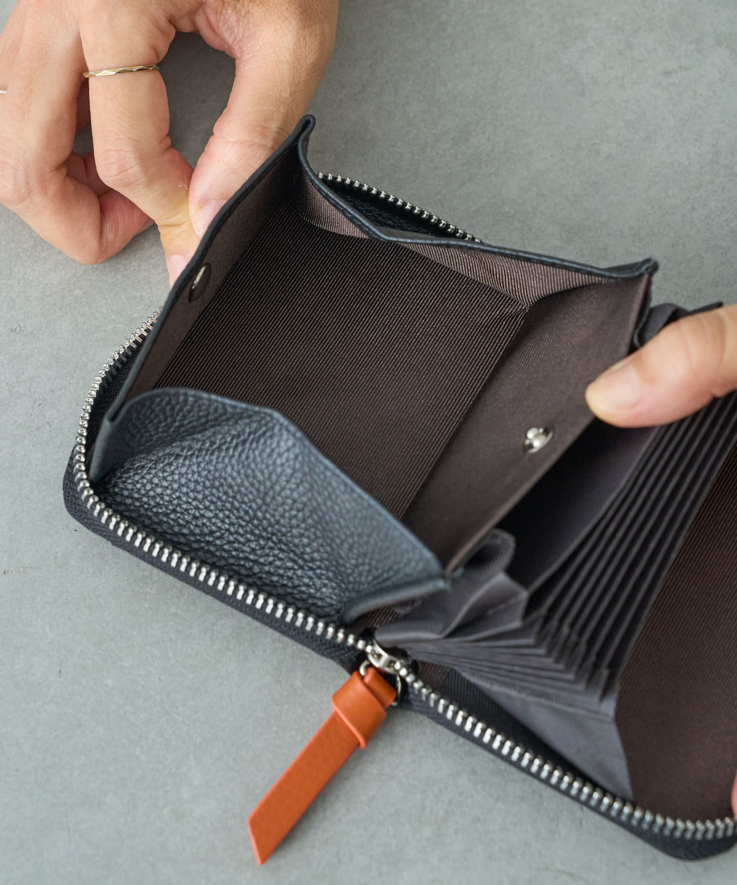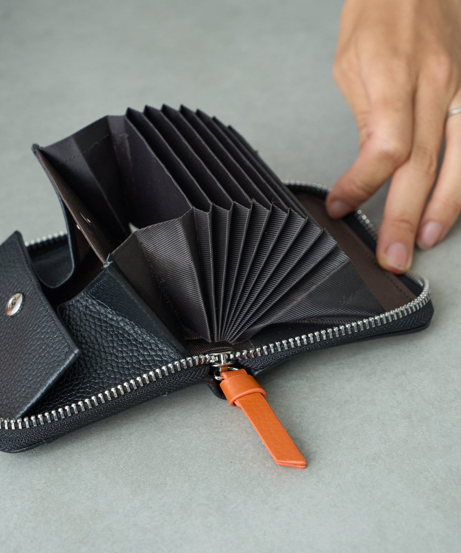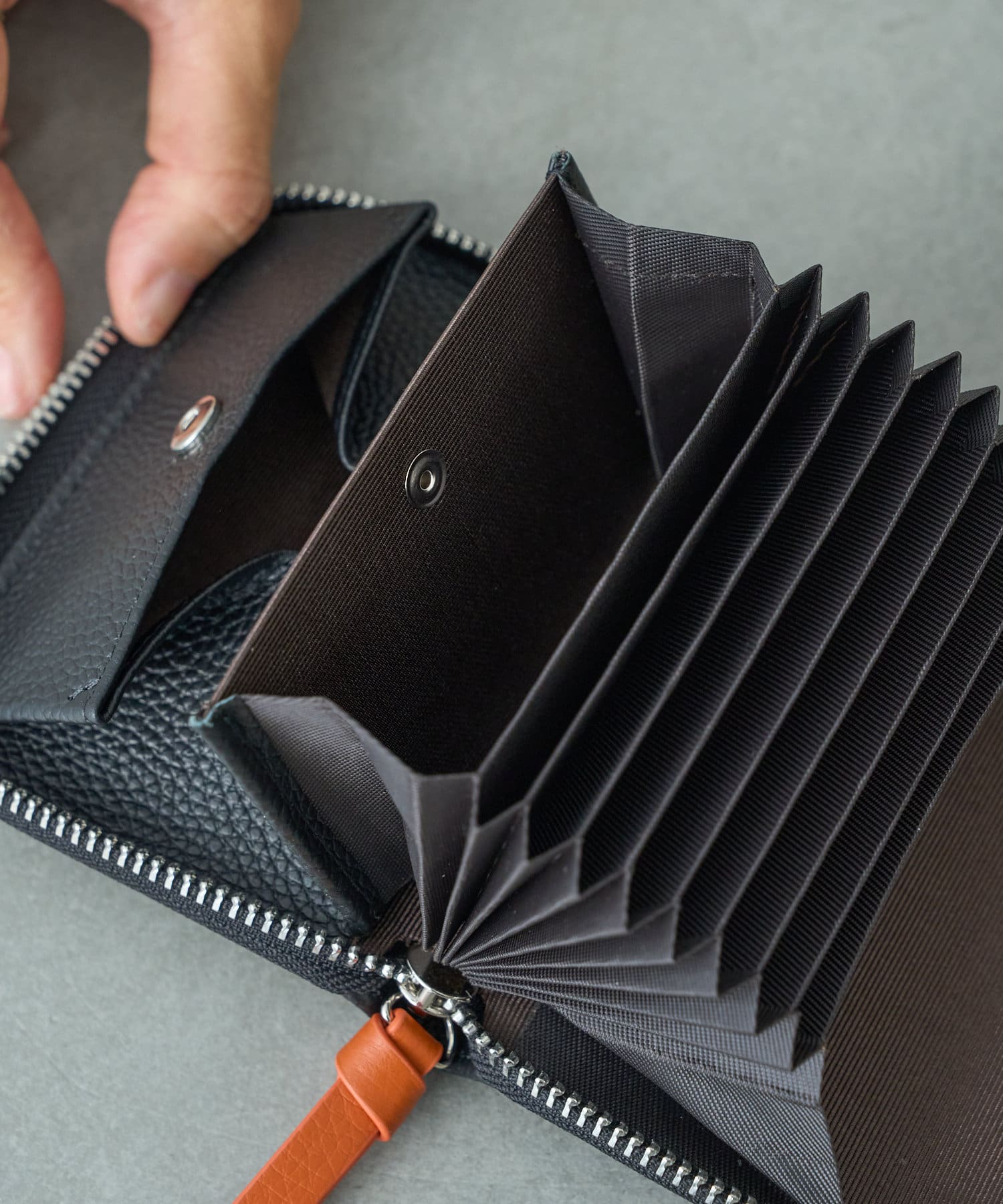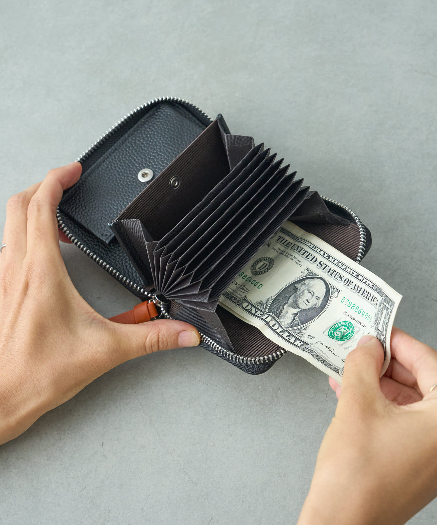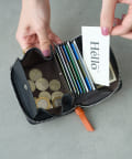 最大の魅力は、お札を折ることなく、スムーズにお札を収納することができ、取り出しも楽々な点。カードポケットも充実しており、全部で9ヵ所のポケット数。1番左のポケットはやや広めに設計しているので、複数のレシートや名刺類を入れるのも◎。ジャバラタイプなので、カードが見やすくスッと取り出しやすいのが特徴です。小銭入れも大きく開くタイプで、小さな小銭もスムーズに取り出すことができます。フロントにもポケットがあるので、よく使うICカードを入れておくのがおすすめ。ショップで人気のバイカラーにデザインを施し、見た目にもこだわりました。中は濃色なので汚れも気になりません。