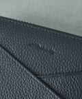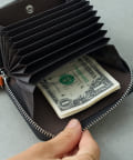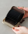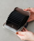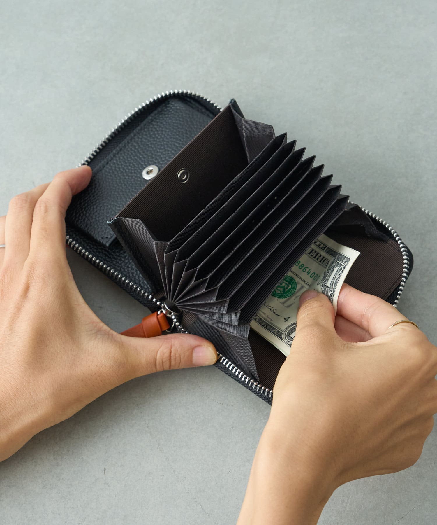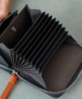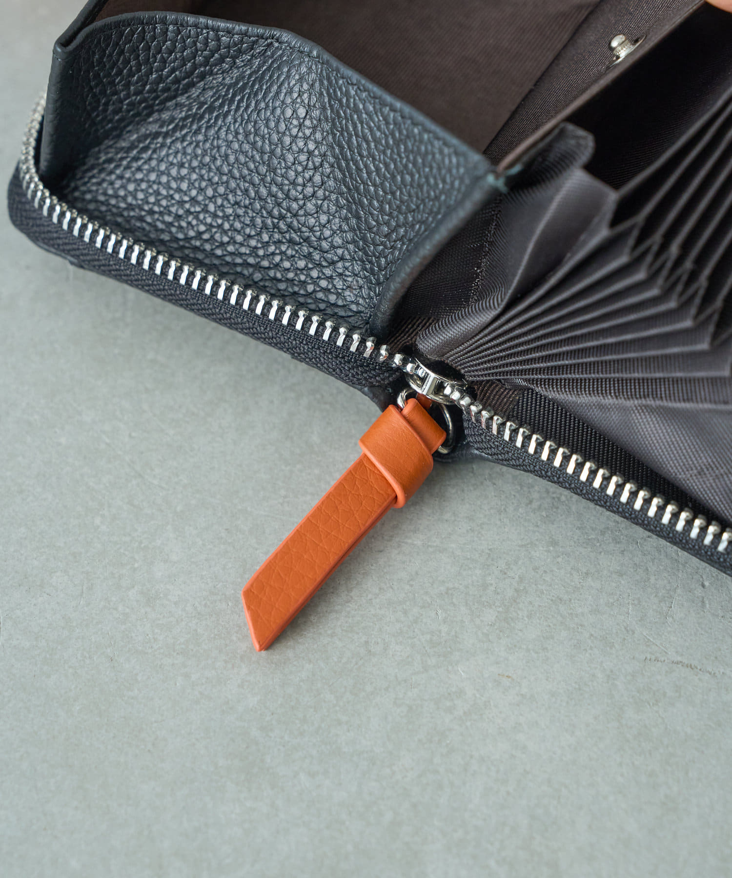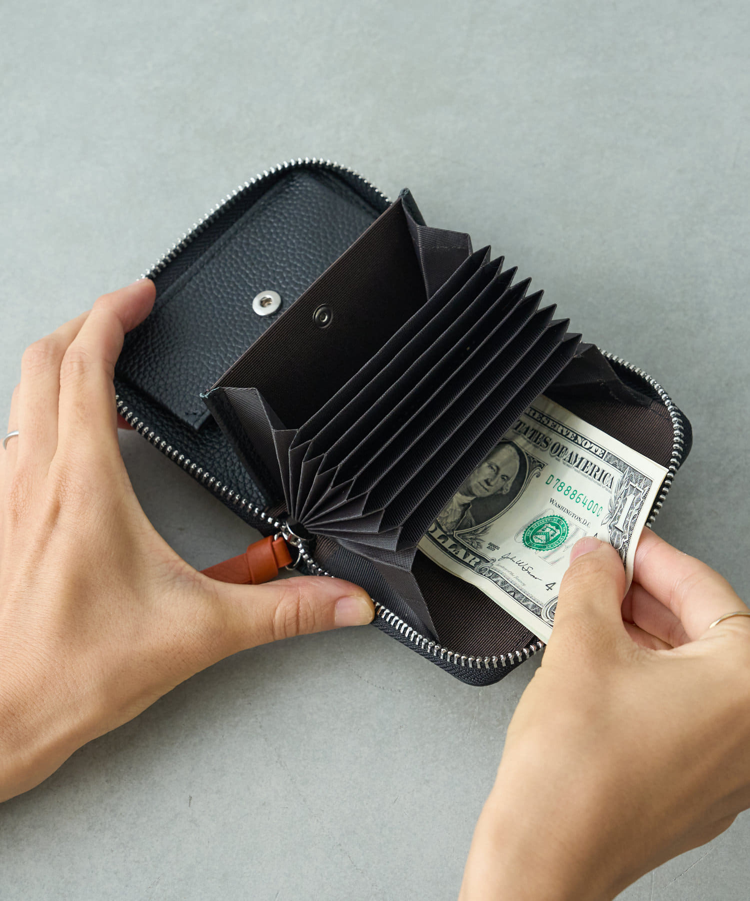 最大の魅力は、お札を折ることなく、スムーズにお札を収納することができ、取り出しも楽々な点。カードポケットも充実しており、全部で9ヵ所のポケット数。1番左のポケットはやや広めに設計しているので、複数のレシートや名刺類を入れるのも◎。ジャバラタイプなので、カードが見やすくスッと取り出しやすいのが特徴です。小銭入れも大きく開くタイプで、小さな小銭もスムーズに取り出すことができます。フロントにもポケットがあるので、よく使うICカードを入れておくのがおすすめ。ショップで人気のバイカラーにデザインを施し、見た目にもこだわりました。中は濃色なので汚れも気になりません。
