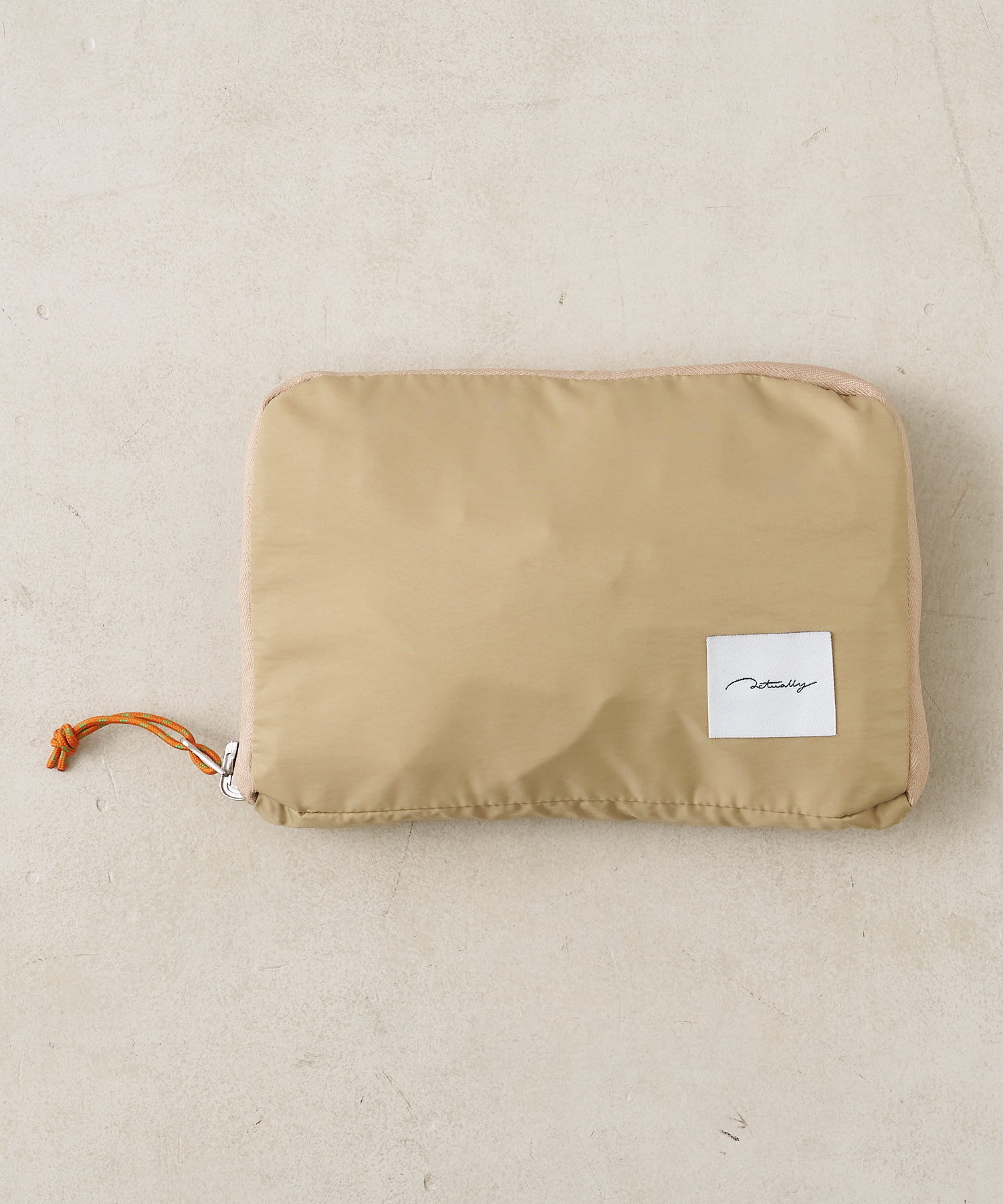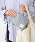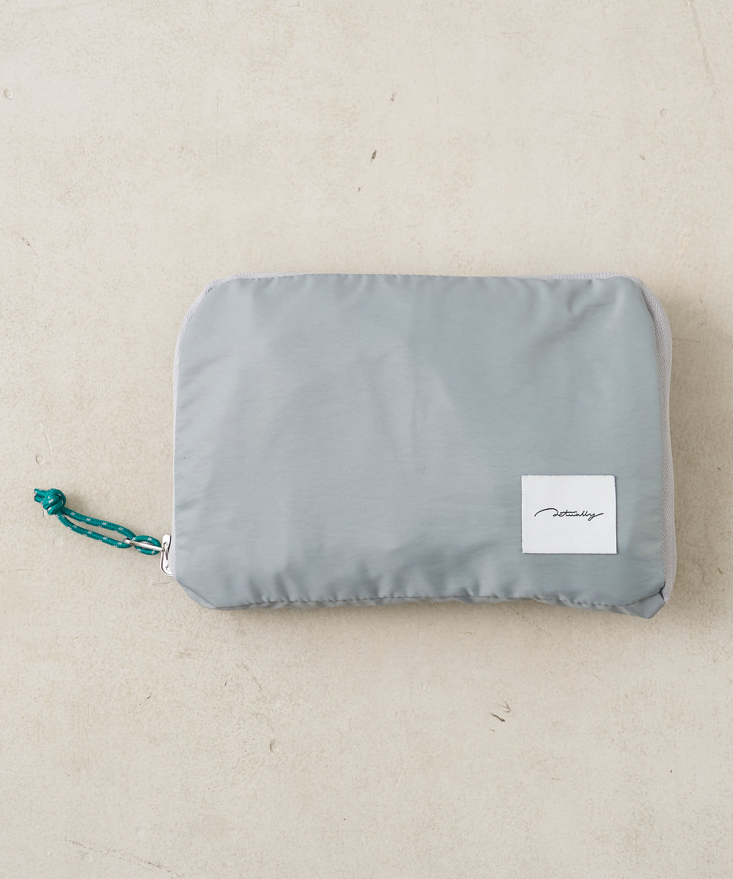 フロント部分のポケットにくるんとたたんでしまうだけで、ポーチ程度の大きさにまとまり、持ち運びしやすい便利アイテム。