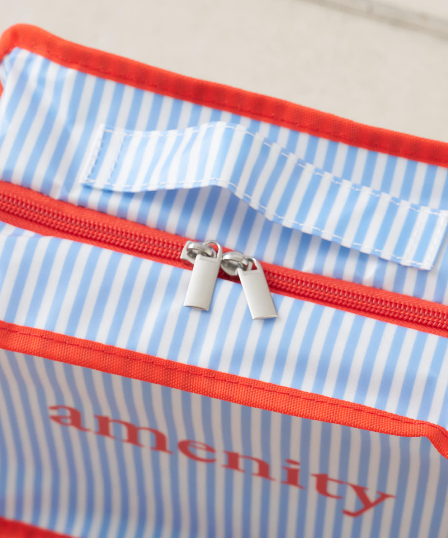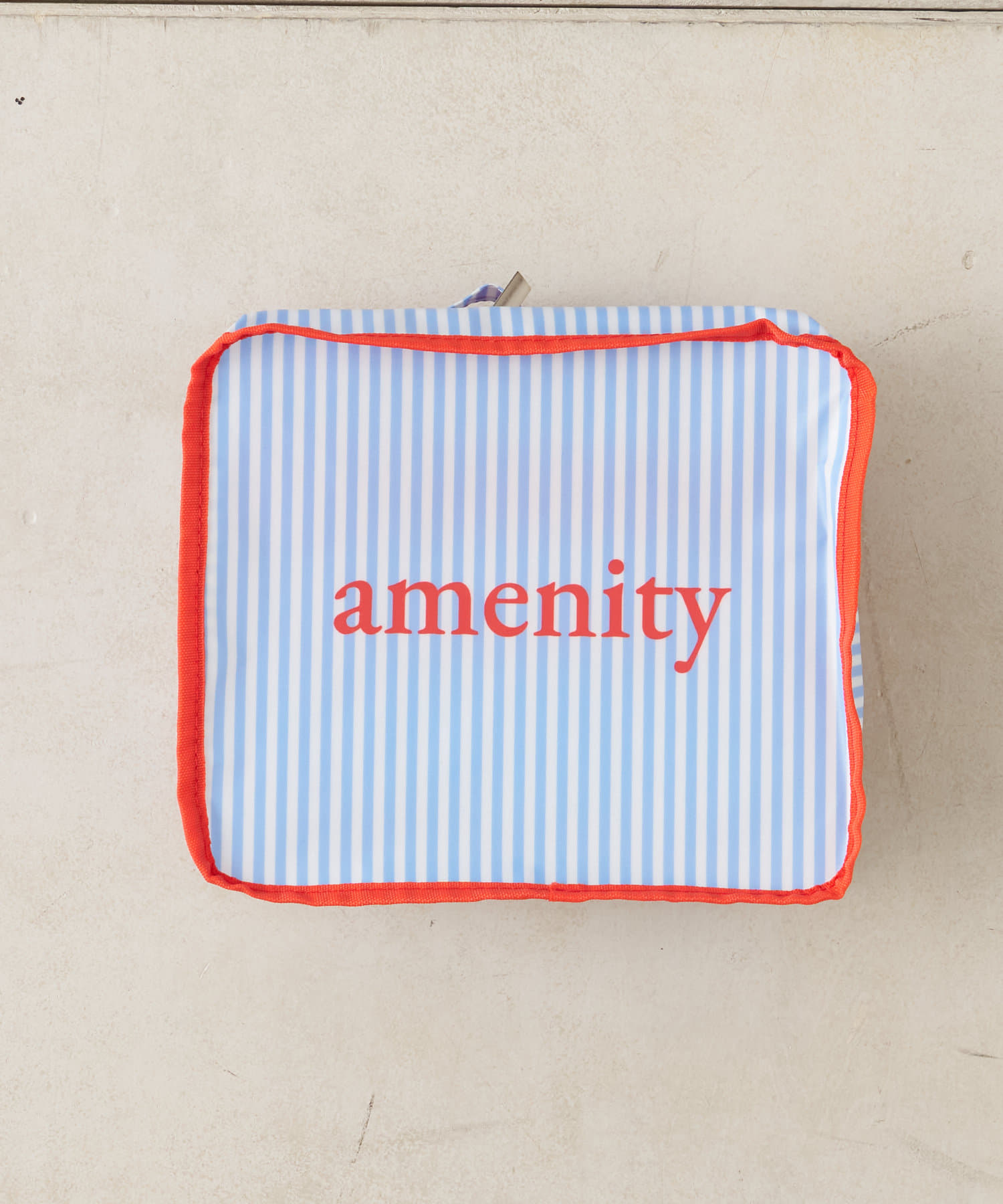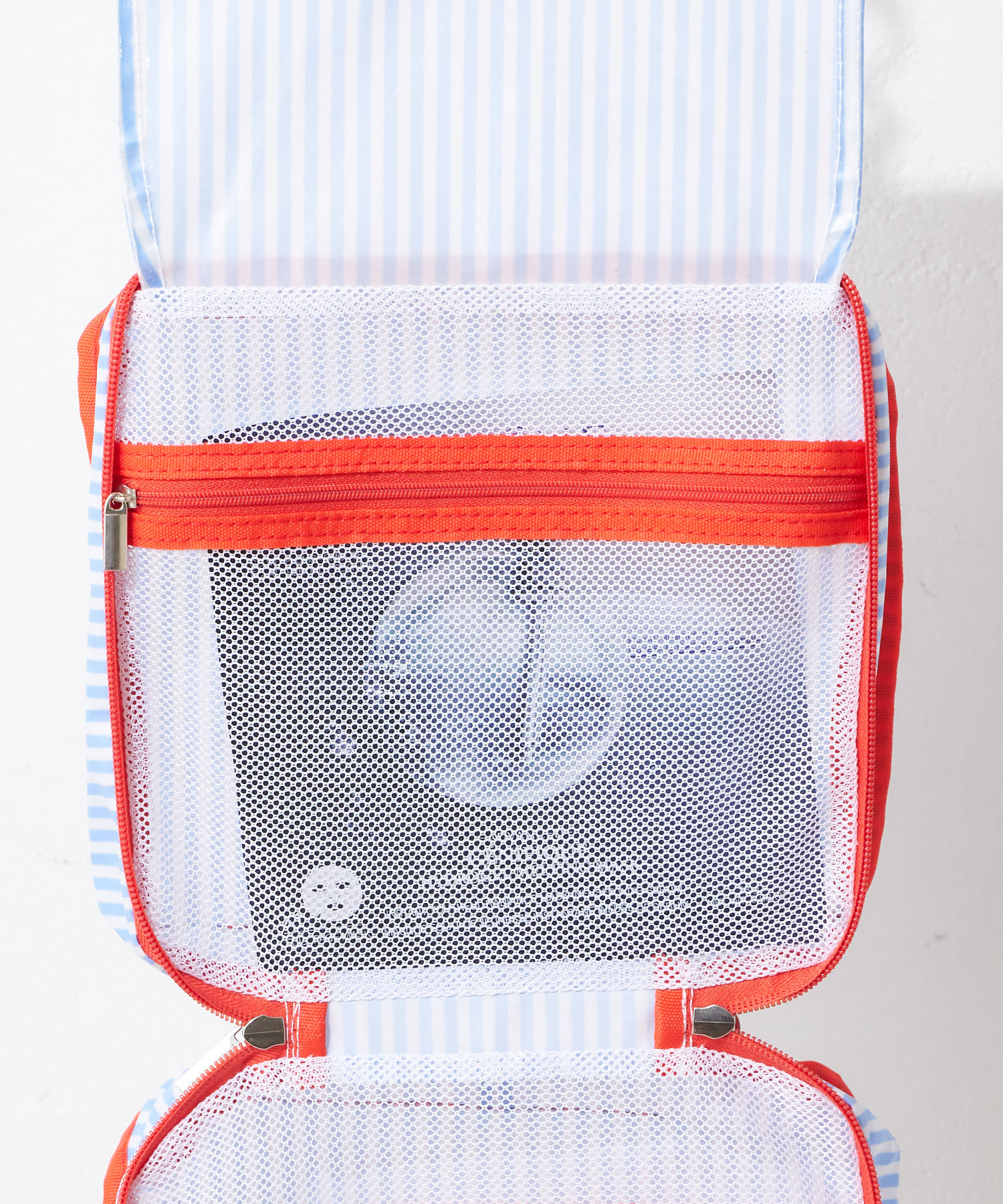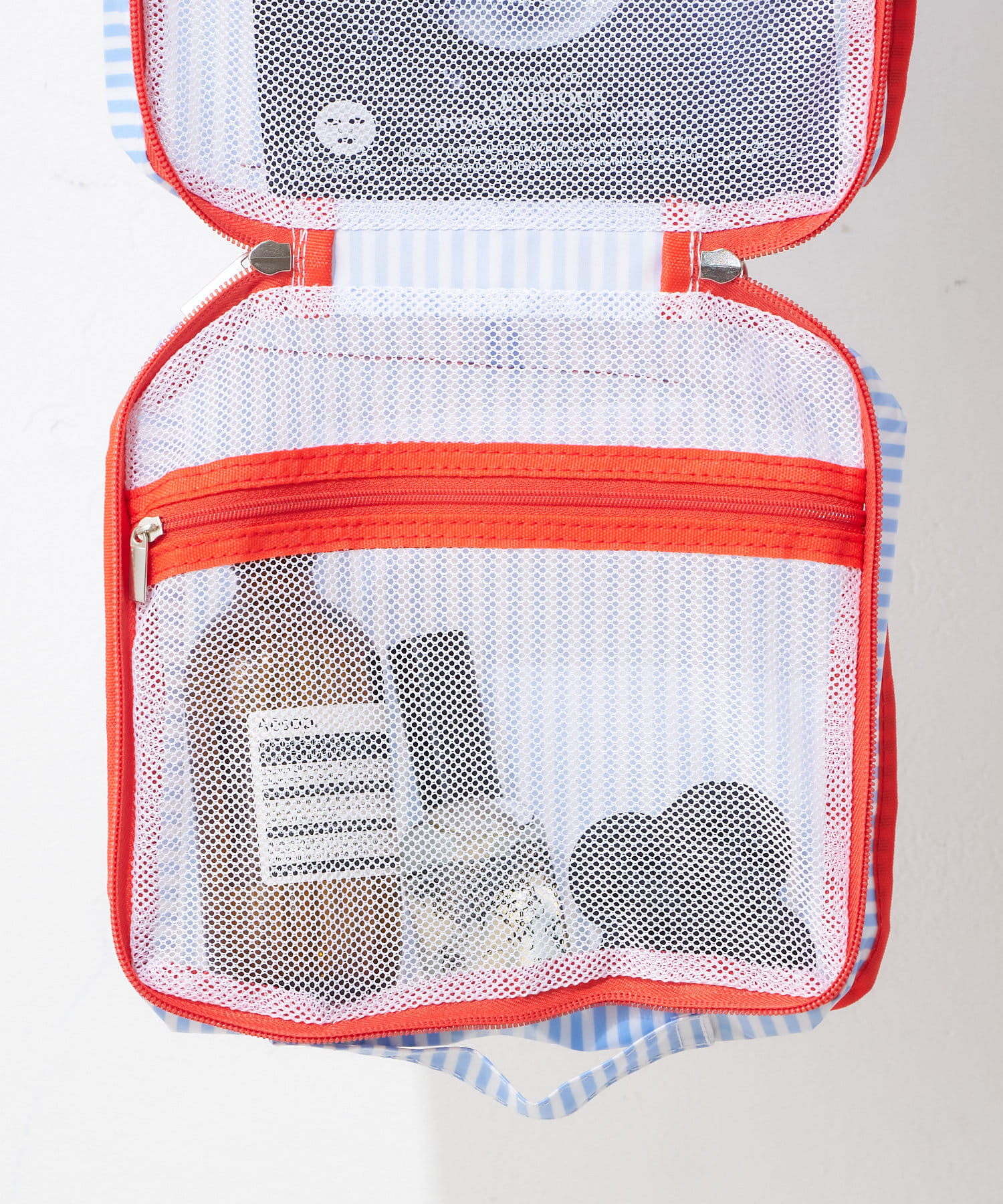 こちらはアメニティポーチ。ストライプ柄にオレンジやグリーンの配色をさし、遊び心あるデザインが自慢。