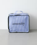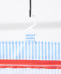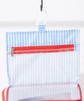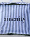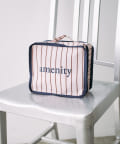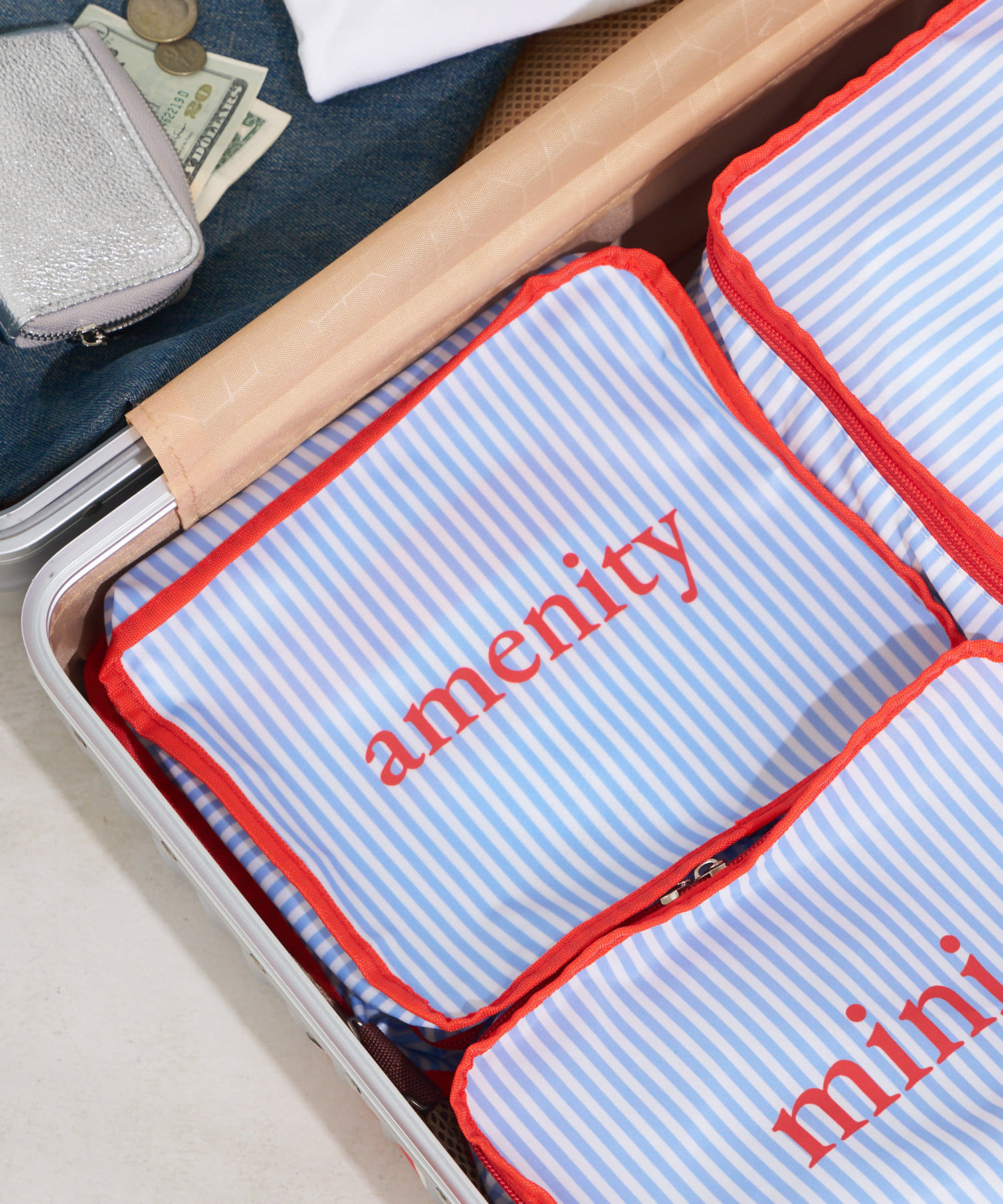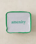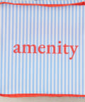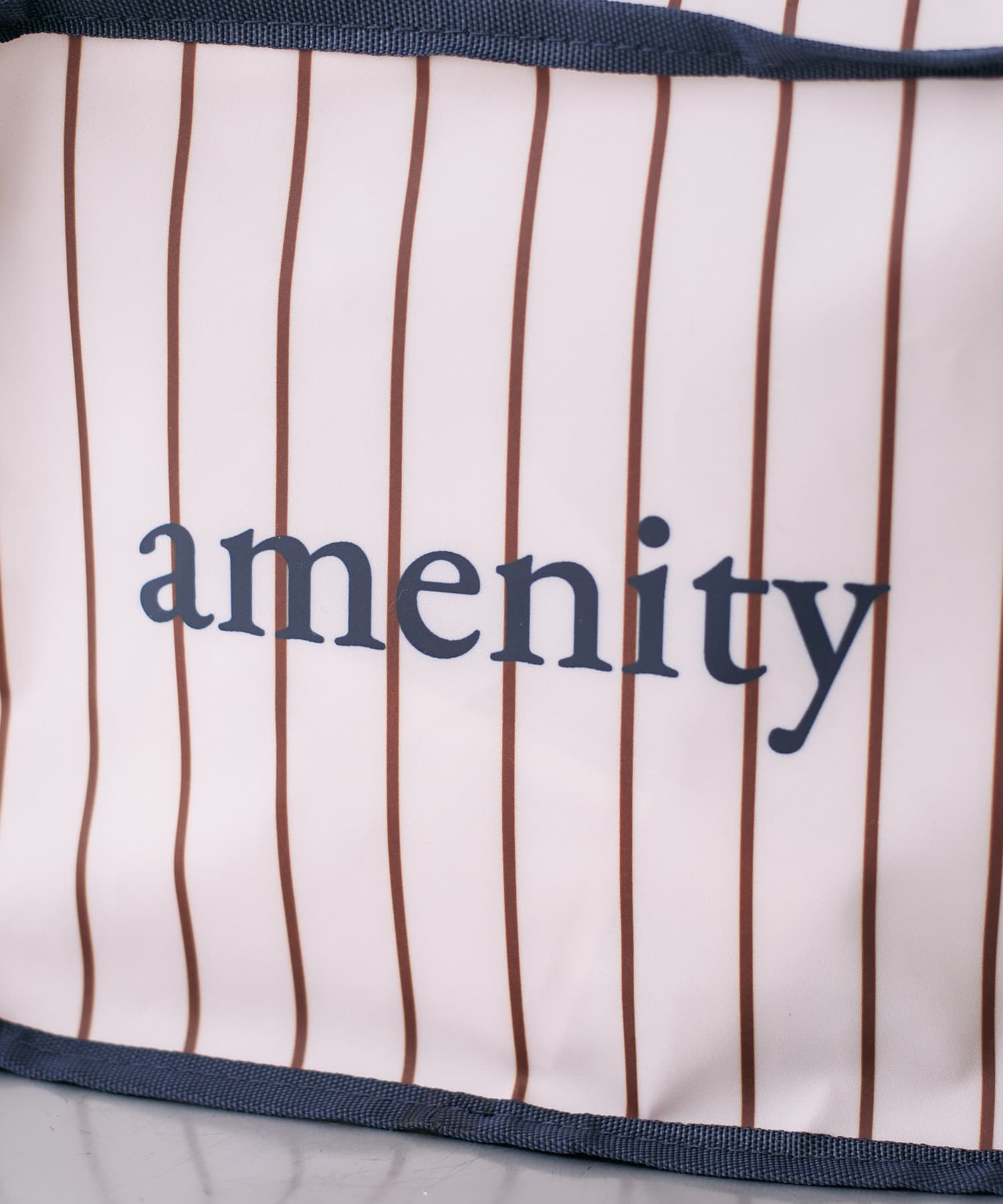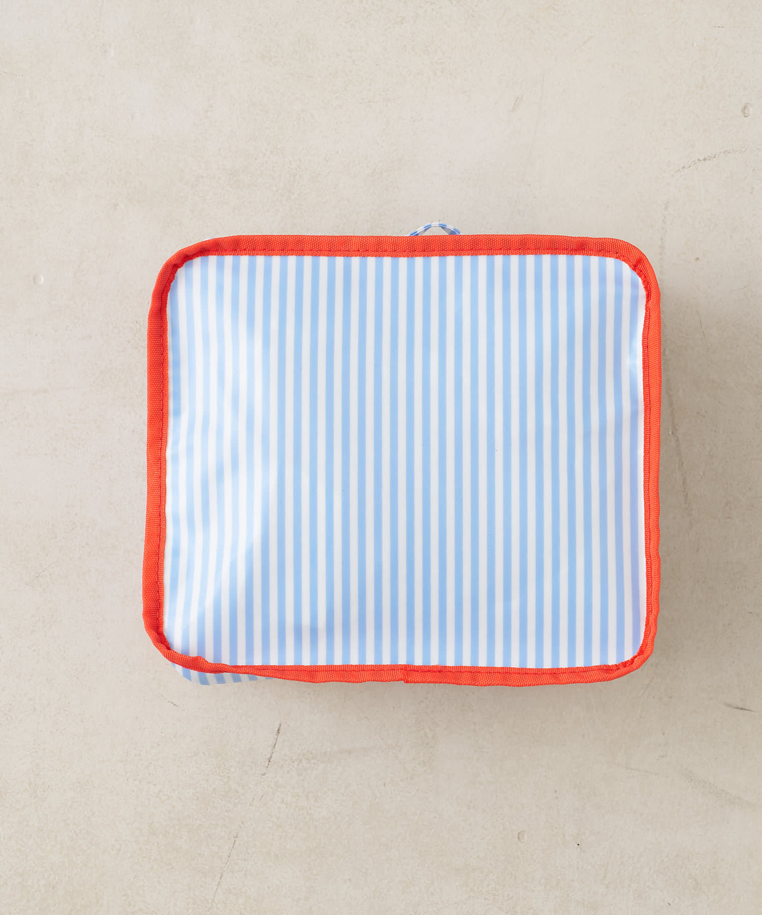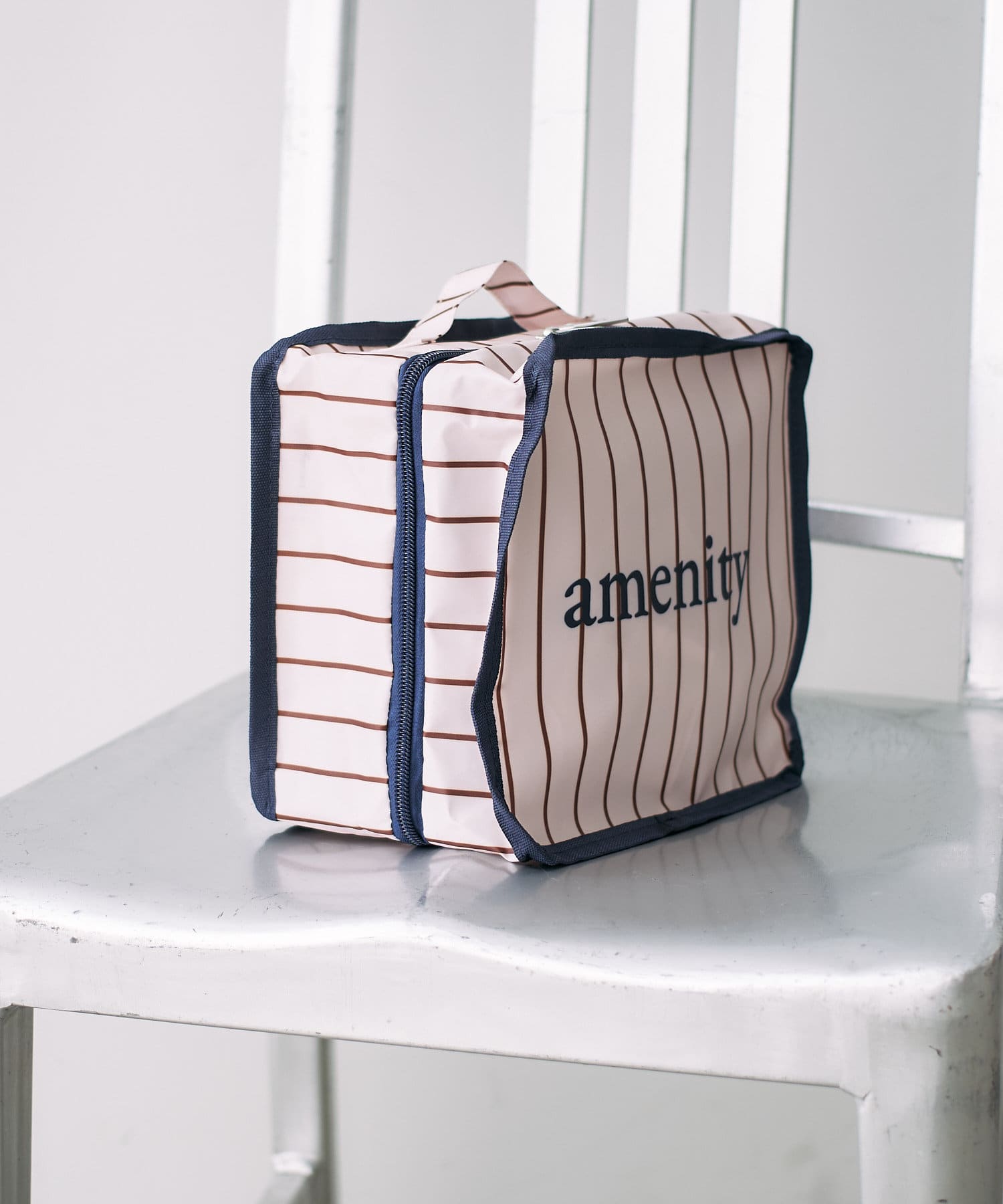 こちらはアメニティポーチ。ストライプ柄にオレンジやグリーンの配色をさし、遊び心あるデザインが自慢。