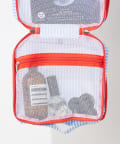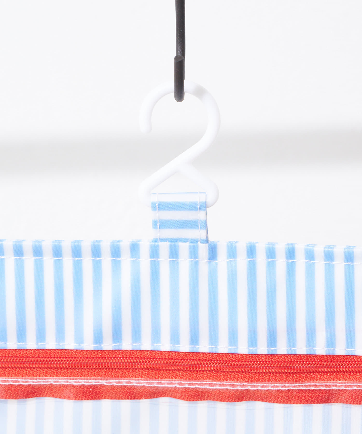 部屋は3つに分かれており、メッシュ素材のポケットが2つと、ビニール素材のポケットが1つ。表地は耐久性が高く、汚れに強いPVC加工を施しているので、水や汚れもさっとふき取ることができお手入れも楽々。持ち手もついているので、持ち運びにも便利。
