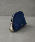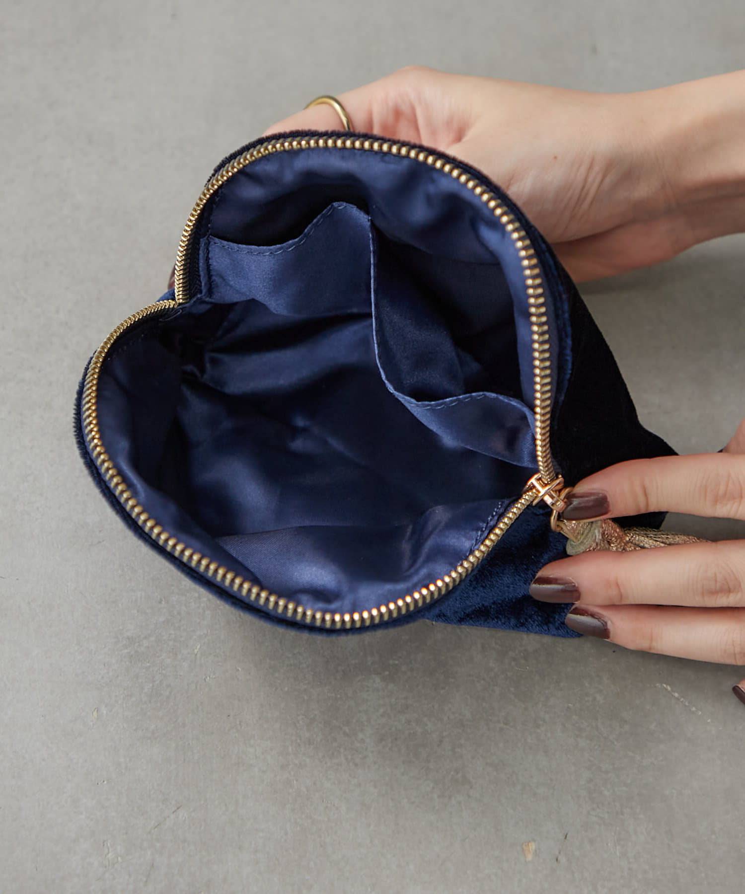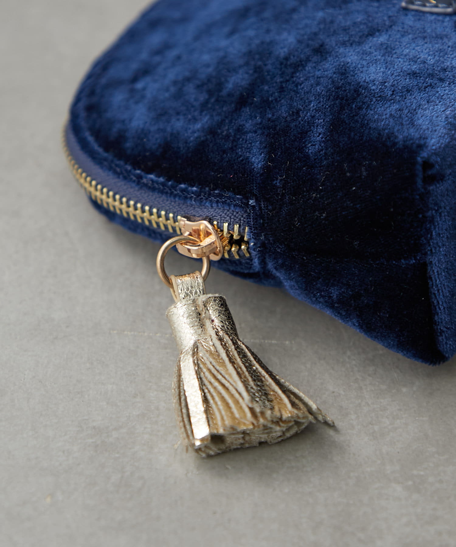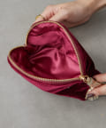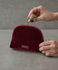程よい光沢感のベロア素材を使い、オリジナルのポーチをつくりました。フリンジのチャームや表面にあしらわれたロゴ、ファスナーのメタリックとも相まって高級感が漂い、ホリデーシーズンにも持ちたくなるデザイン。見た目だけでなく、使いやすさにもこだわり、マチをたっぷりととり、中のコスメやガジェット、ステーショナリー等細々したものも分かりやすく、取り出しやすいつくりになっています。普段使いだけでなく、旅行や出張、年末年始の帰省にも大活躍しそう。気分のあがるポーチは大切な人へのプレゼントにも◎。