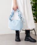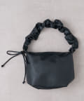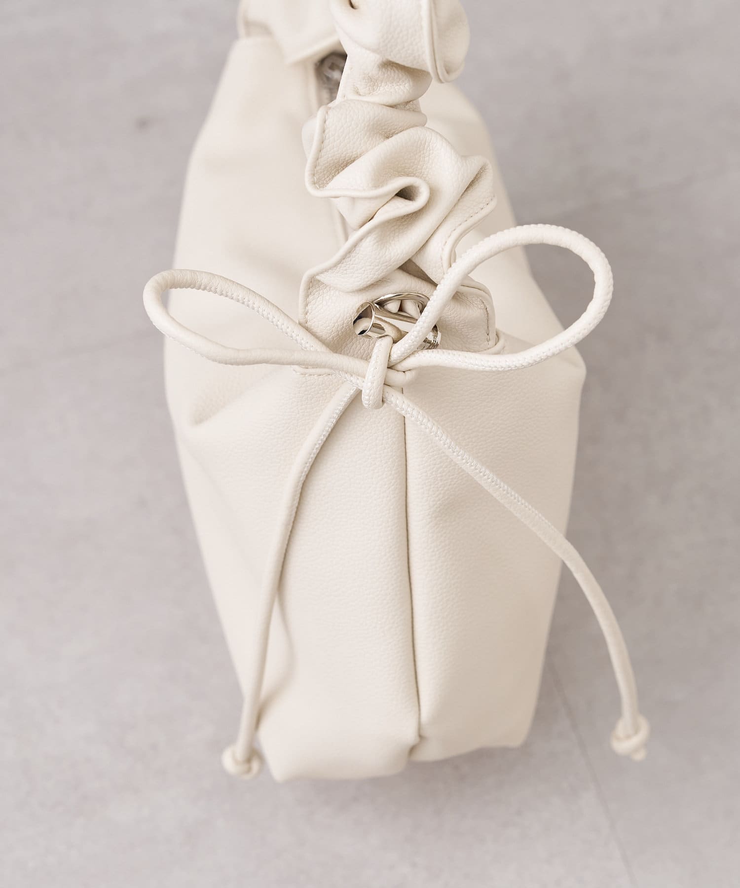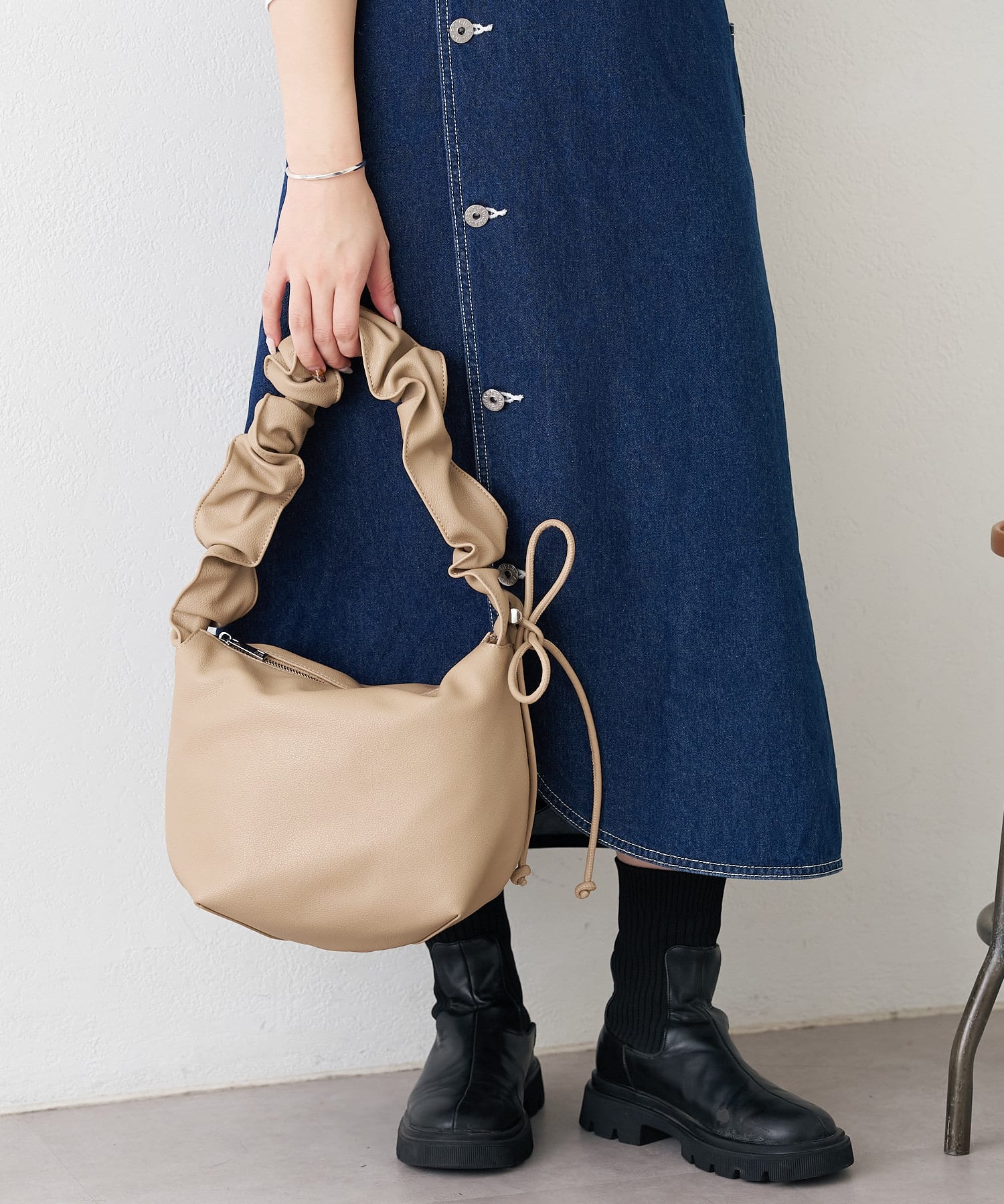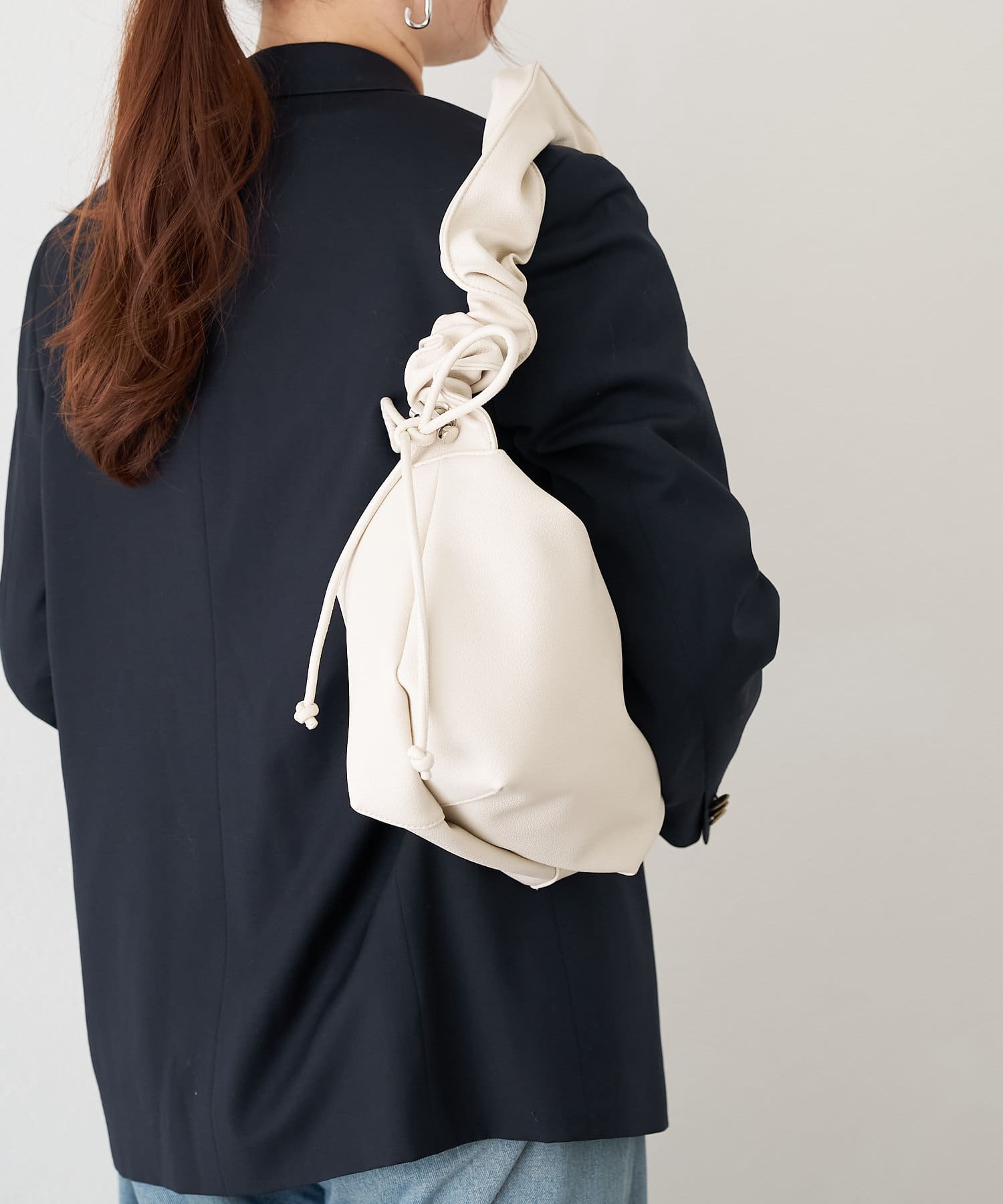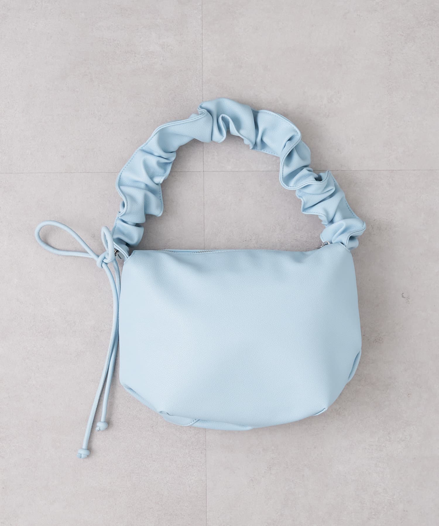 自分の好みの長さ・くしゅっと感でスタイリングを楽しめる、シャーリングミニバッグ。ハンドルを短くすれば、ハンドバッグや肩掛けのショルダーとして、ハンドルを伸ばすとボディバッグのように斜め掛けにすることも可能。コンパクトな見た目とは裏腹に、500mlのペットボトルやハンカチ、長財布など普段の荷物がしっかり入るサイズ感。マチがあるので、荷物の取り出しも楽々。シュリンク素材のフェイクレザーを使用しており、ソフトで軽量なのもポイント◎カラーはベーシックなブラック、アイボリー、ベージュに加え、冬に持ちたくなるライトブルーもプラスしました。