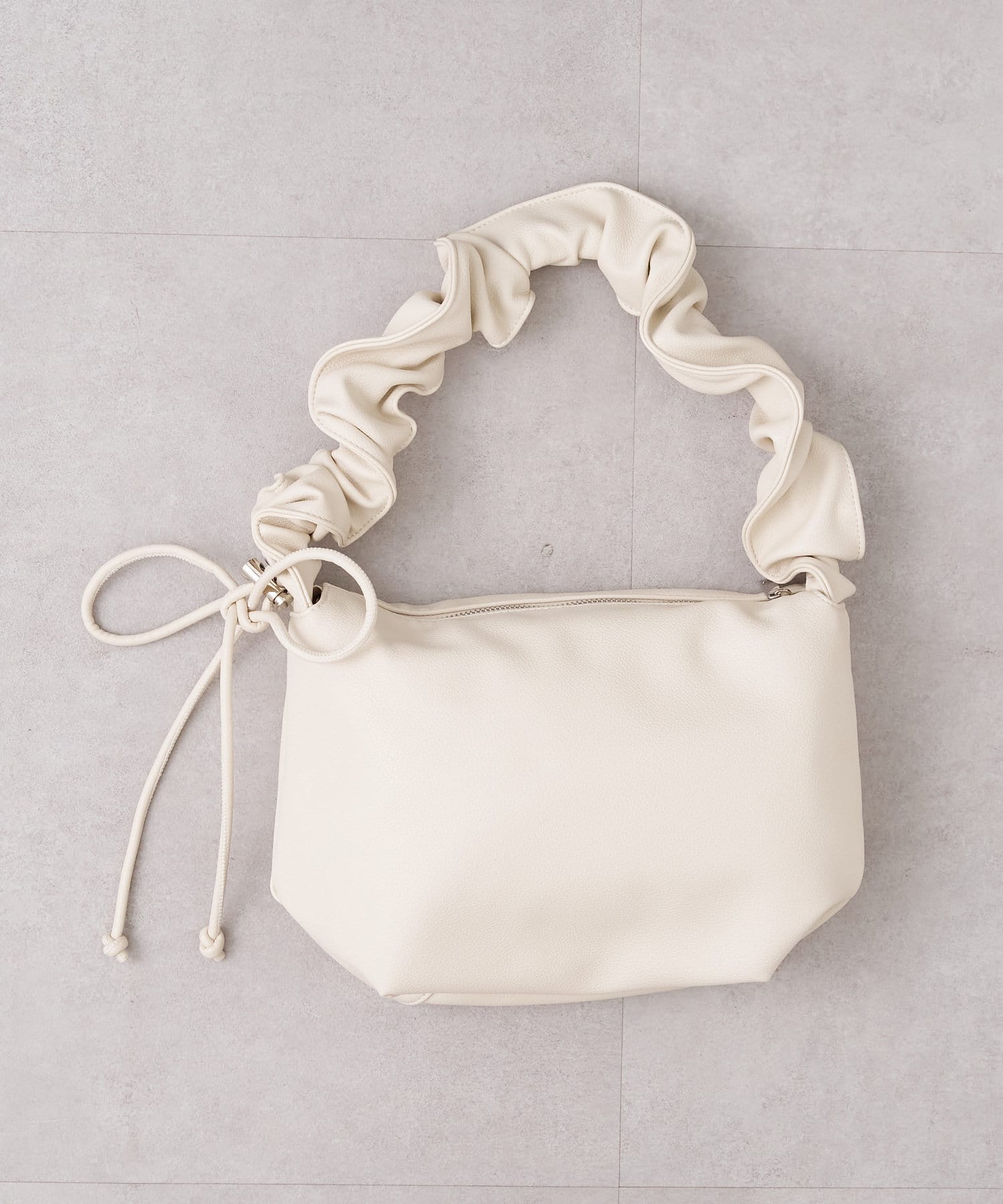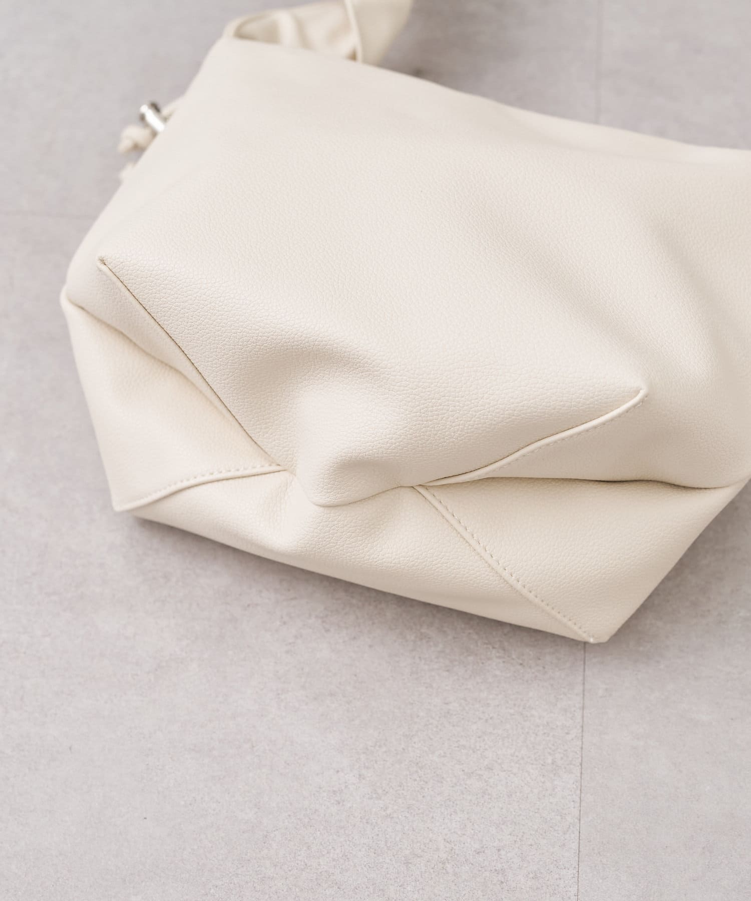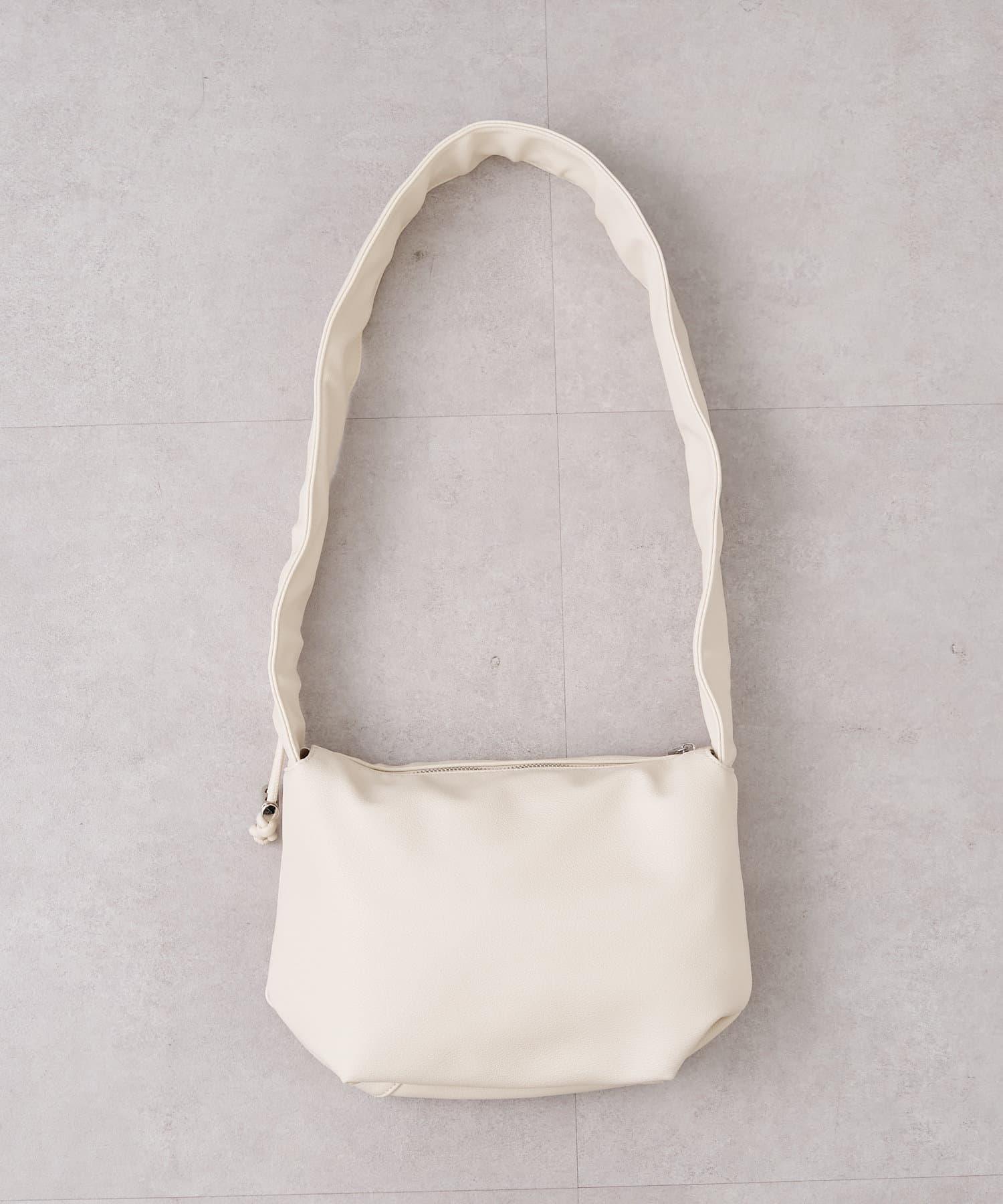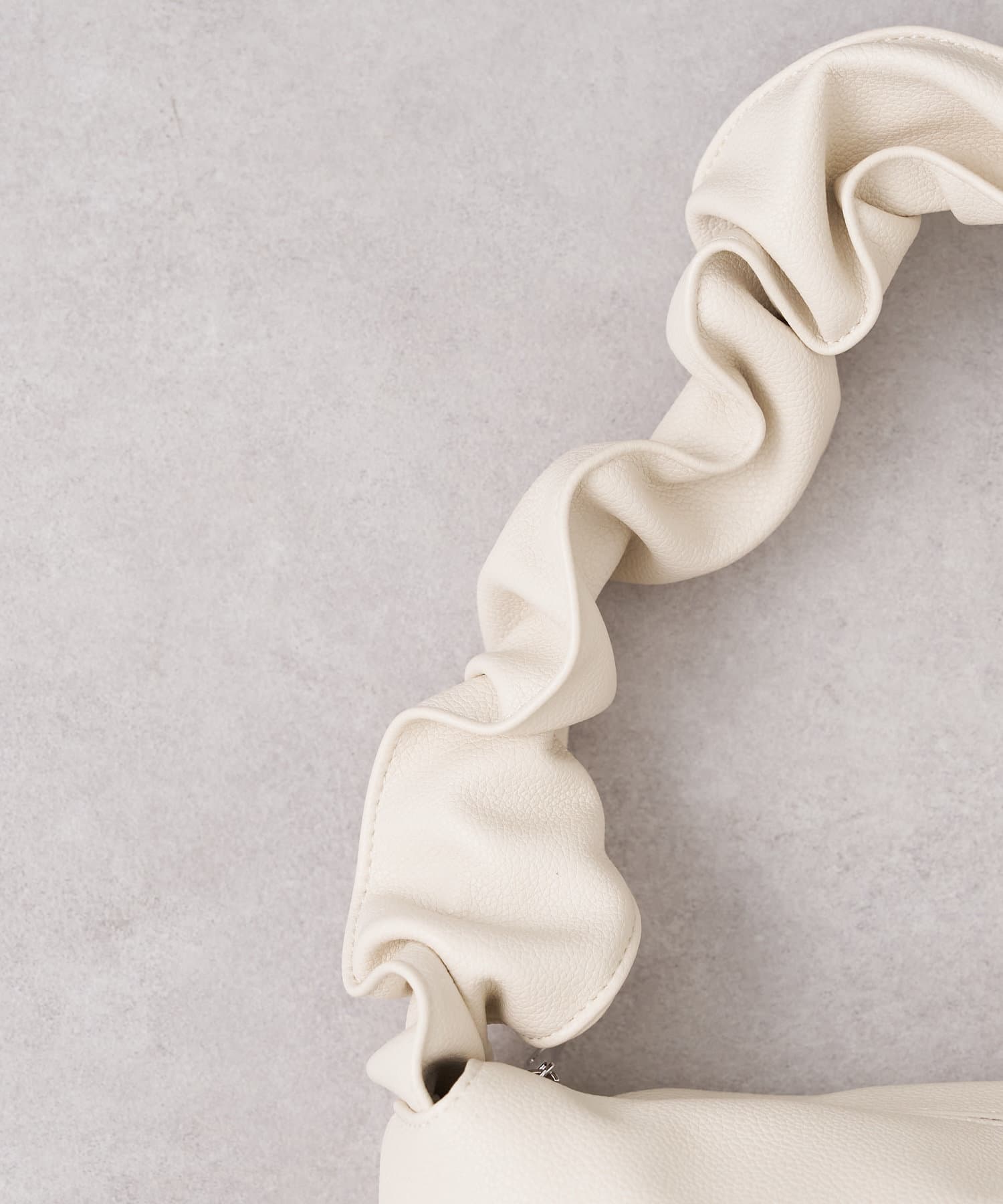 自分の好みの長さ・くしゅっと感でスタイリングを楽しめる、シャーリングミニバッグ。ハンドルを短くすれば、ハンドバッグや肩掛けのショルダーとして、ハンドルを伸ばすとボディバッグのように斜め掛けにすることも可能。コンパクトな見た目とは裏腹に、500mlのペットボトルやハンカチ、長財布など普段の荷物がしっかり入るサイズ感。マチがあるので、荷物の取り出しも楽々。シュリンク素材のフェイクレザーを使用しており、ソフトで軽量なのもポイント◎カラーはベーシックなブラック、アイボリー、ベージュに加え、冬に持ちたくなるライトブルーもプラスしました。