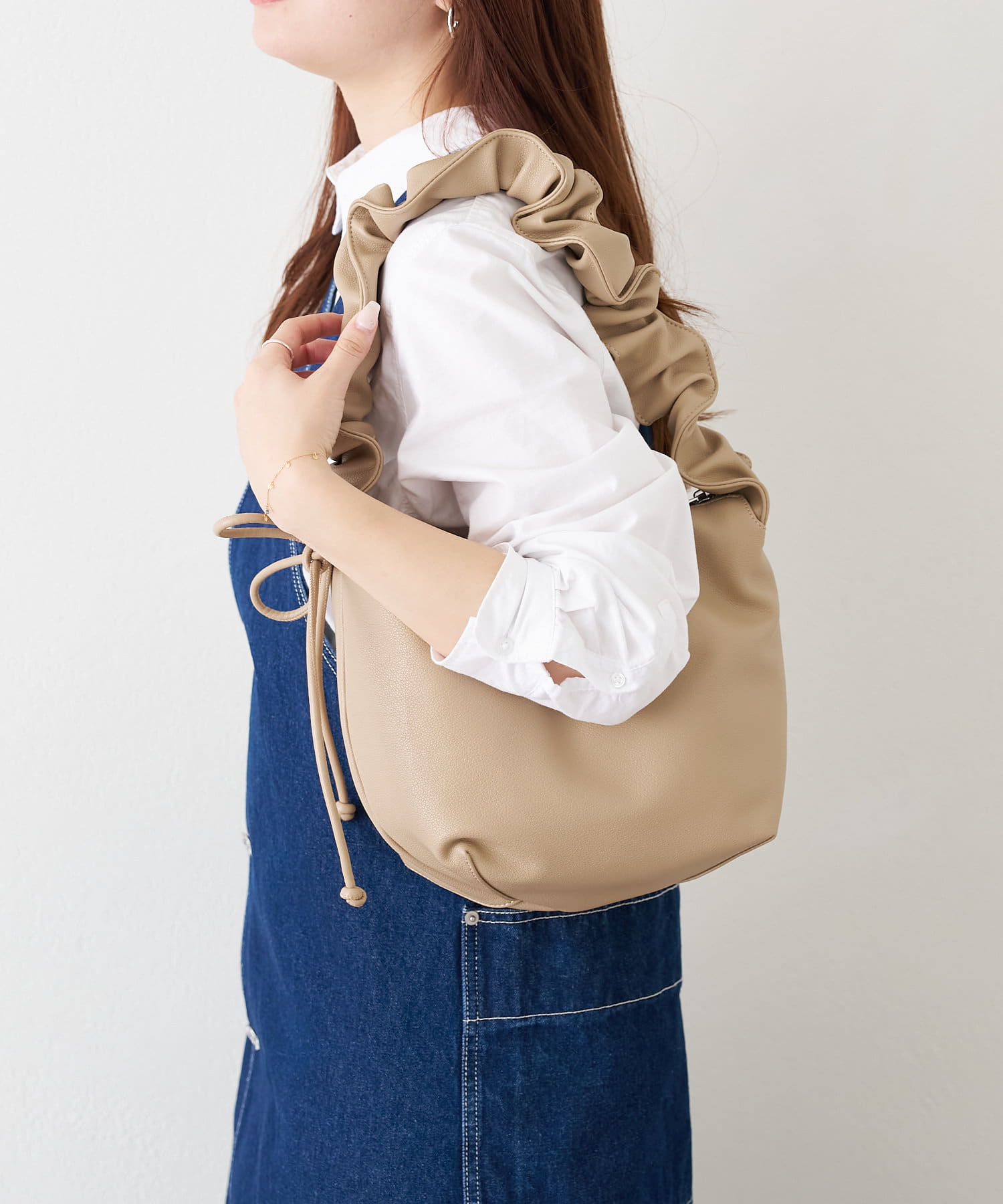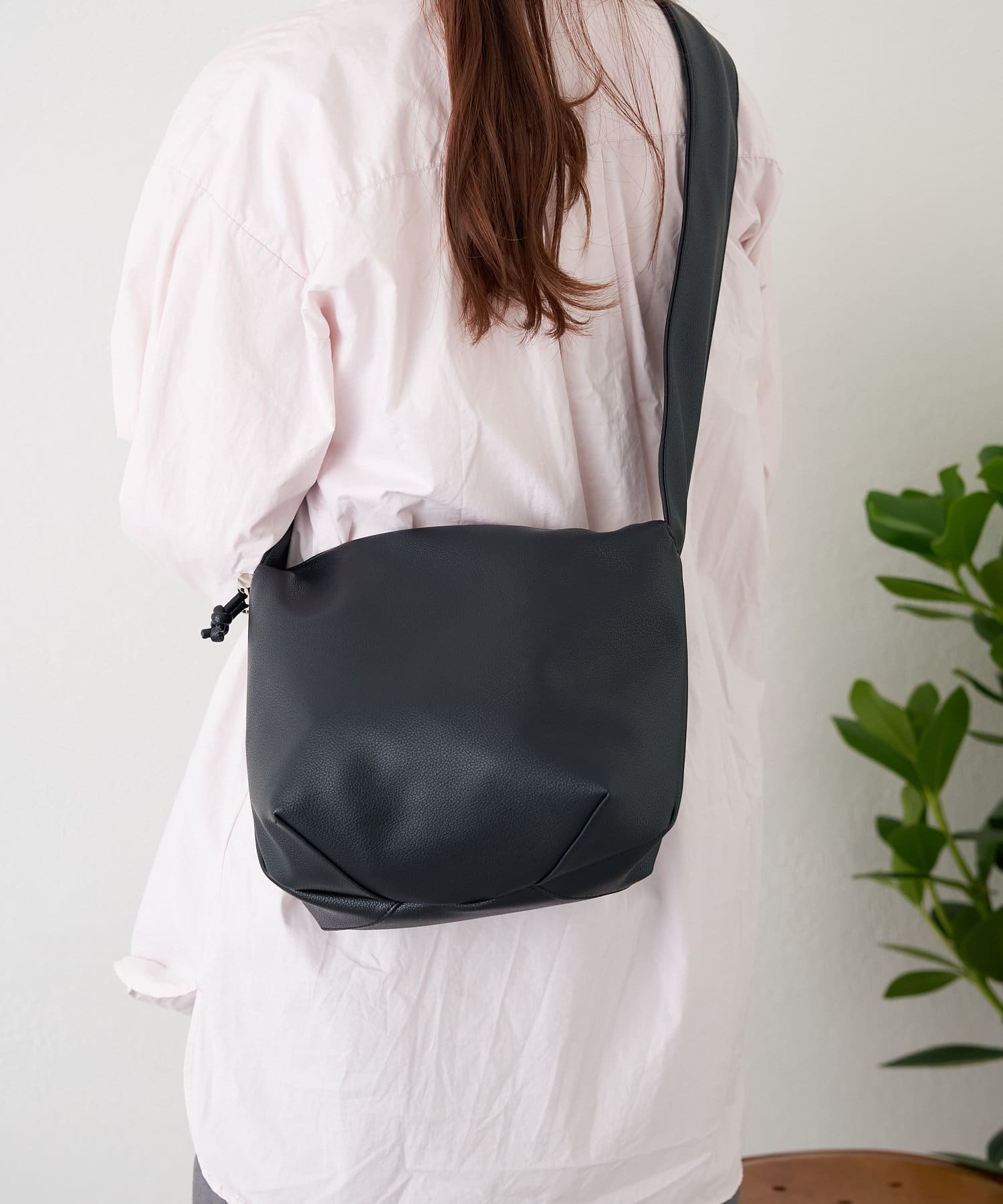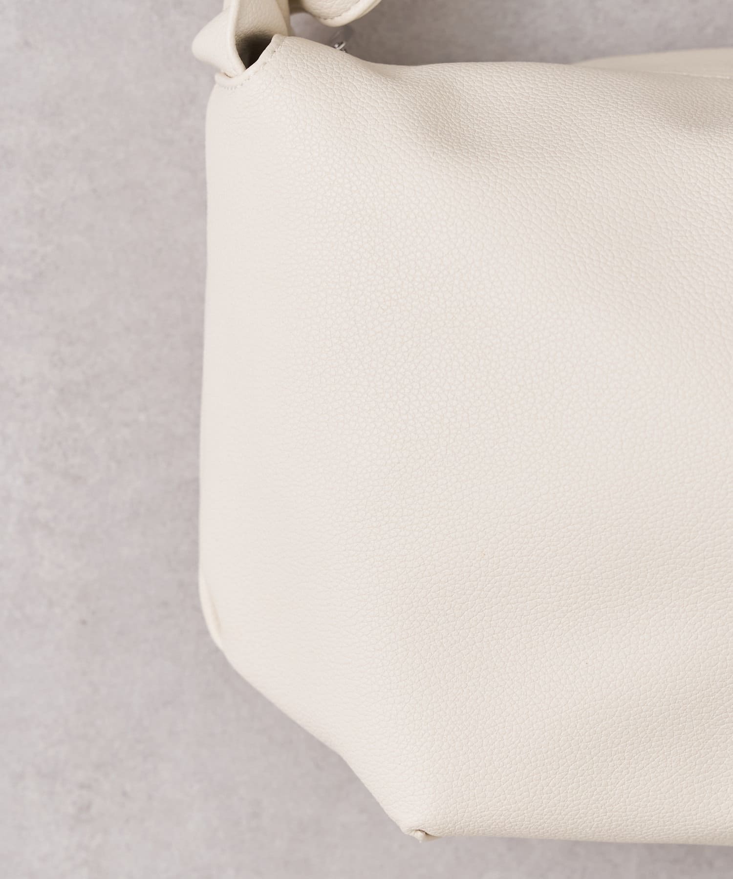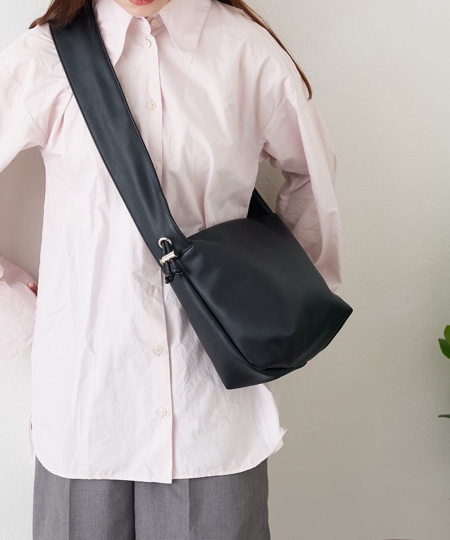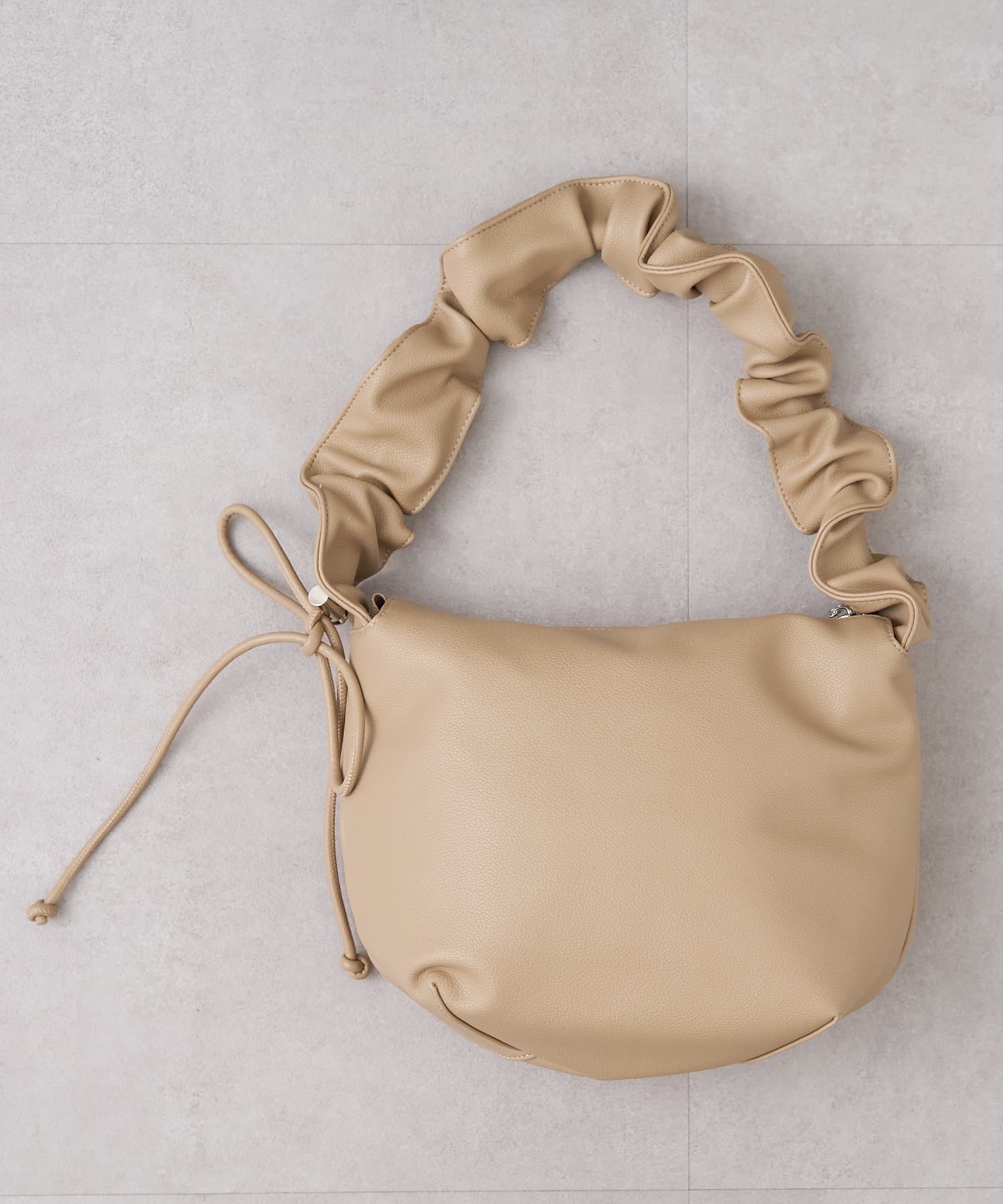 自分の好みの長さ・くしゅっと感でスタイリングを楽しめる、シャーリングミニバッグ。ハンドルを短くすれば、ハンドバッグや肩掛けのショルダーとして、ハンドルを伸ばすとボディバッグのように斜め掛けにすることも可能。コンパクトな見た目とは裏腹に、500mlのペットボトルやハンカチ、長財布など普段の荷物がしっかり入るサイズ感。マチがあるので、荷物の取り出しも楽々。シュリンク素材のフェイクレザーを使用しており、ソフトで軽量なのもポイント◎カラーはベーシックなブラック、アイボリー、ベージュに加え、冬に持ちたくなるライトブルーもプラスしました。