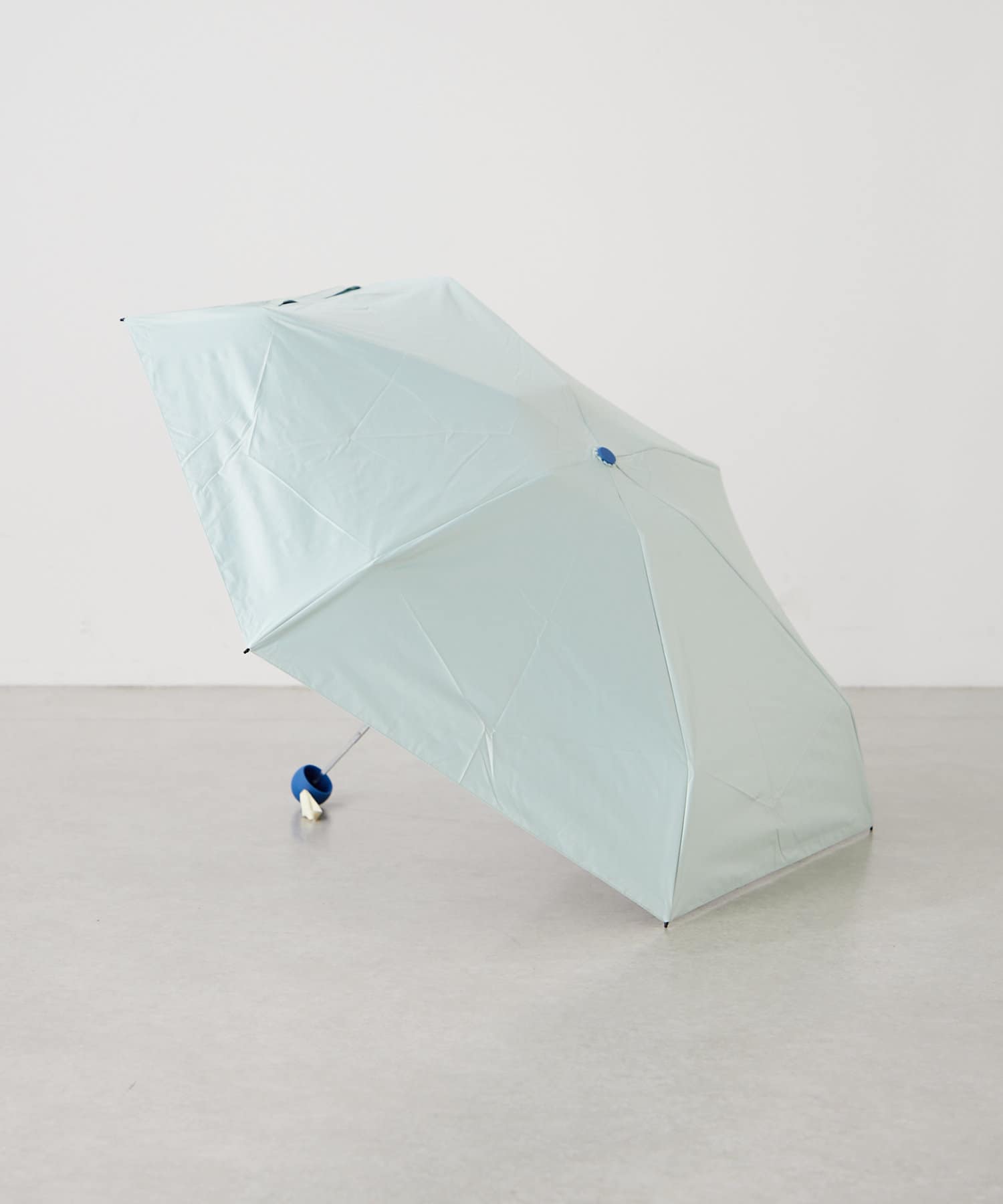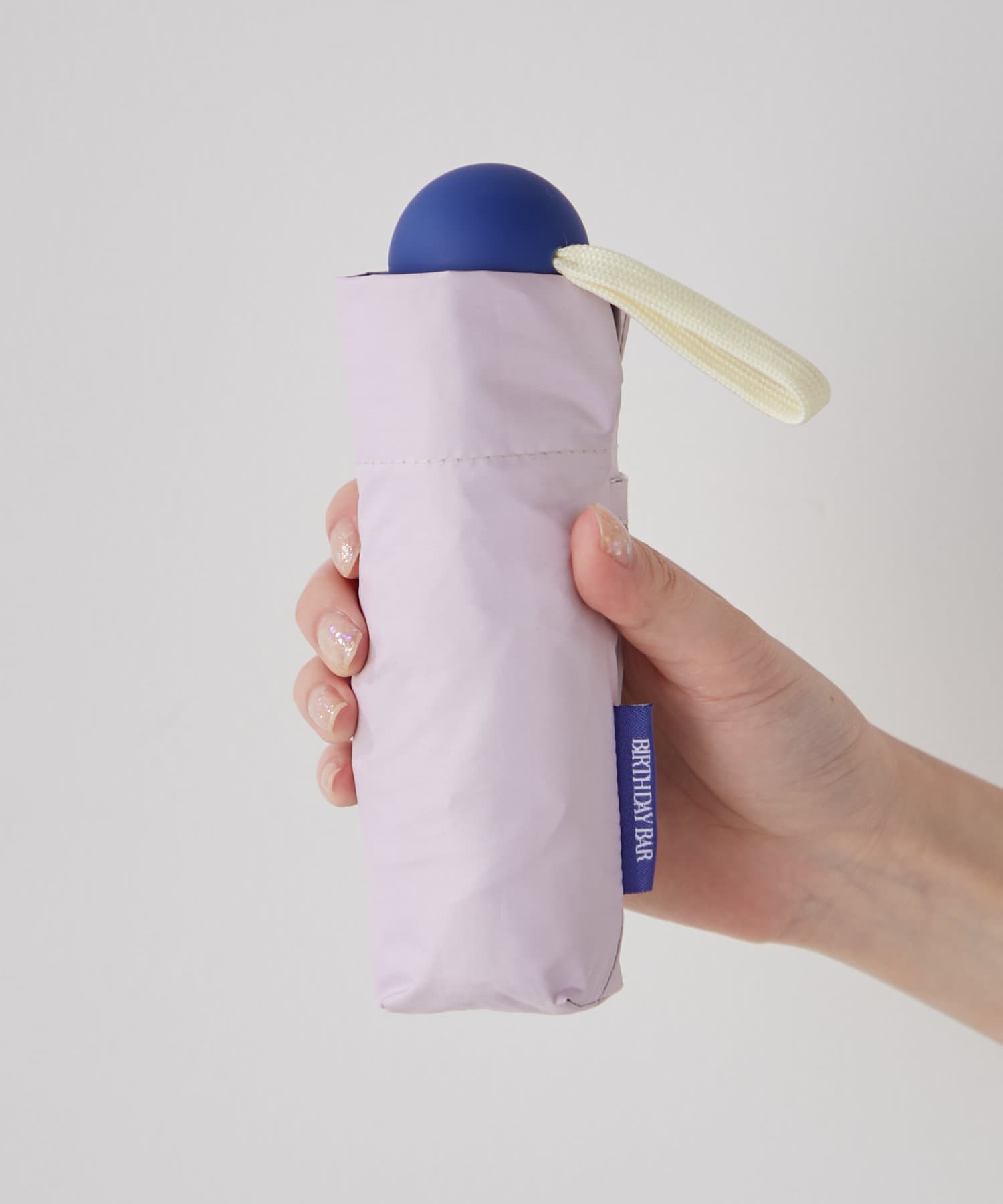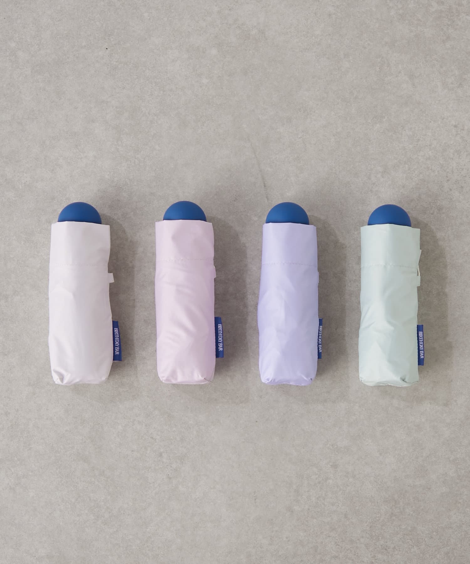 アクセントになる手元は爽やかなブルーで、憂鬱な雨の日の気分を上げてくれます。丸い形状は想像以上の持ちやすさ!BIRTHDAY BARのネームタグも同じブルーで統一しました。