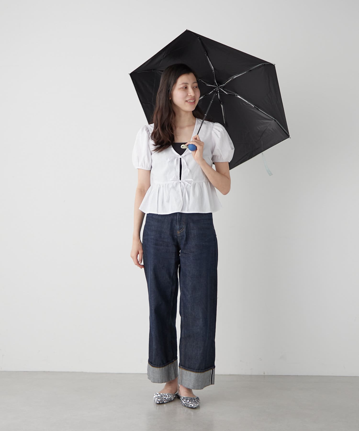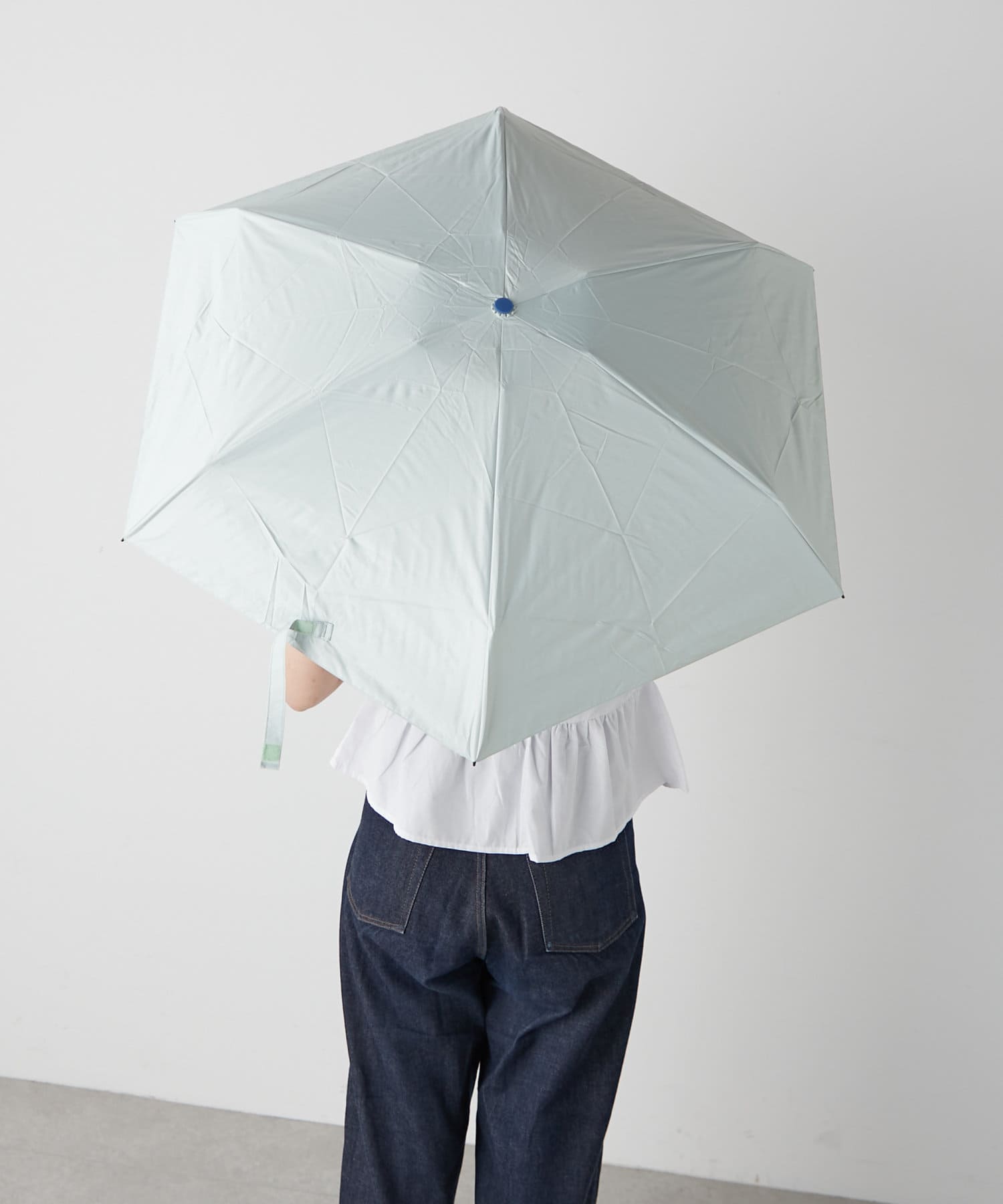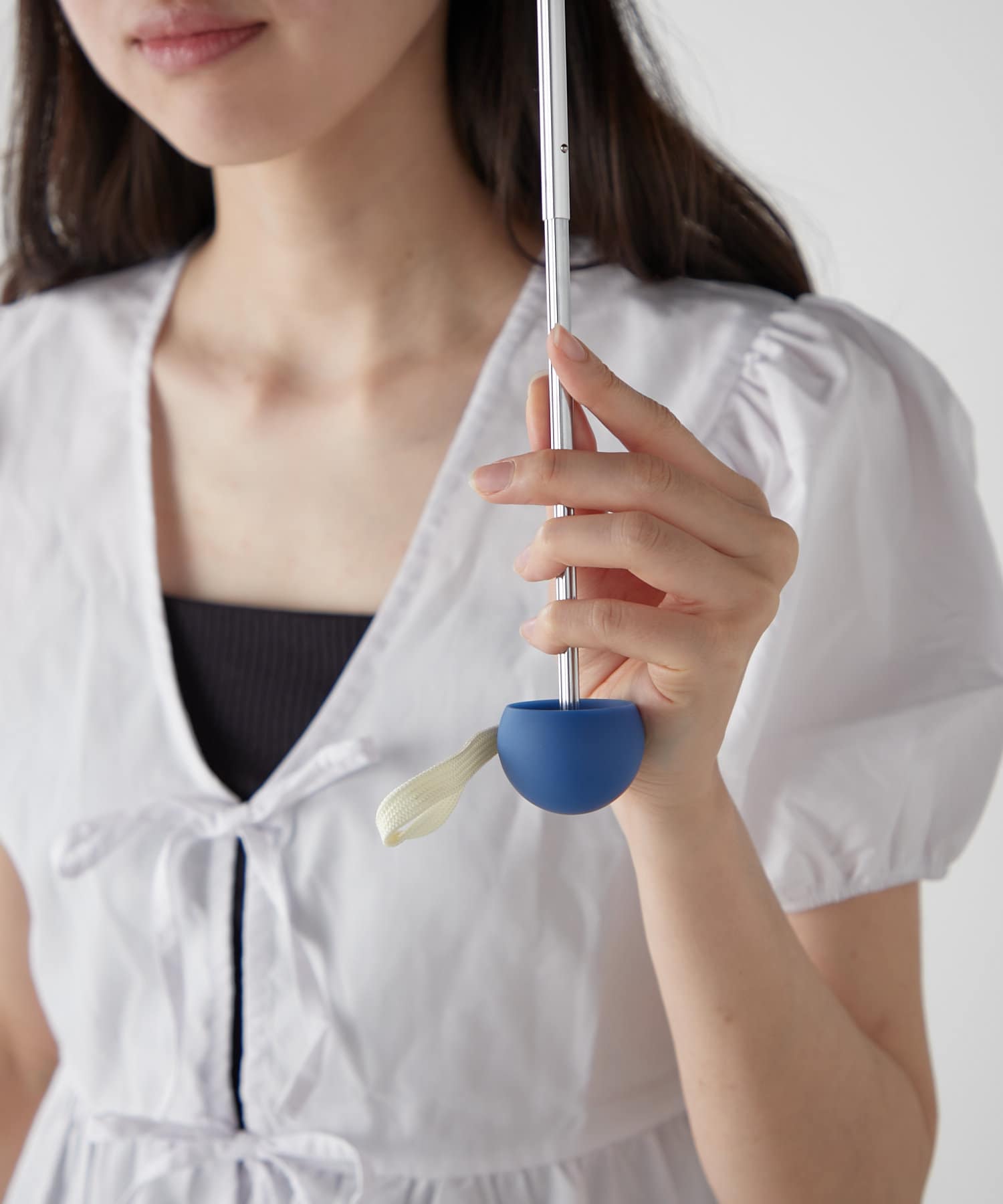 アクセントになる手元は爽やかなブルーで、憂鬱な雨の日の気分を上げてくれます。丸い形状は想像以上の持ちやすさ!BIRTHDAY BARのネームタグも同じブルーで統一しました。