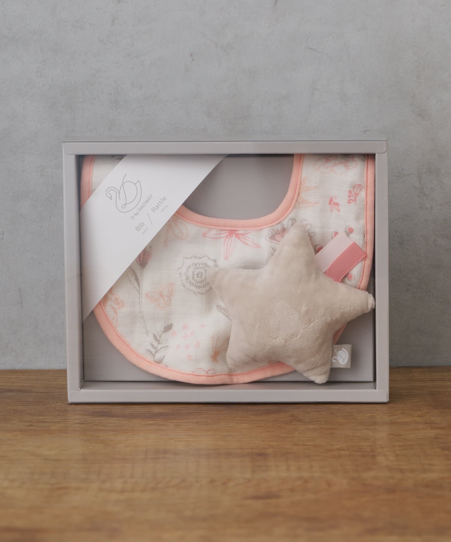 ご出産のお祝いにピッタリな、スタイとラトルをボックスにセットにしました。