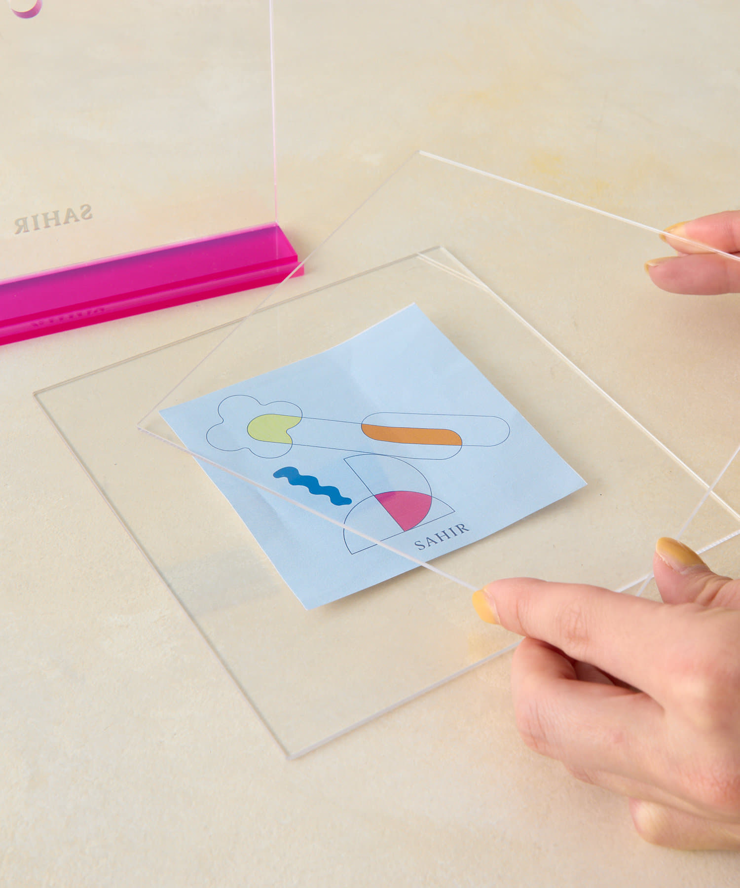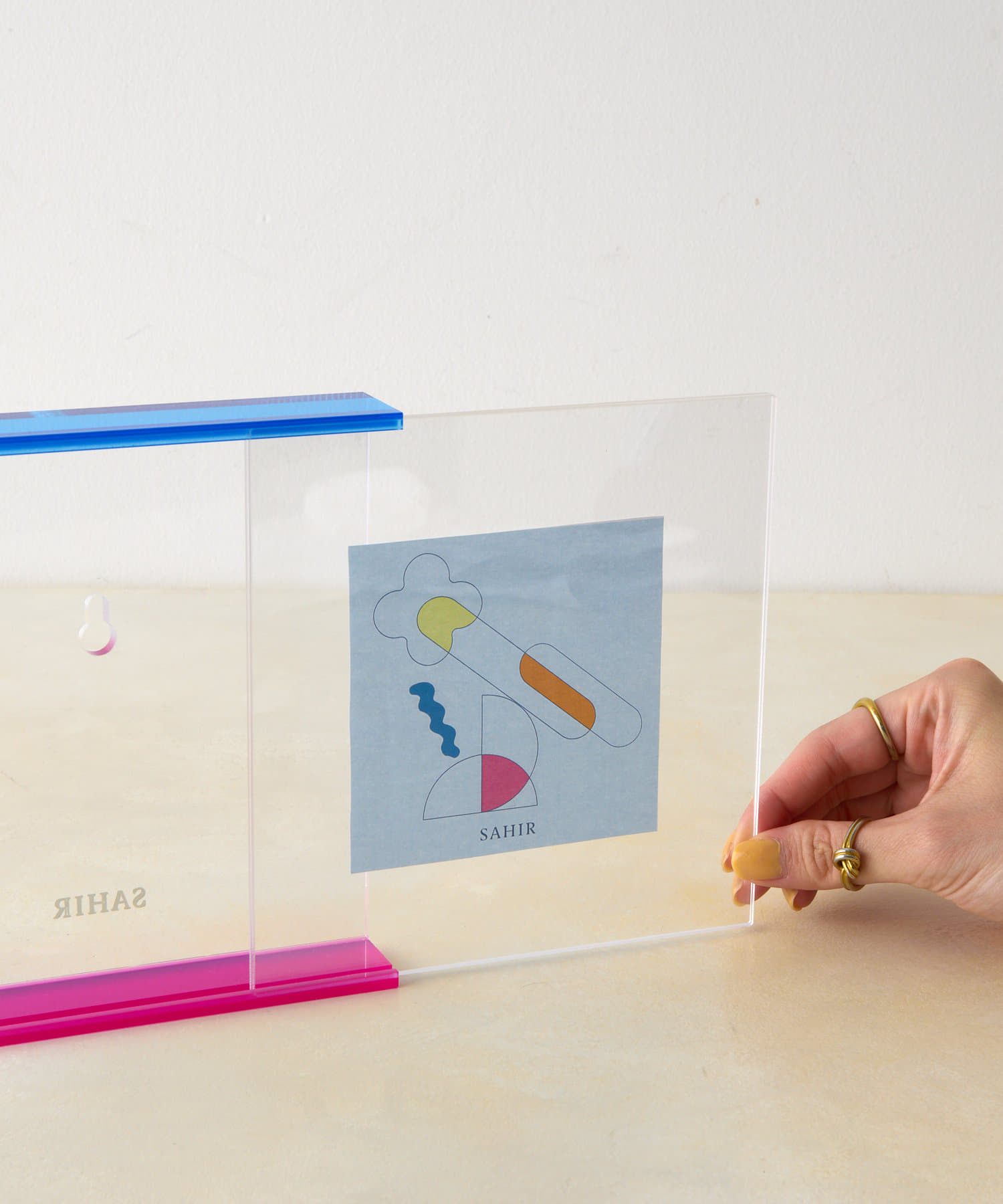 前面のアクリルをスライドさせ、写真を入れます。裏面にはフック穴があり、壁掛けも対応。
