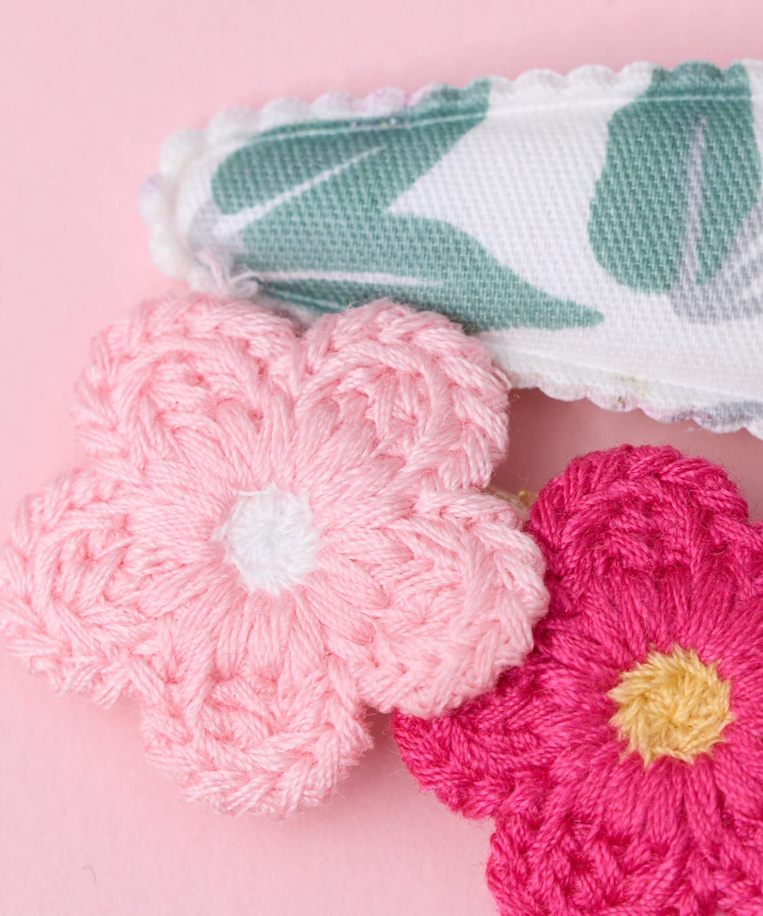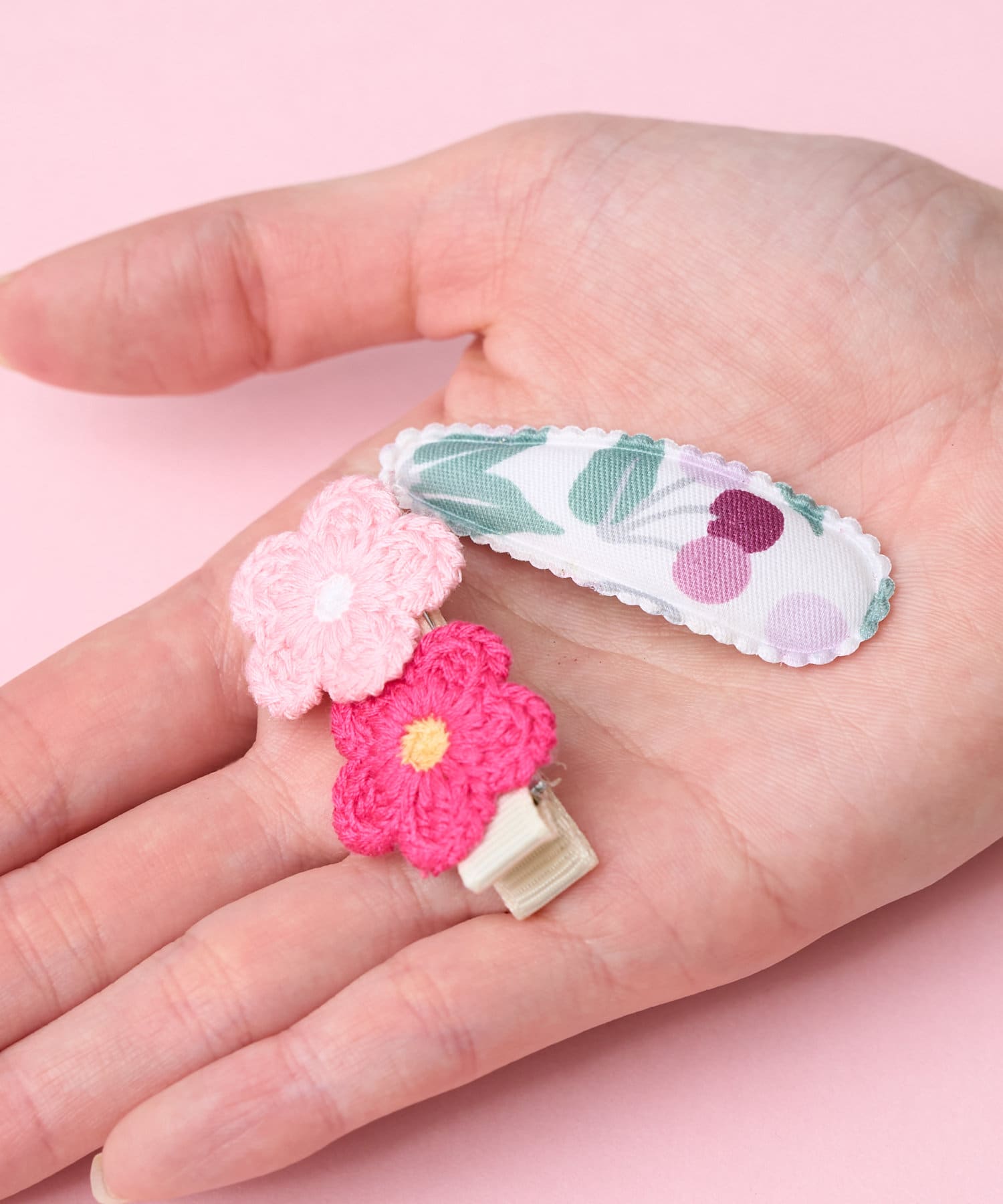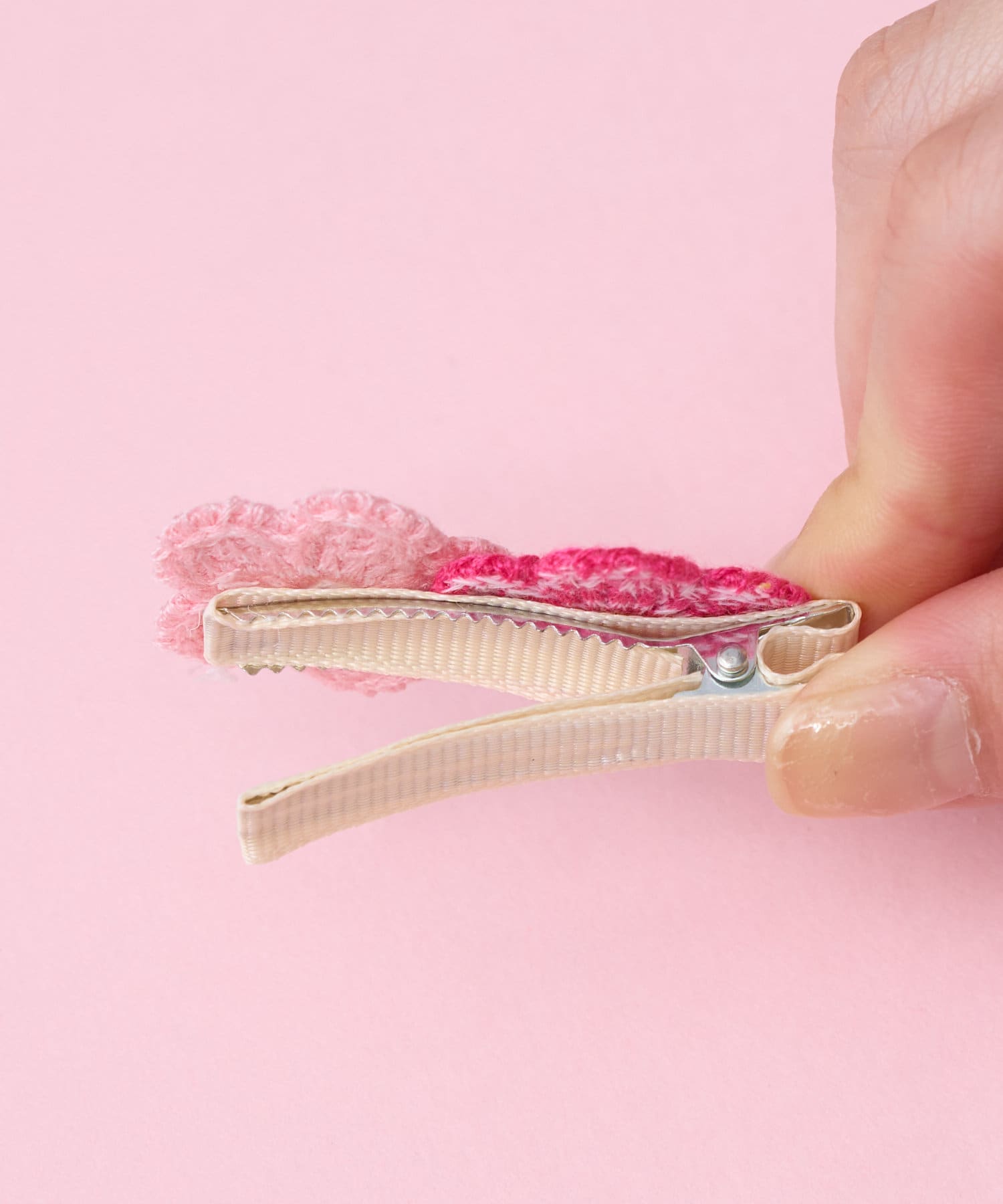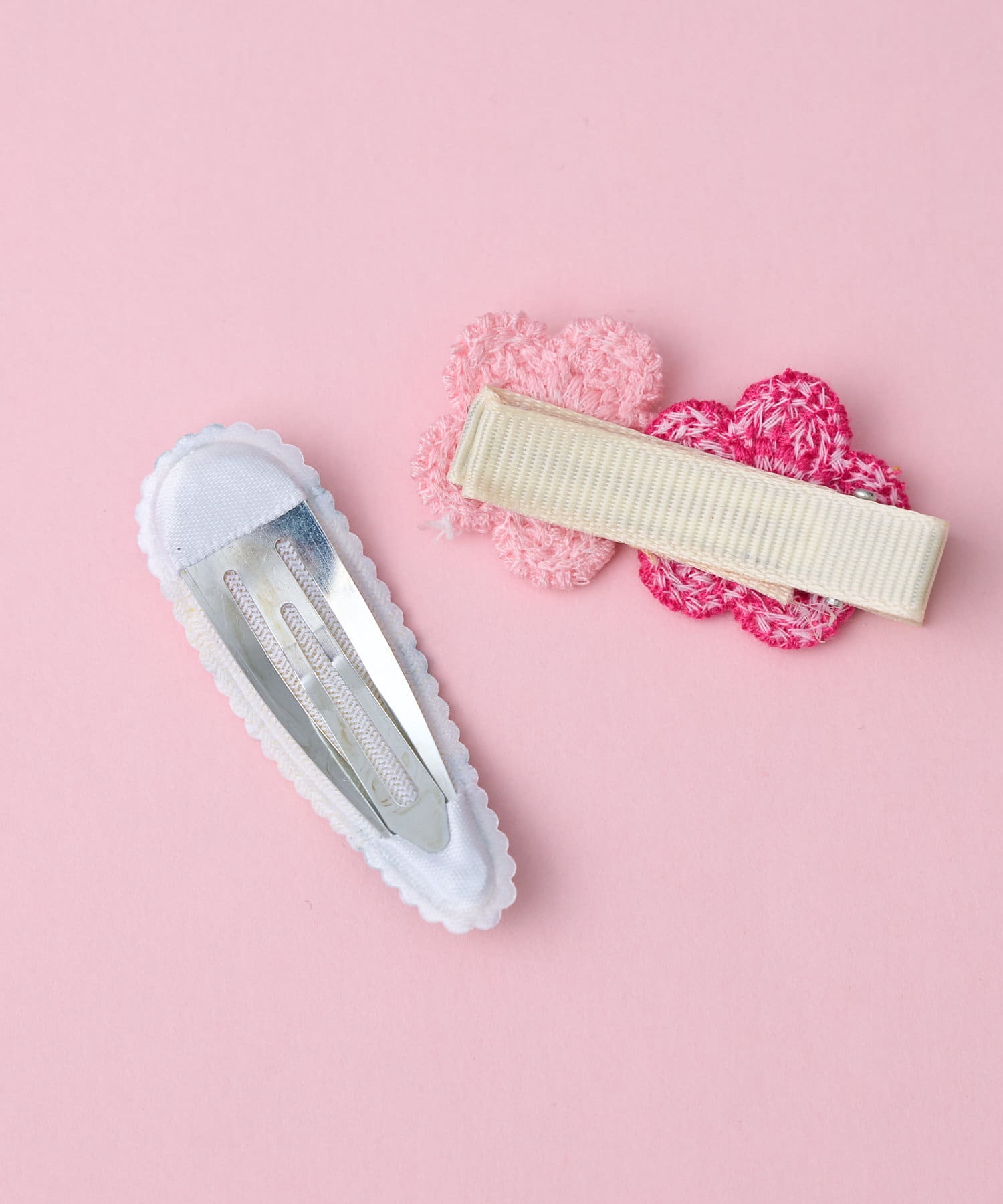 小さなお子さまにもぴったりな、丁寧に編まれたお花モチーフ付きと、総柄が可愛いヘアクリップ2点セット。