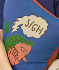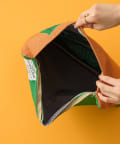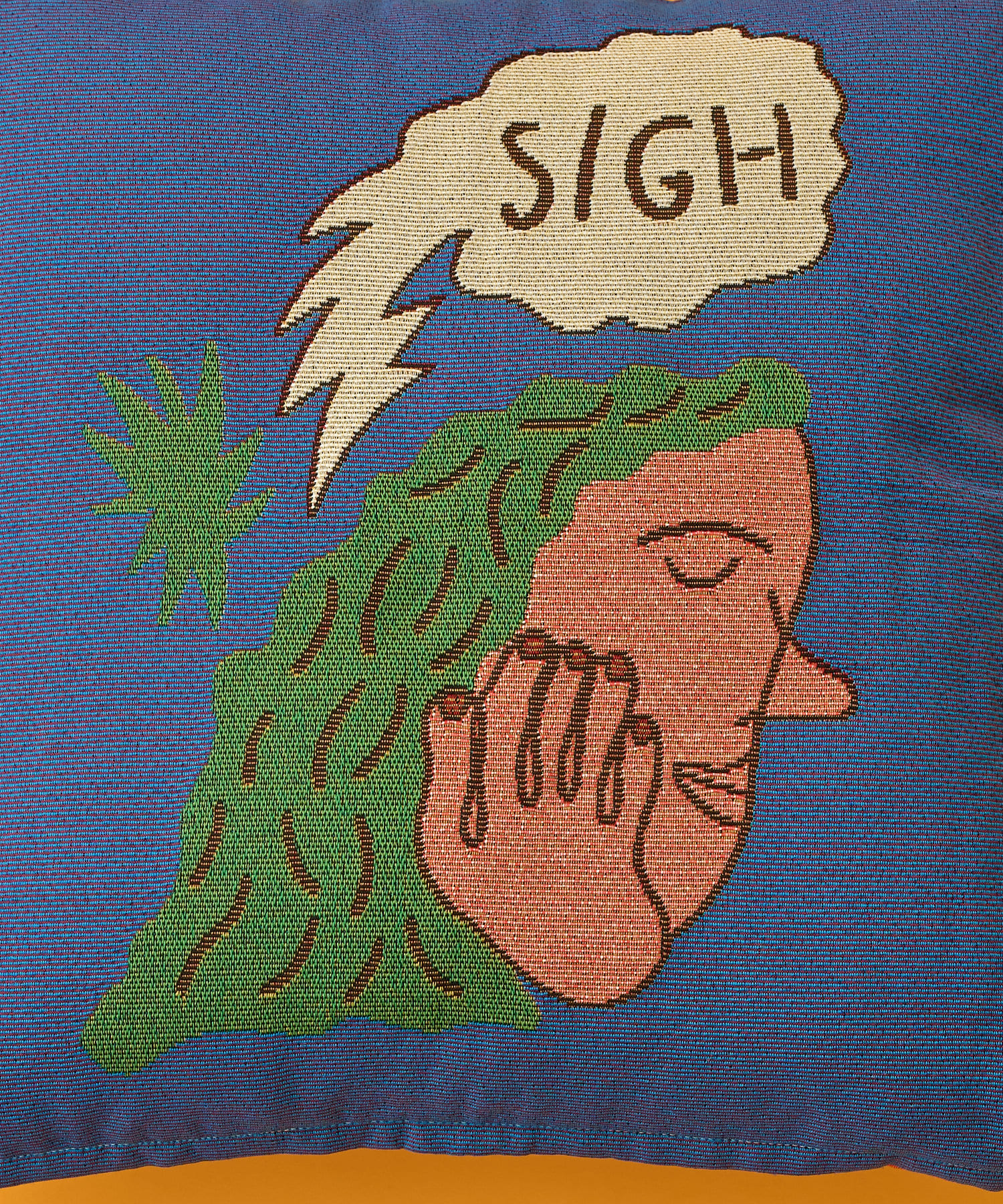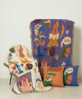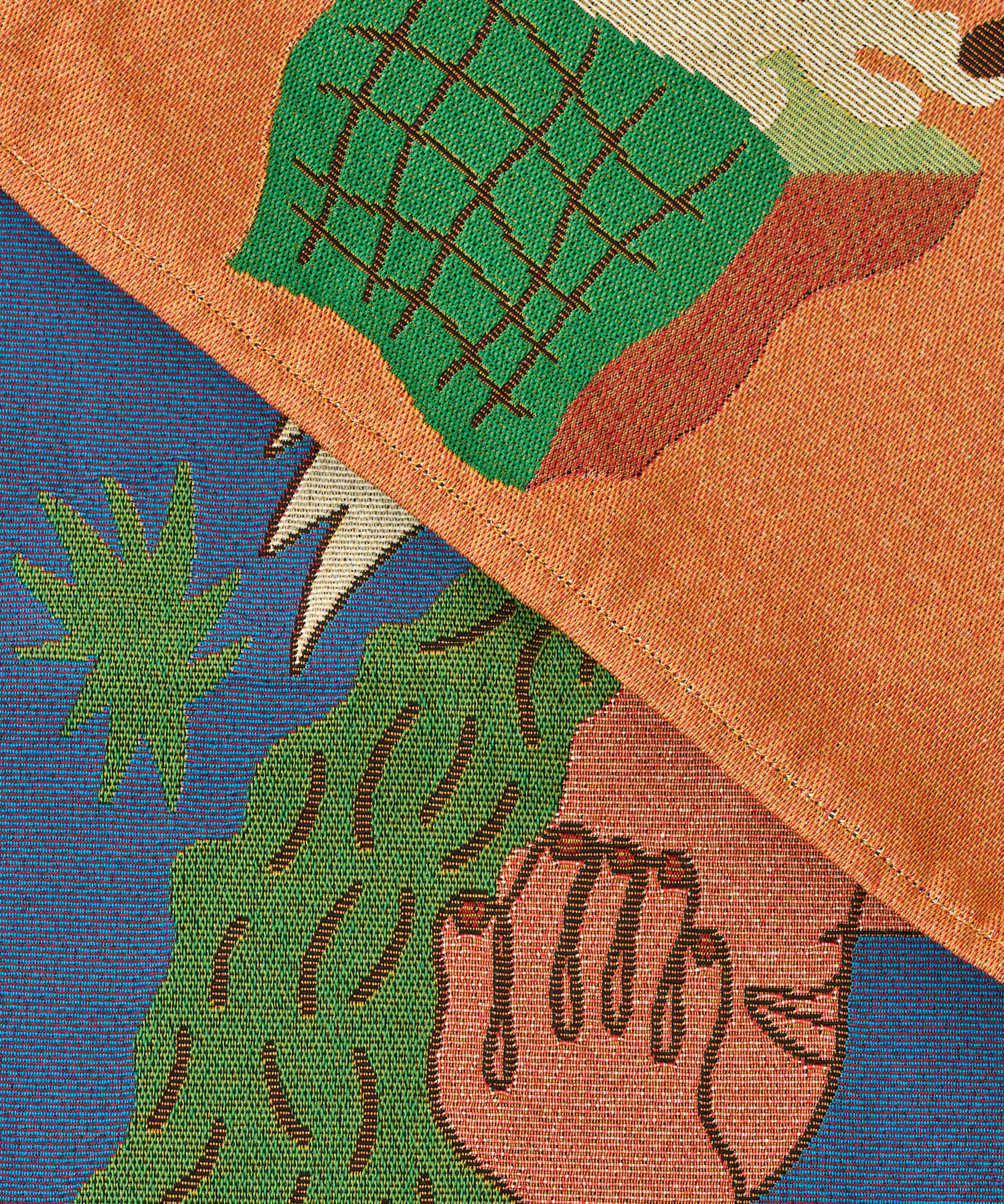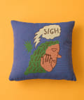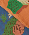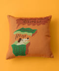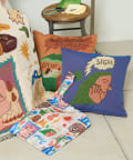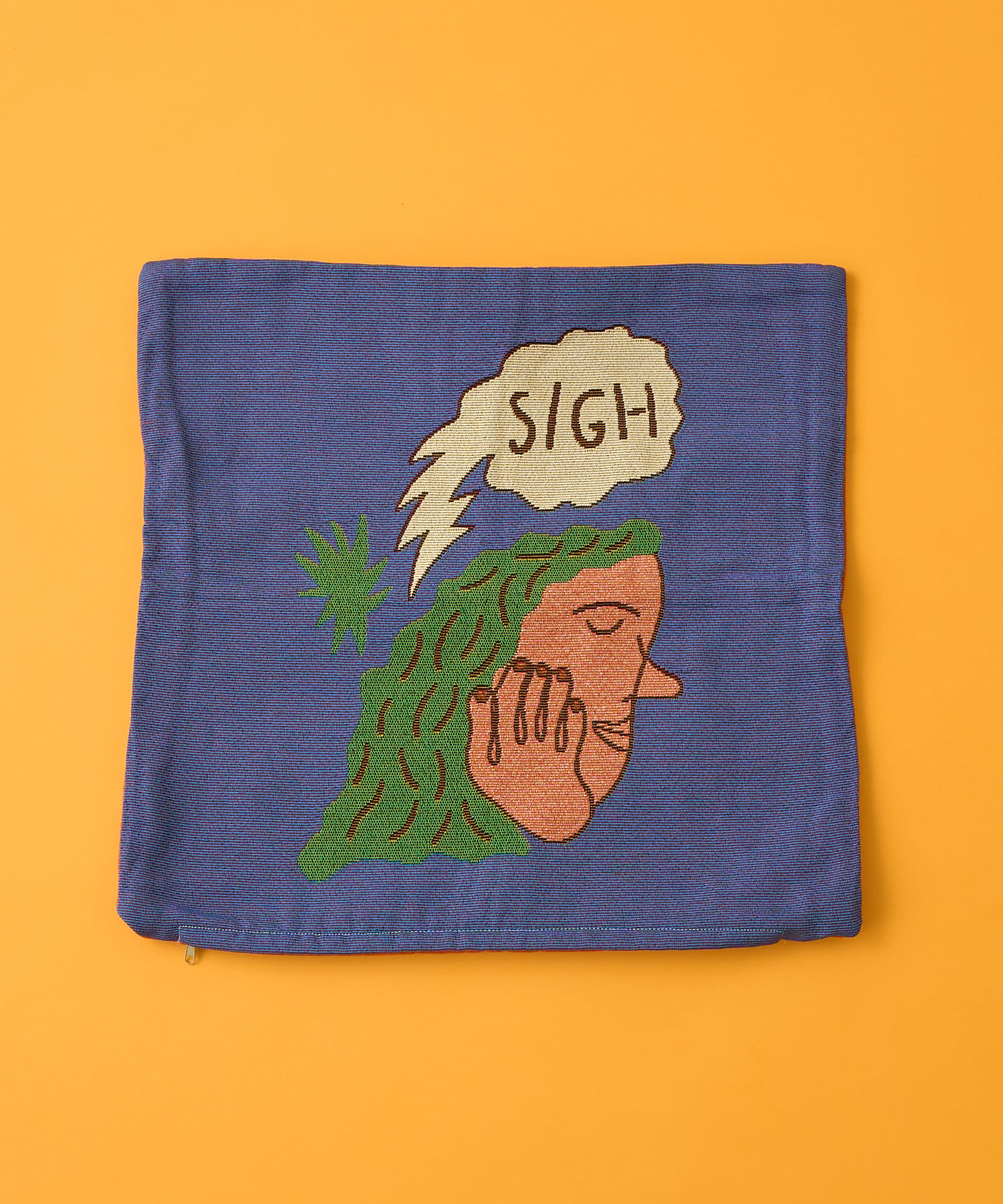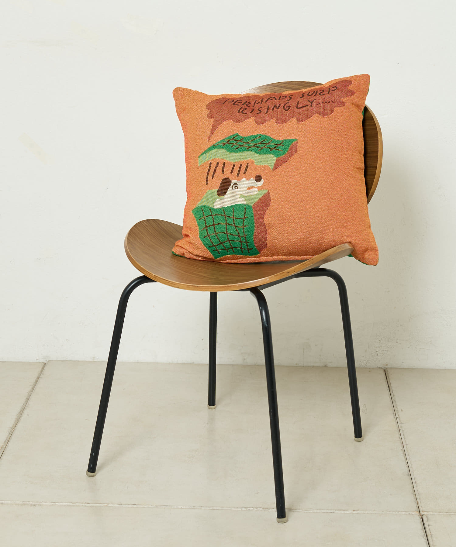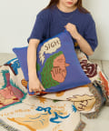 インパクトのあるアートを使用したクッションカバー。表裏のカラーがバイカラーなのもデザインのポイント。