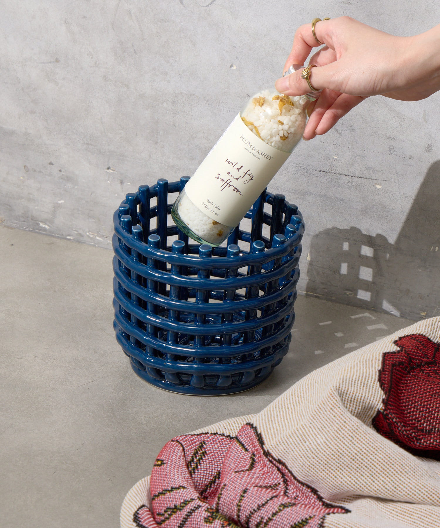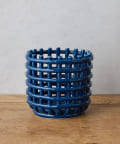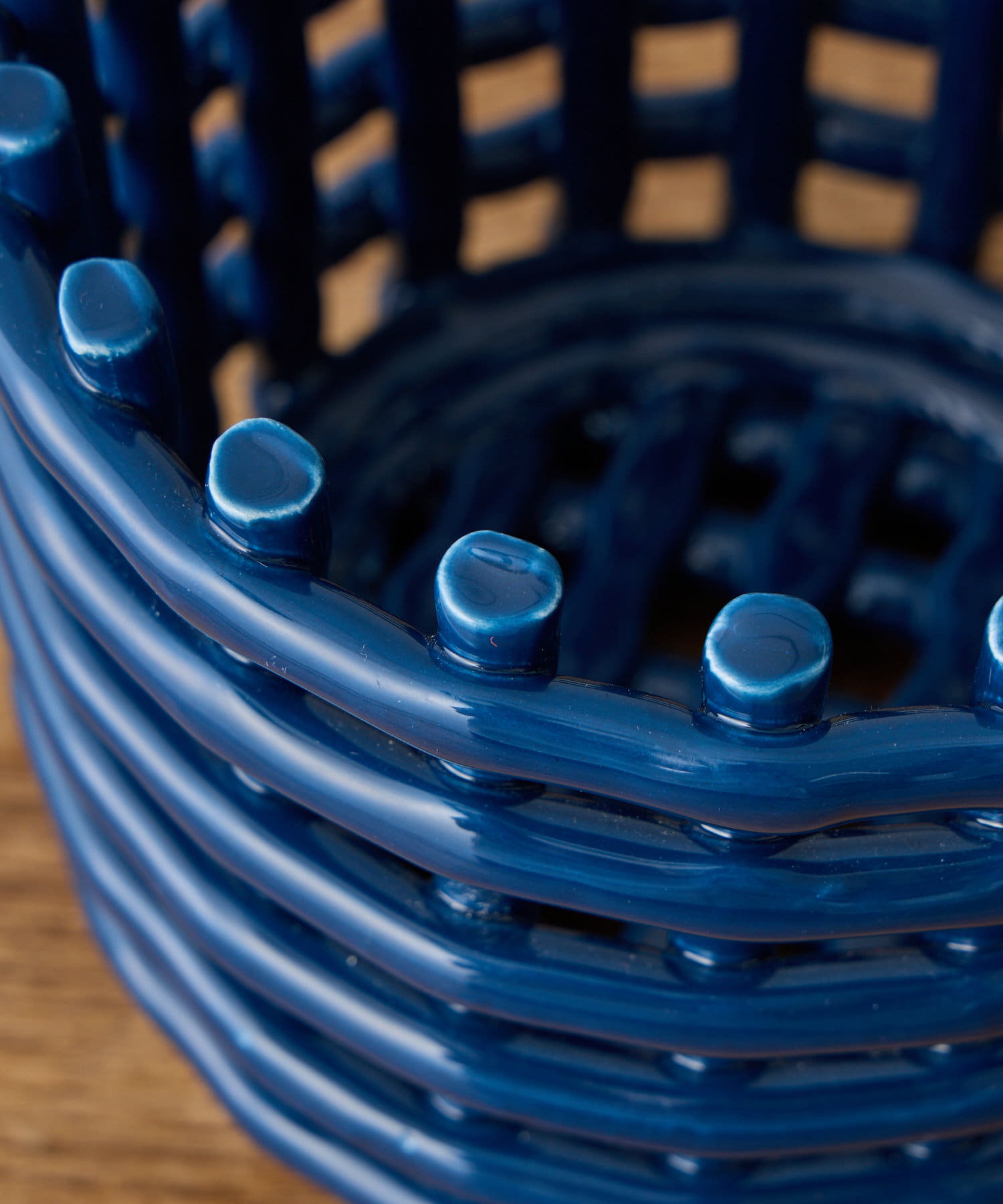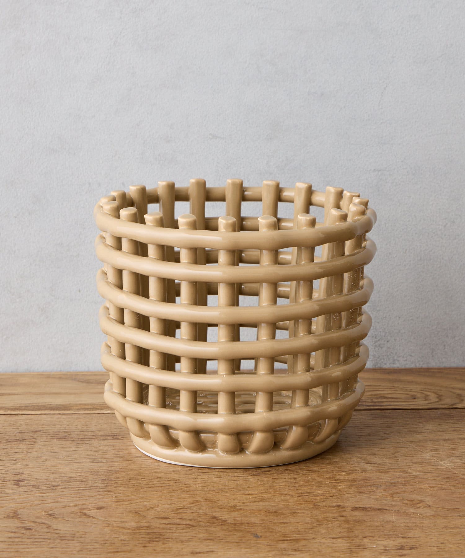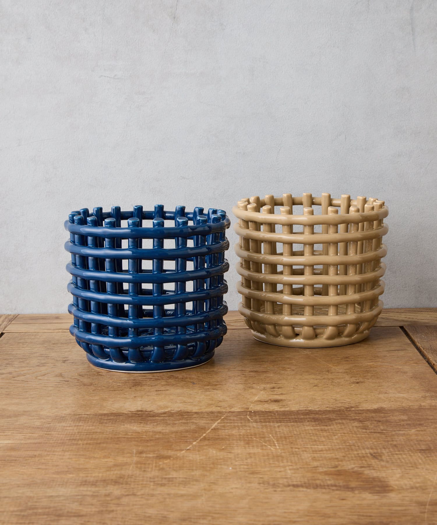 陶器のラウンドバスケット。 土っぽい質感と、厚手でずっしりと重みがあるのが特徴です。