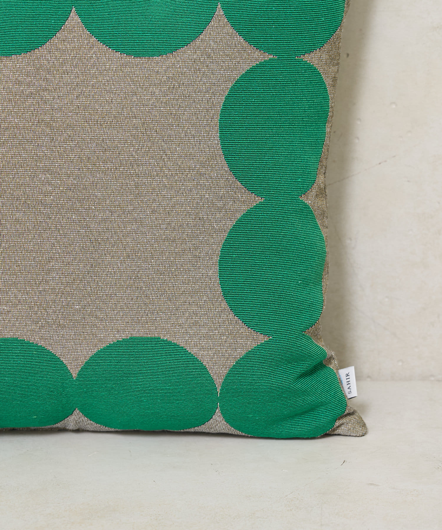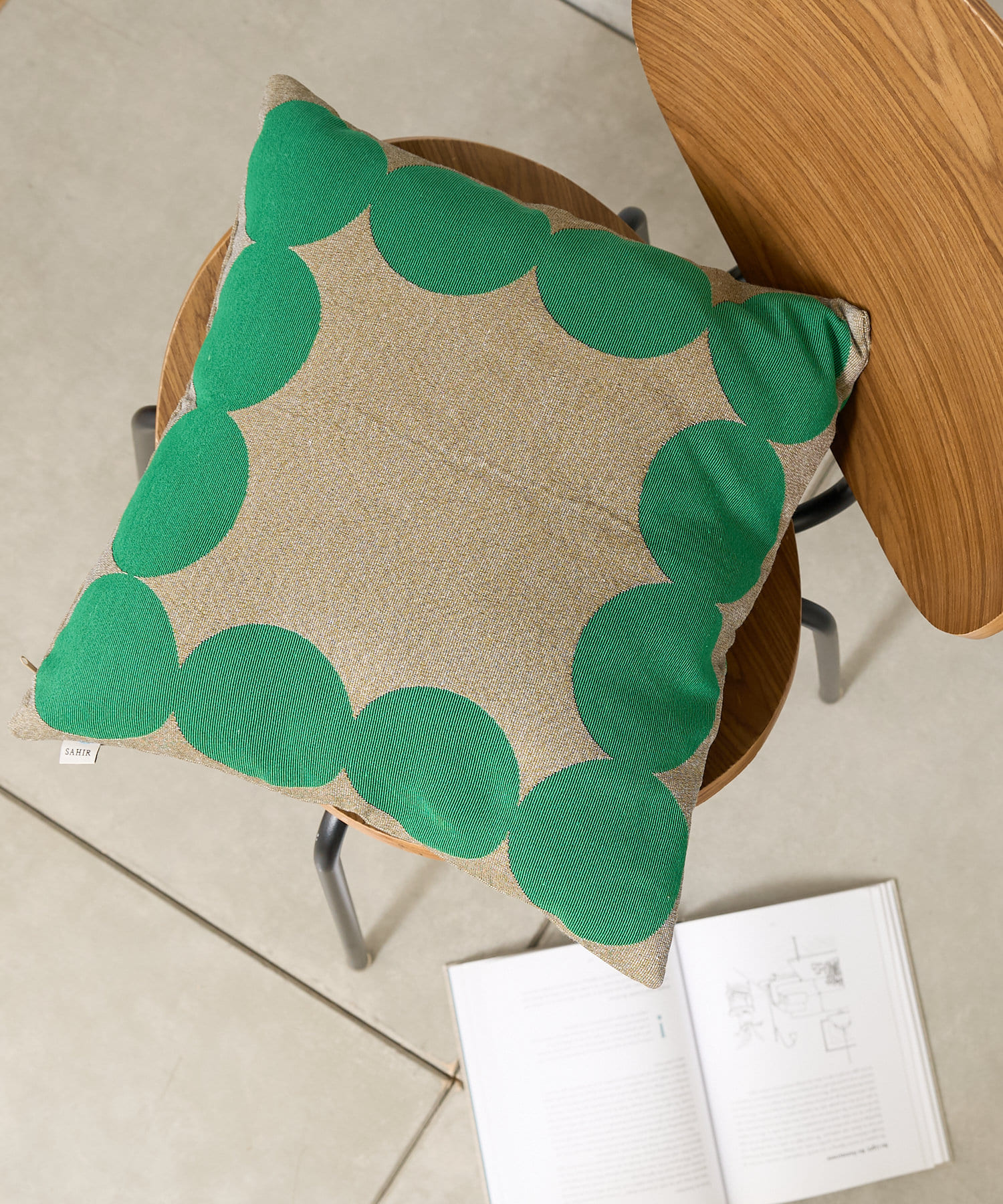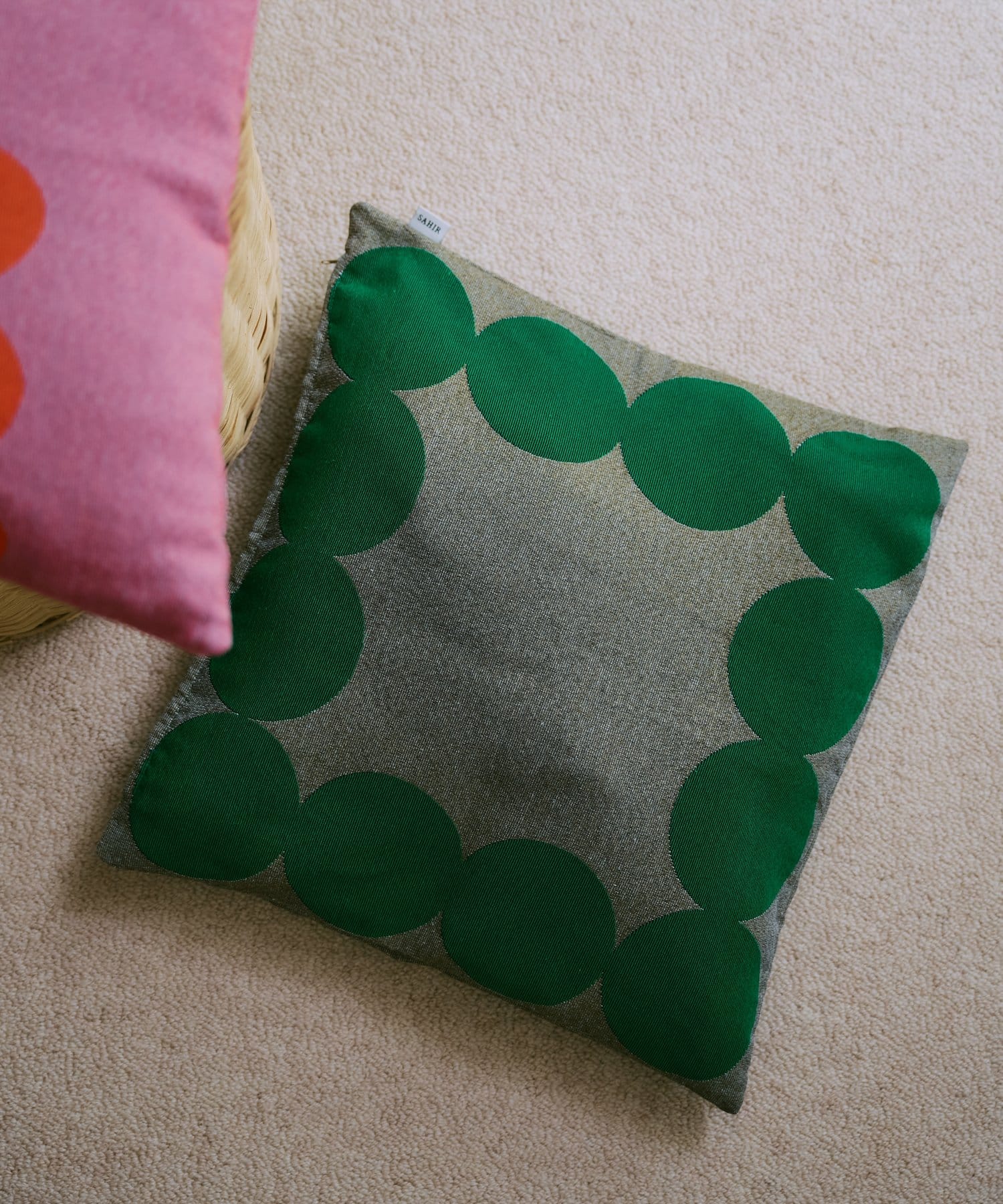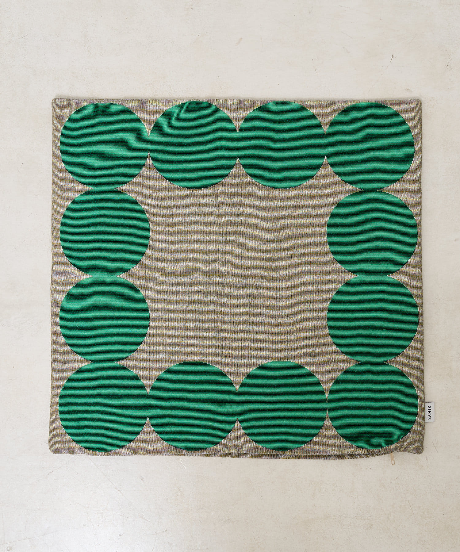 クッションカバーは本体が四角いので、○と△を使ったデザインを入れてみたいというSAHIRディレクターの遊びごころが込められています。