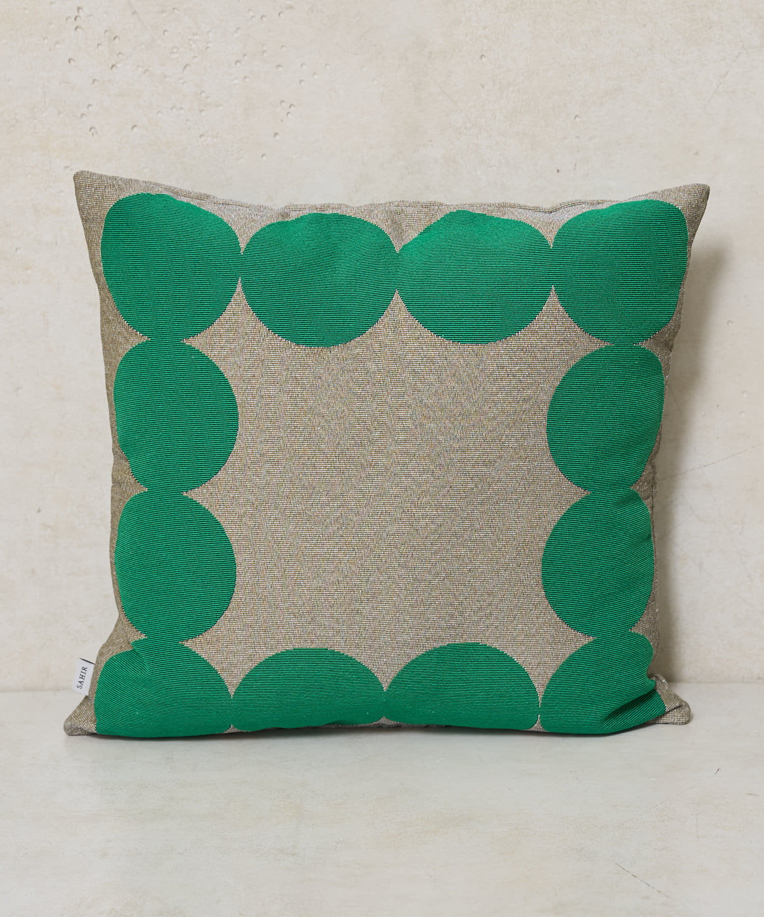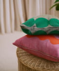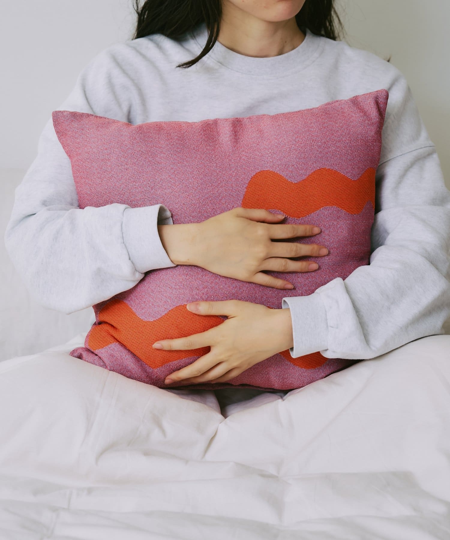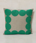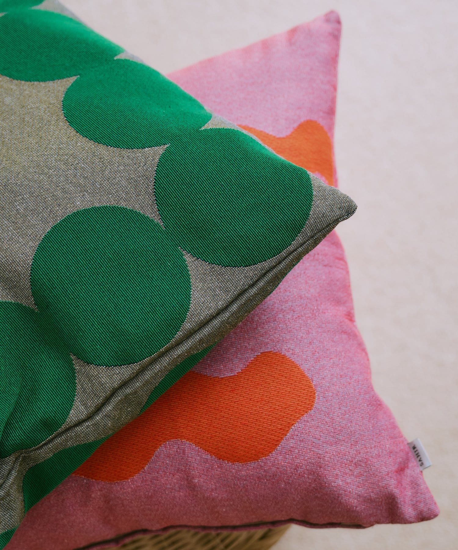 クッションカバーは本体が四角いので、○と△を使ったデザインを入れてみたいというSAHIRディレクターの遊びごころが込められています。