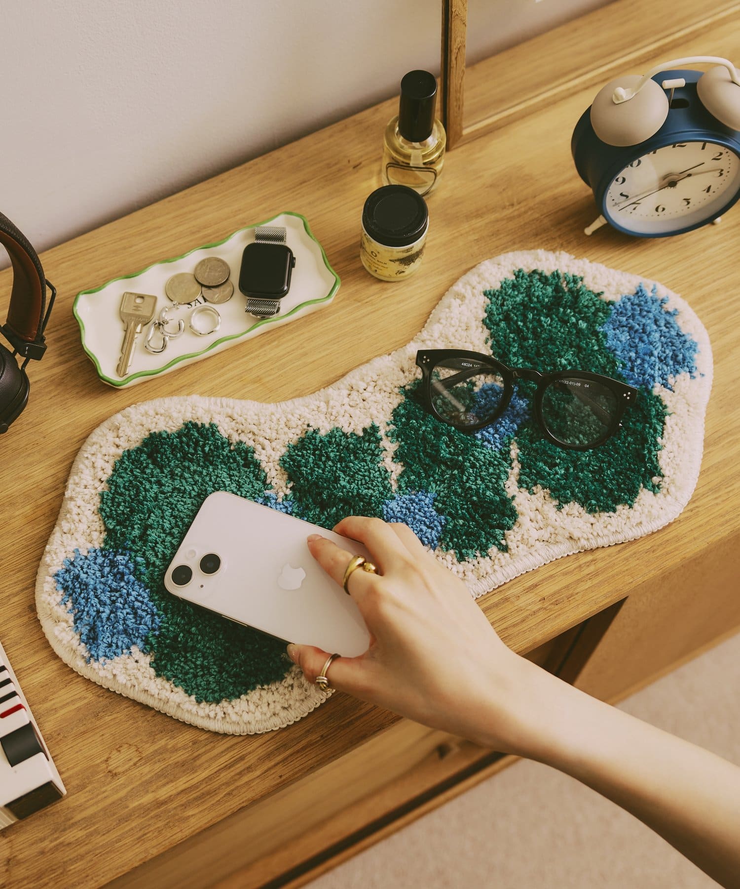 キーやアクセサリーを置いたり、パソコン前に敷いてひじ置きにしたり、様々な場面で活躍します。