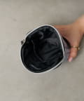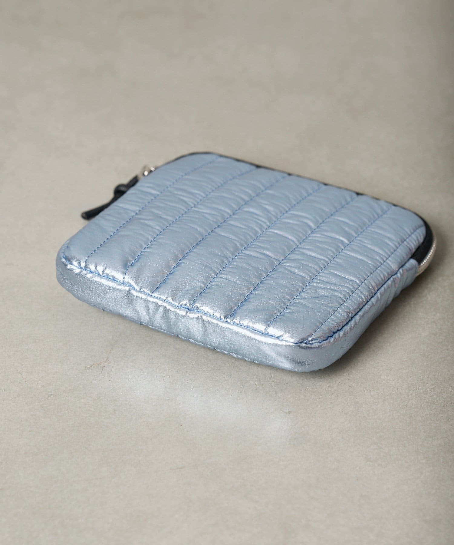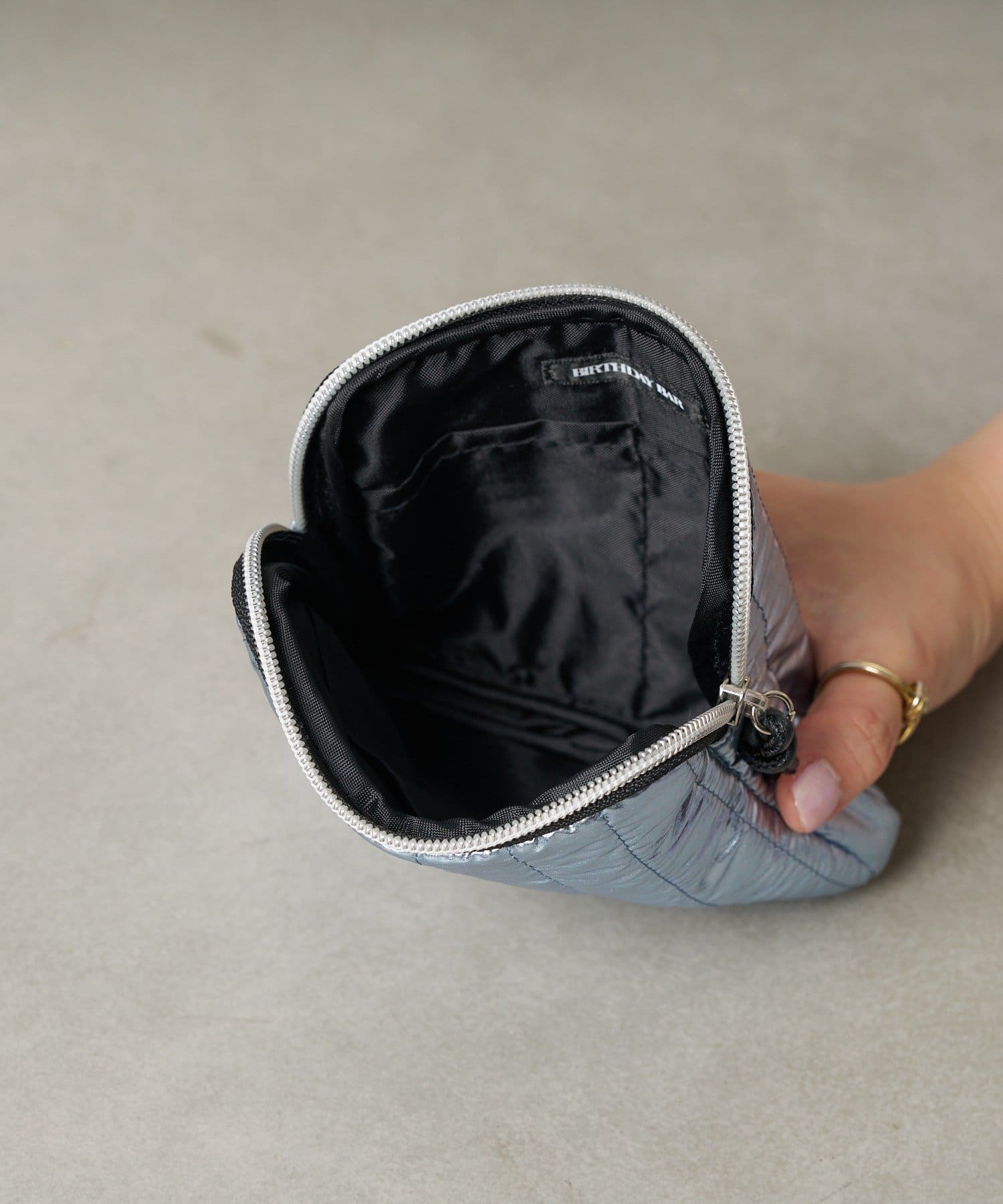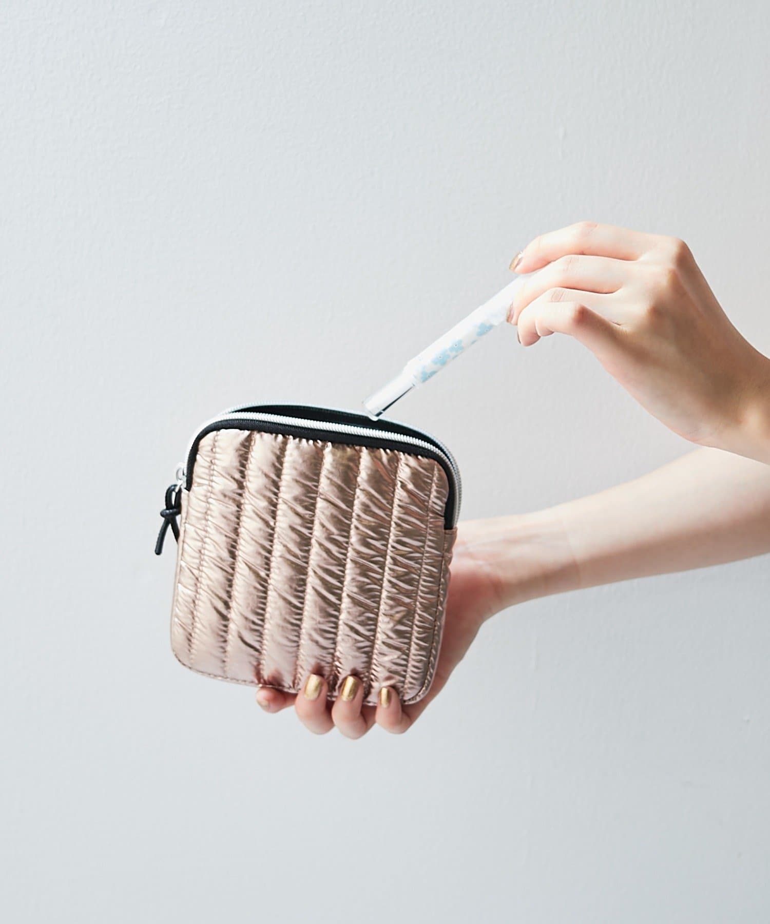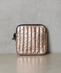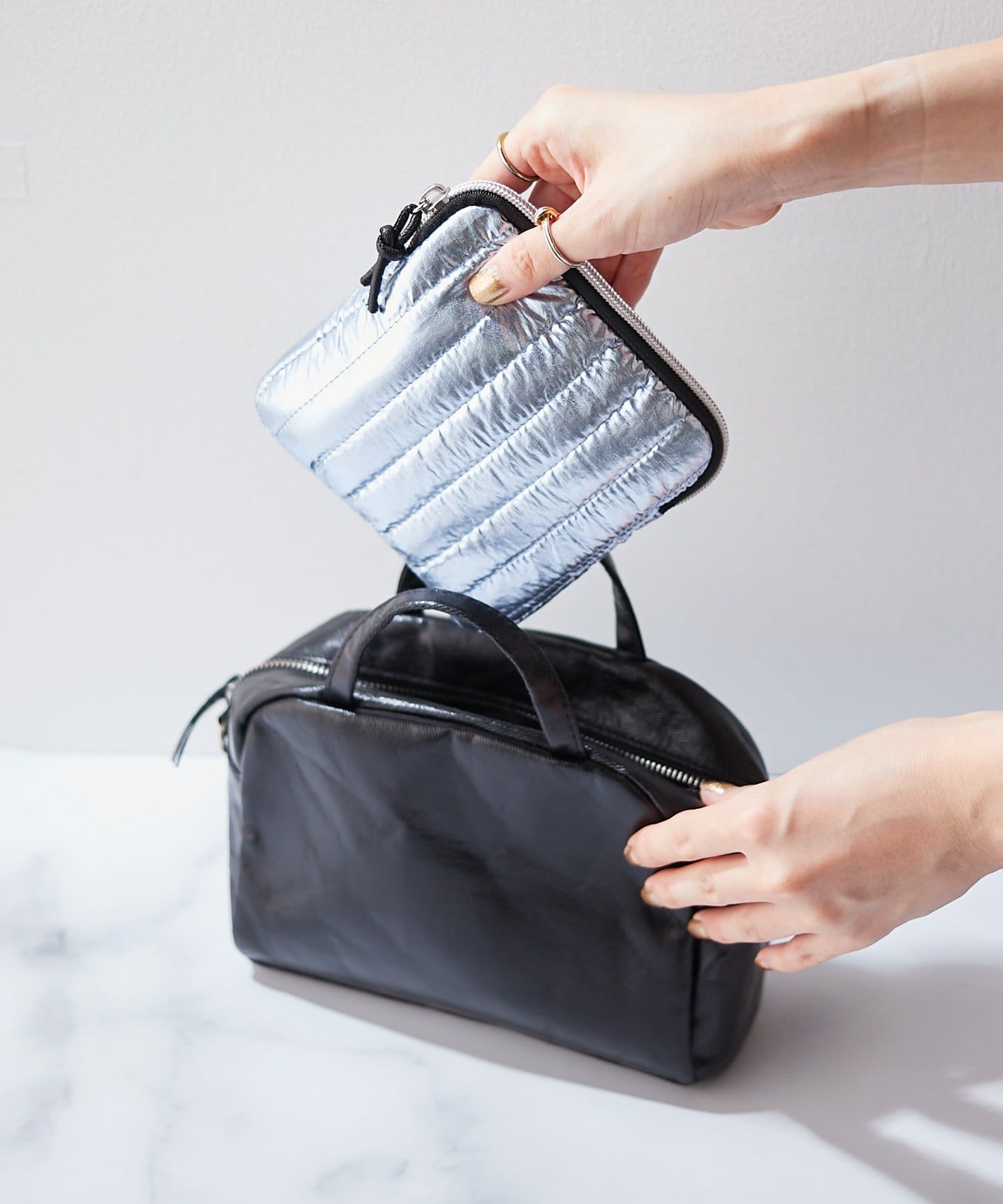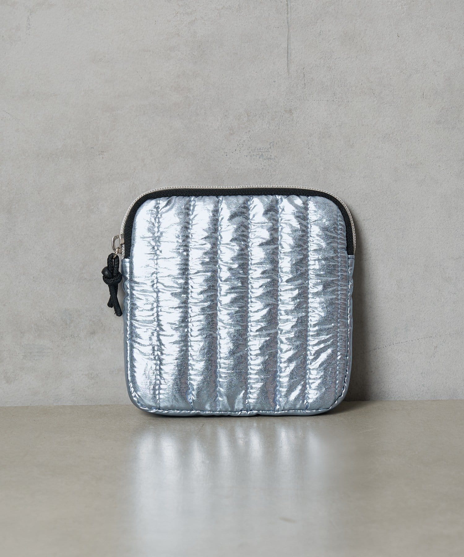 光沢感のあるキルティング生地が目を惹くスクエアポーチ
