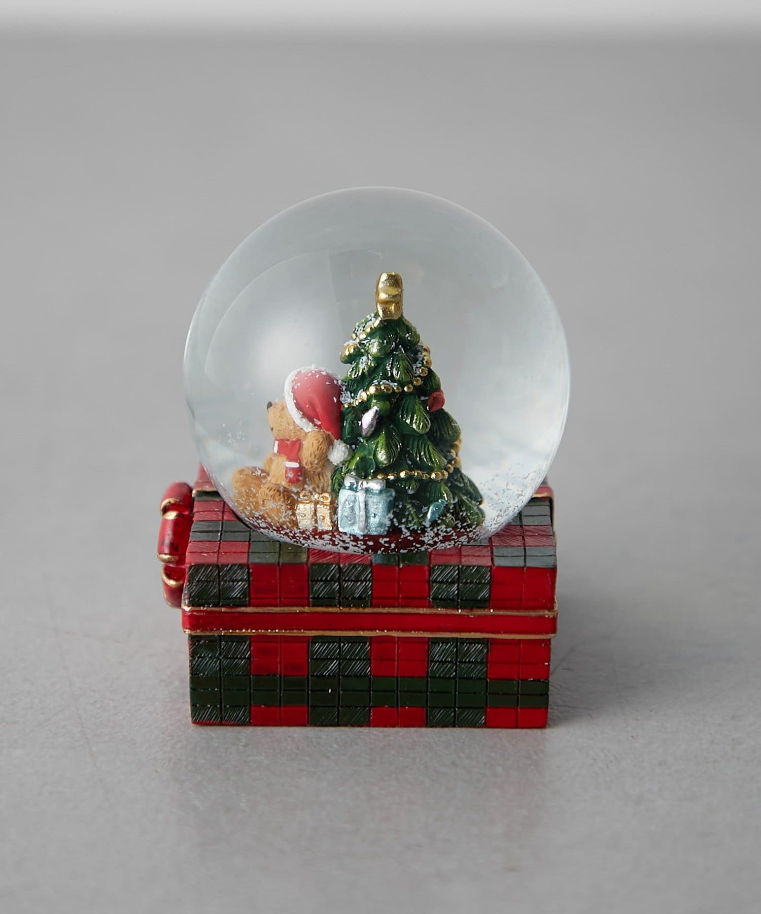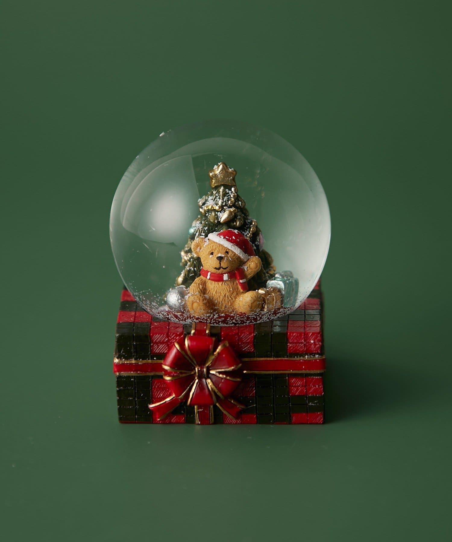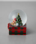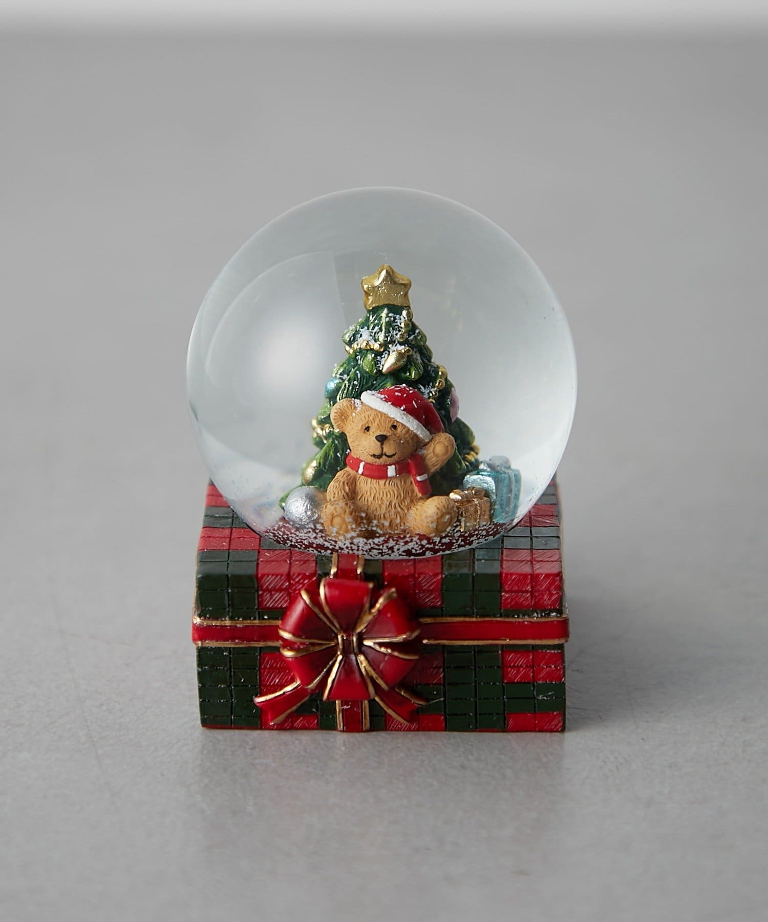 プレゼントボックス、ツリー、ベアーといったクリスマスらしいモチーフを詰め込んだスノードーム。