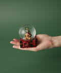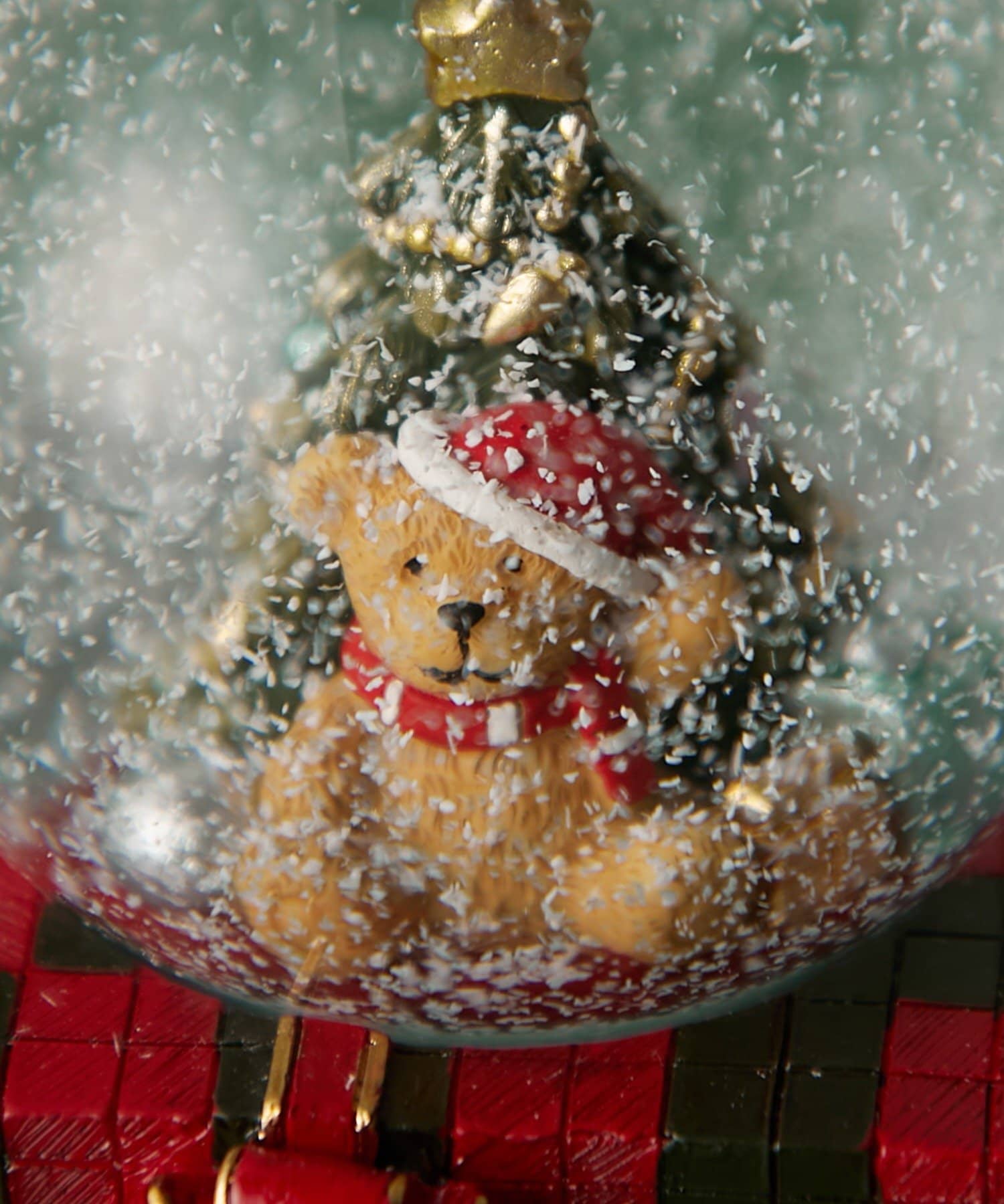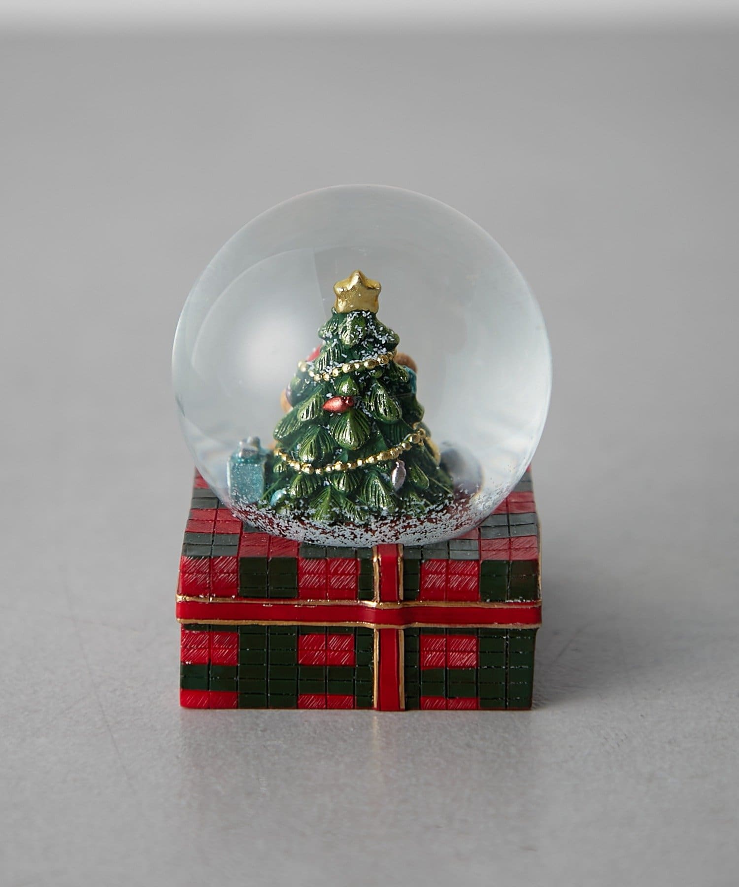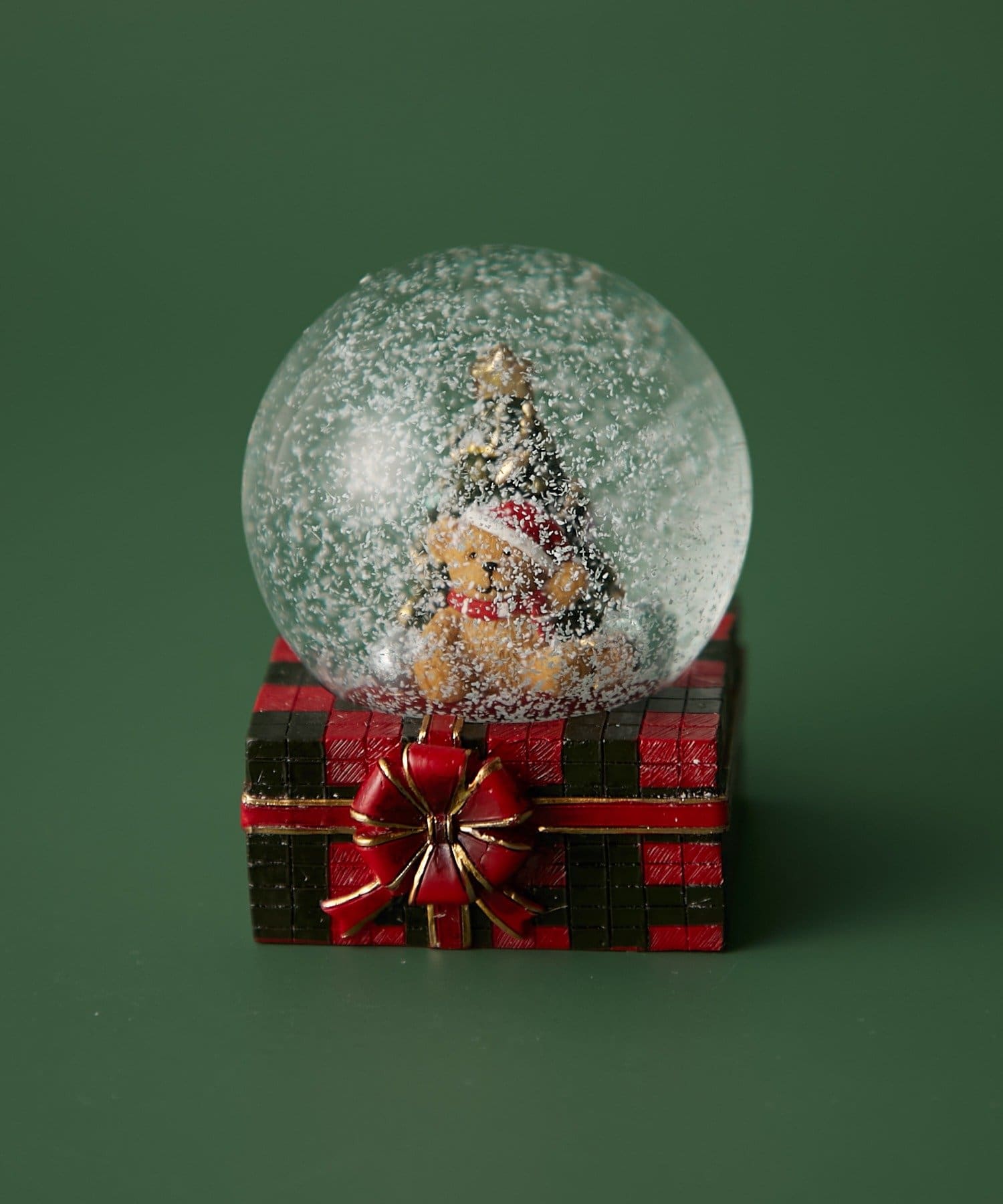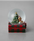プレゼントボックス、ツリー、ベアーといったクリスマスらしいモチーフを詰め込んだスノードーム。
