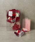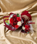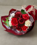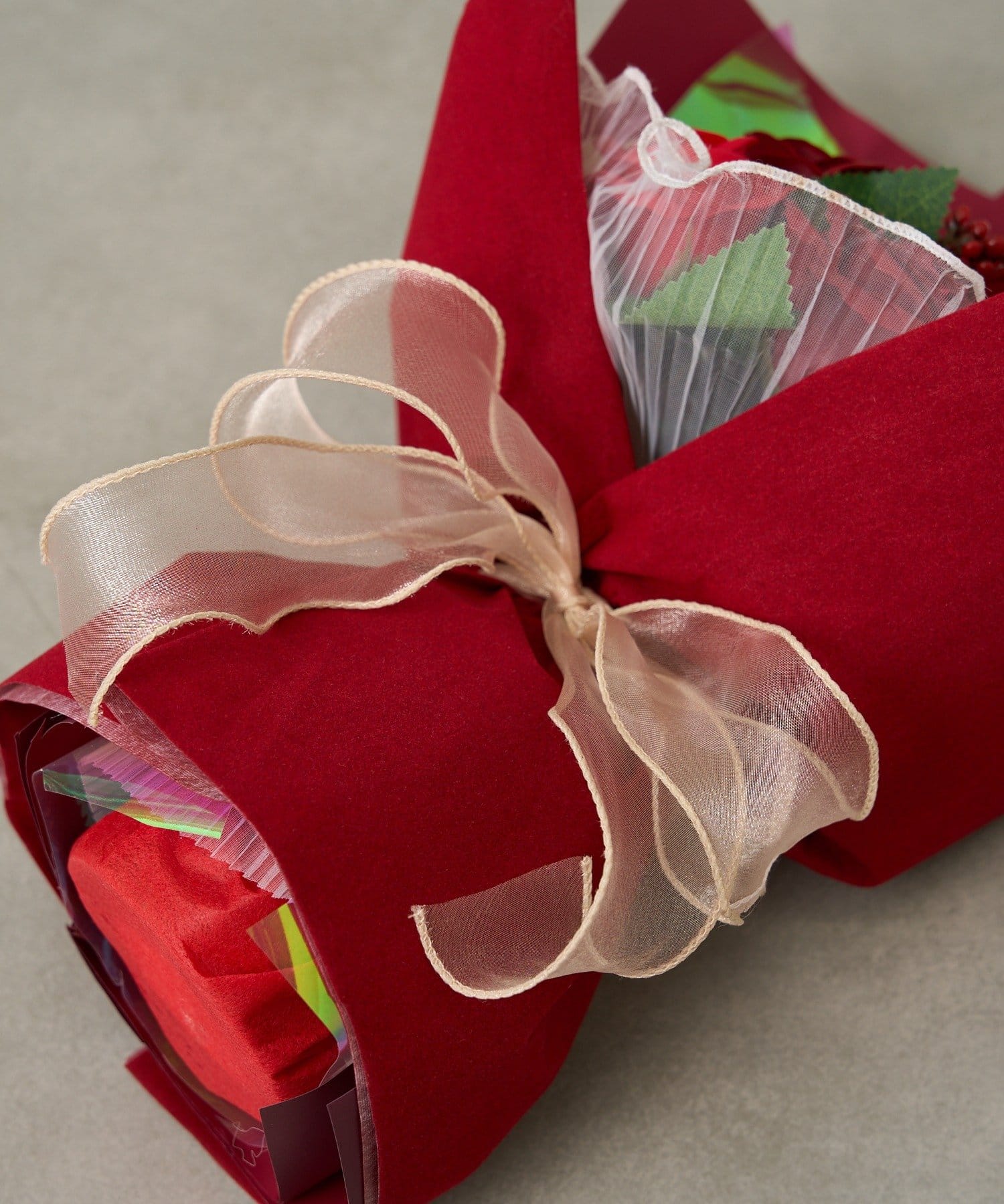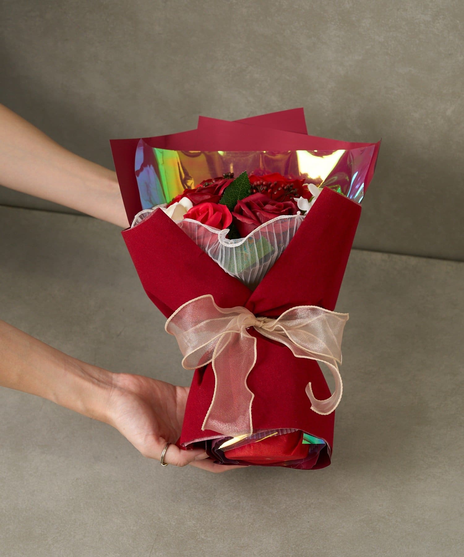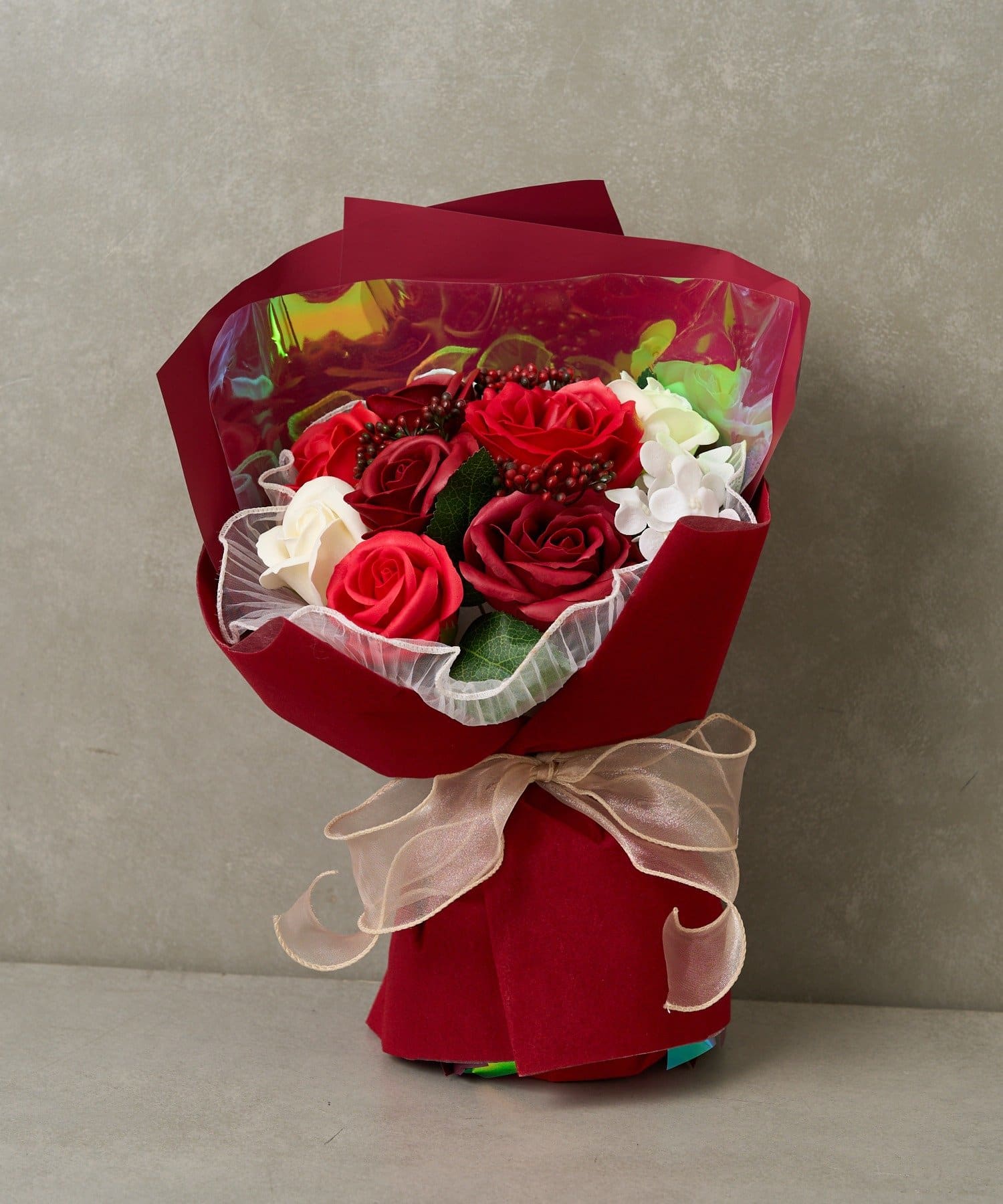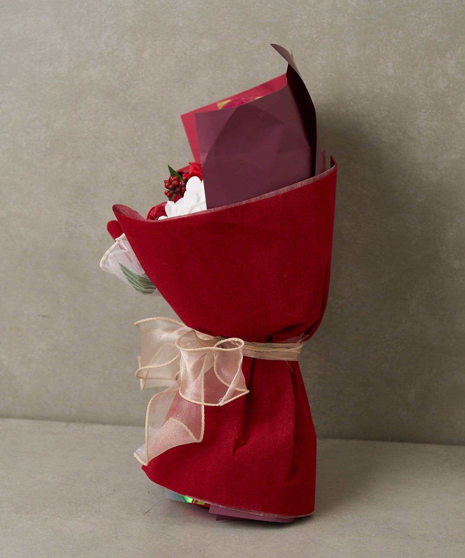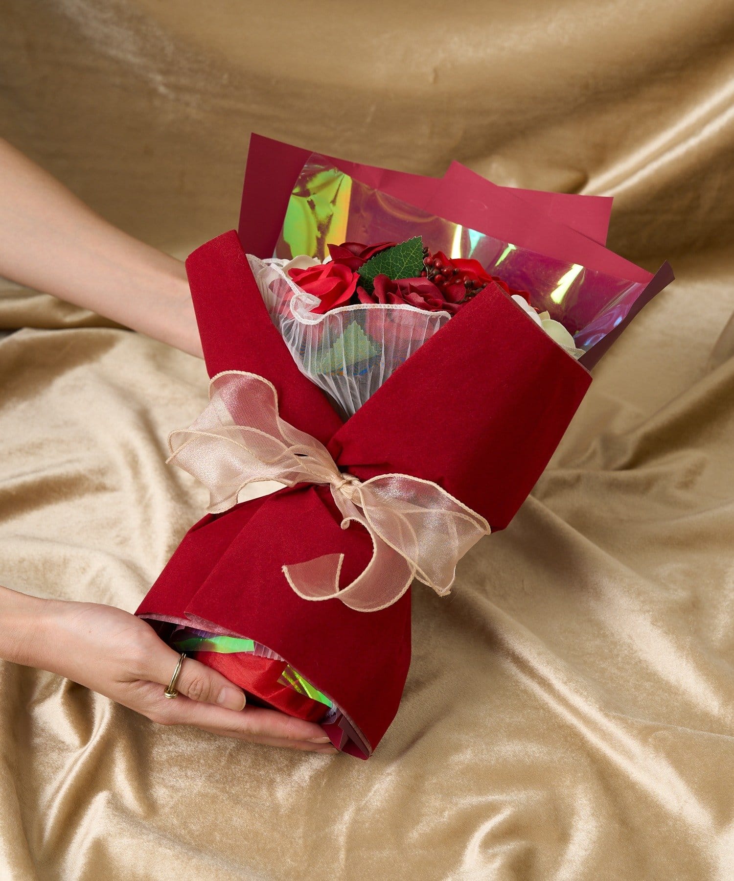まるで本物の花のように繊細に仕上げられたソープフラワーを、クリスマスカラーでまとめた華やかなブーケ。