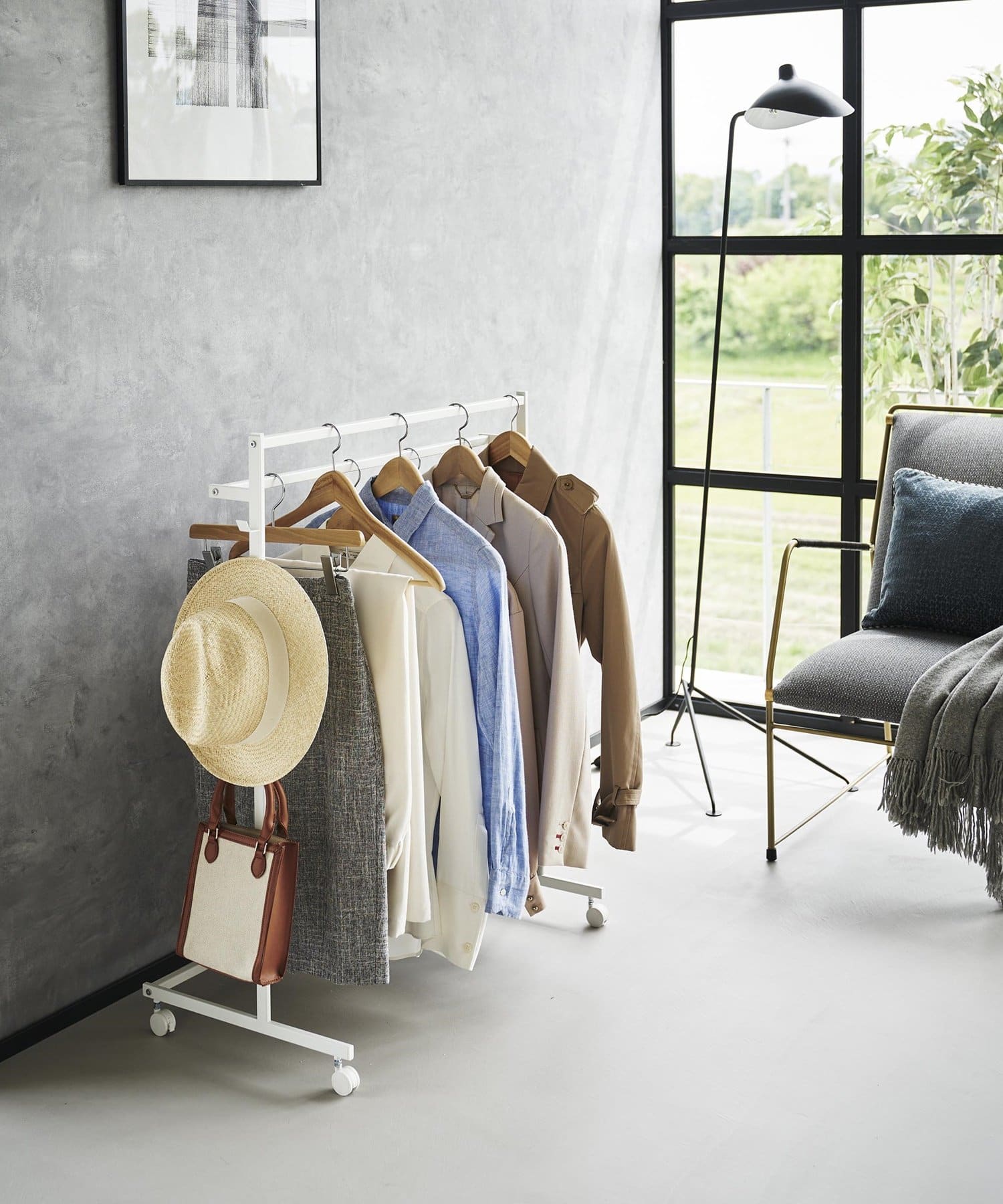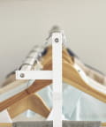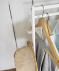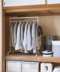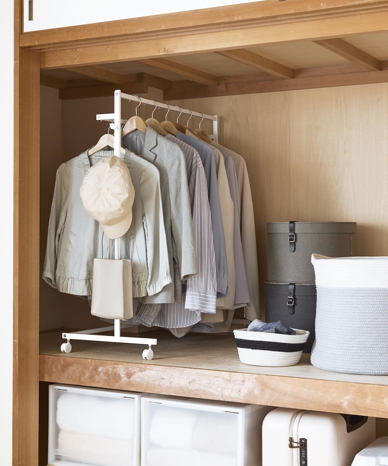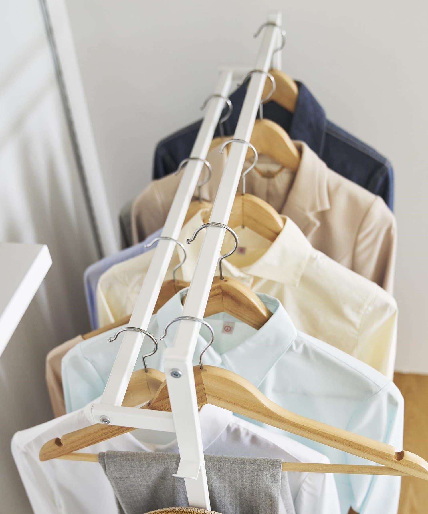 2段のバーで段違いに位置をずらして収納するので肩部分の厚みが減り収納力UP!押入れ内、縦・横どちらの向きでも収納できるので空きスペースを有効活用できます。サイドの4連フックは左右どちらにも取り付け可能、帽子やミニバッグの収納に便利です。上段、下段に服を掛ければ、服の見分けがつきやすく支度もスムーズ。