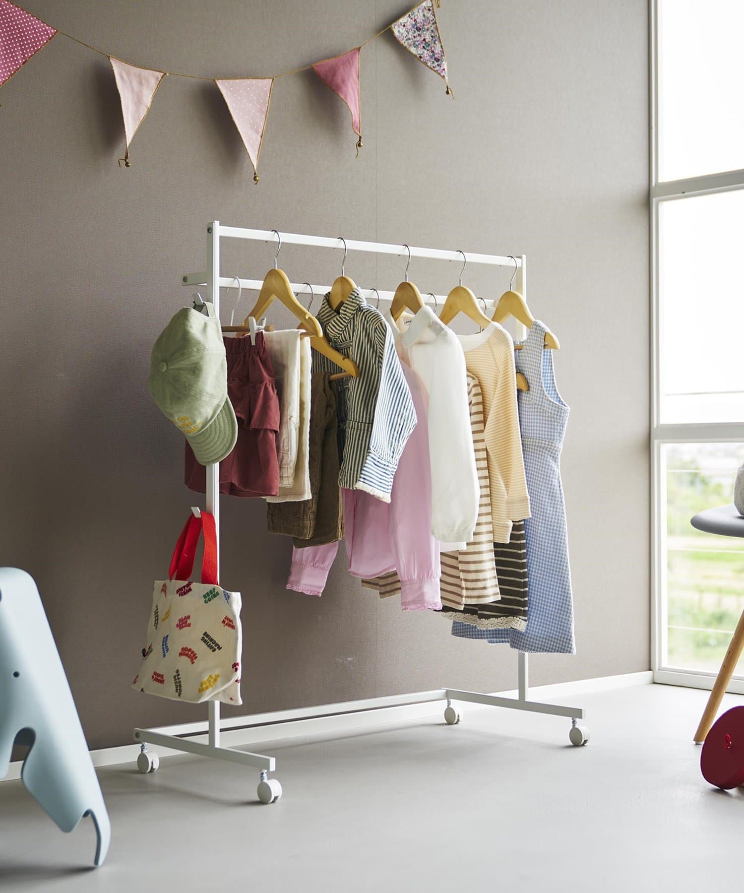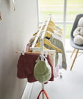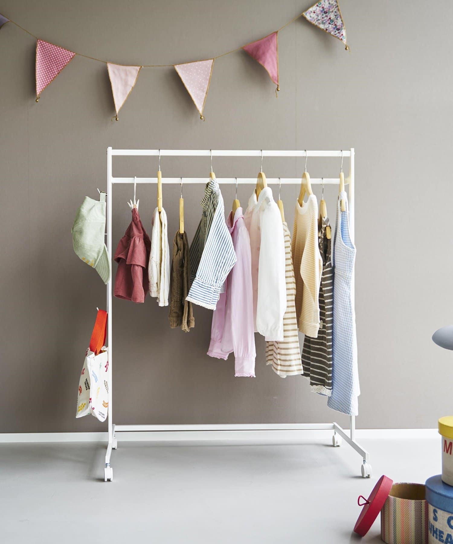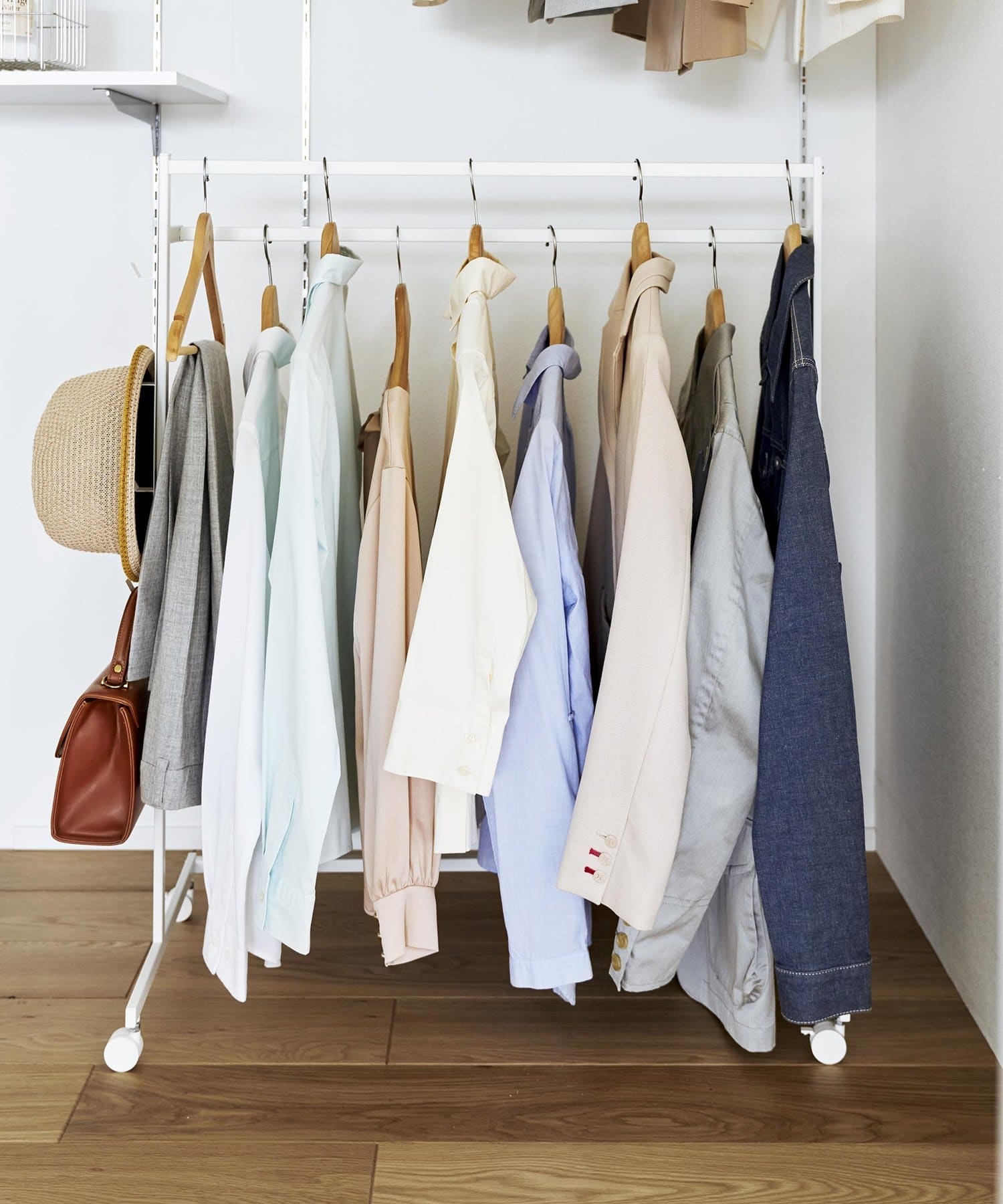 2段のバーで段違いに位置をずらして収納するので肩部分の厚みが減り収納力UP!押入れ内、縦・横どちらの向きでも収納できるので空きスペースを有効活用できます。サイドの4連フックは左右どちらにも取り付け可能、帽子やミニバッグの収納に便利です。上段、下段に服を掛ければ、服の見分けがつきやすく支度もスムーズ。