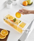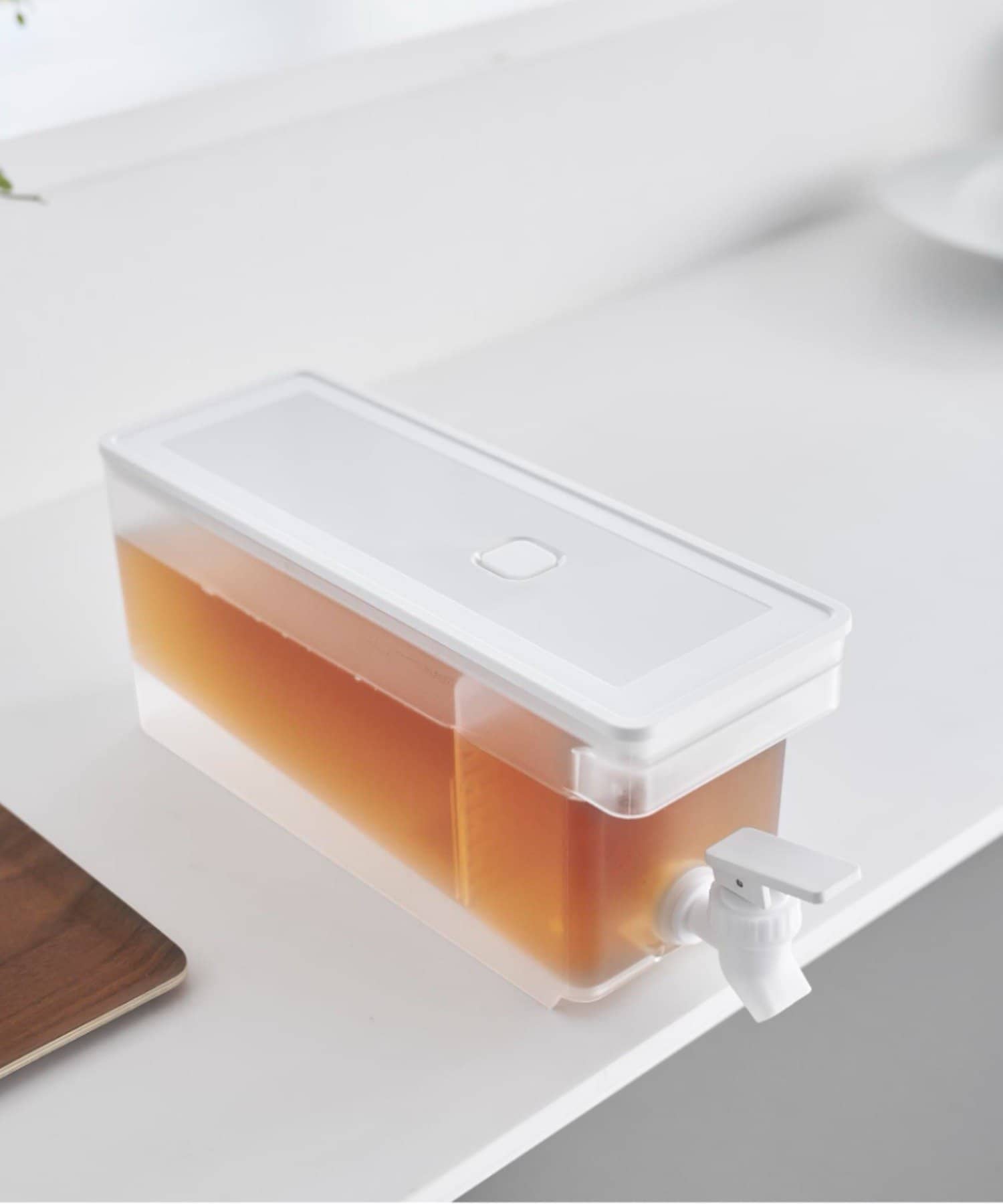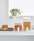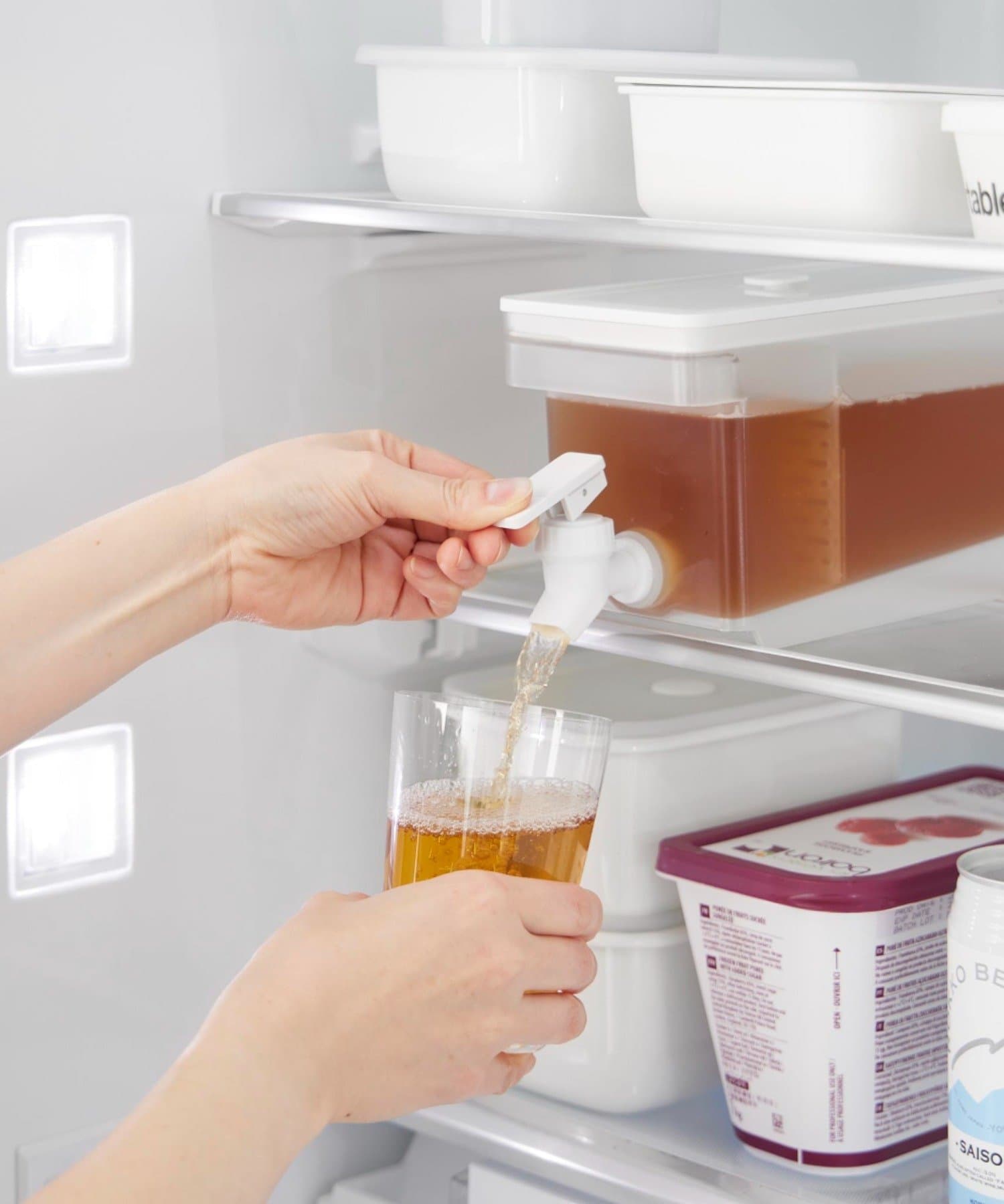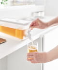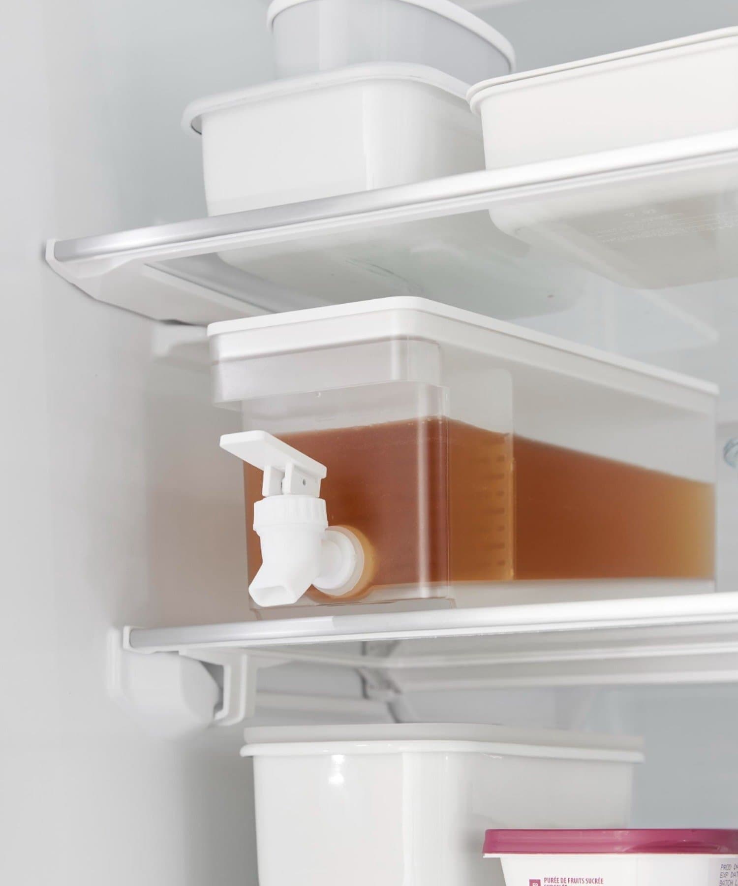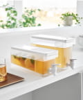 レバーを上下に倒すだけで冷たいお茶を簡単に注げる冷蔵庫ドリンクサーバーです。冷水筒を取り出さずに冷蔵庫から直接ドリンクを注げて便利。キッチンカウンターに設置すれば、いつでも手軽にお茶やフレーバーウォーターを飲むことができます。仕切りがあるのでティーパックやフレーバーウォーターの具材が注ぎ口を塞がずスムーズに注げます。レバーは上下共にロックでき、レバーから手を離して注げる点も便利です。パーツは全て分解して洗うことができるので清潔に保て、食洗機にも対応しています。同じシリーズで2.8Lの大容量タイプもございます。別ページをご覧ください。