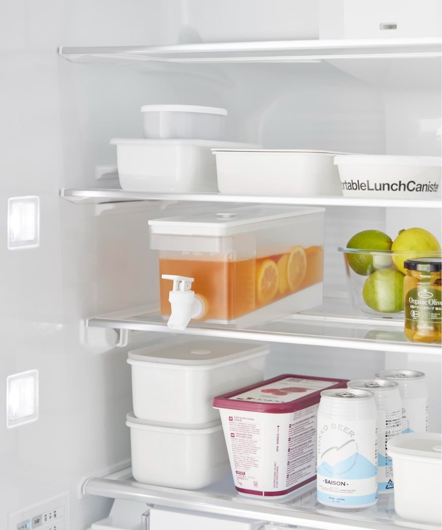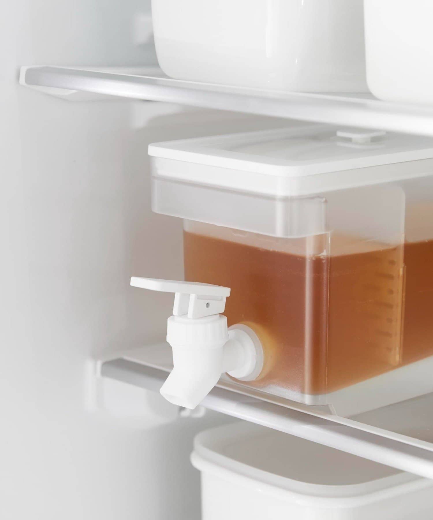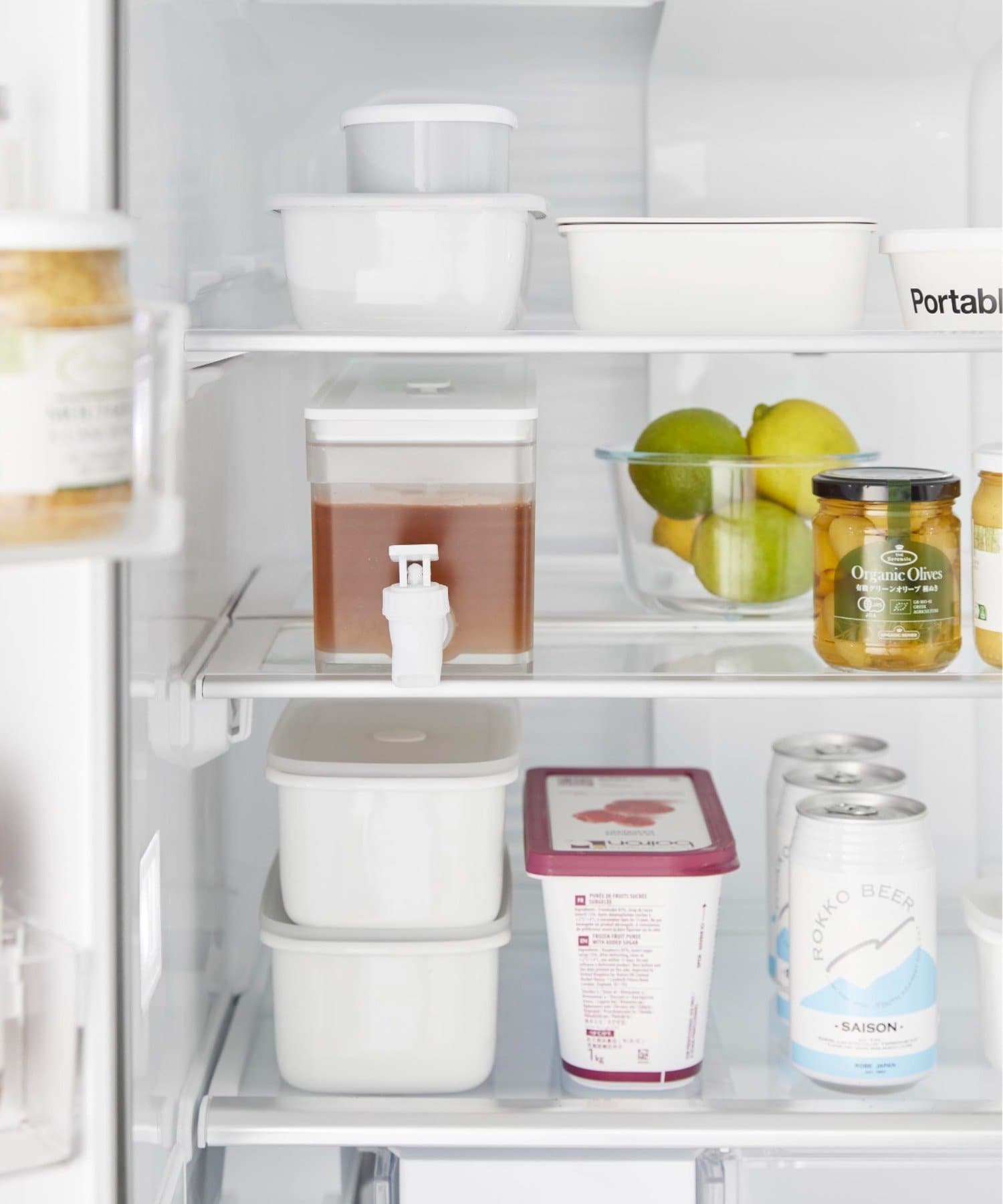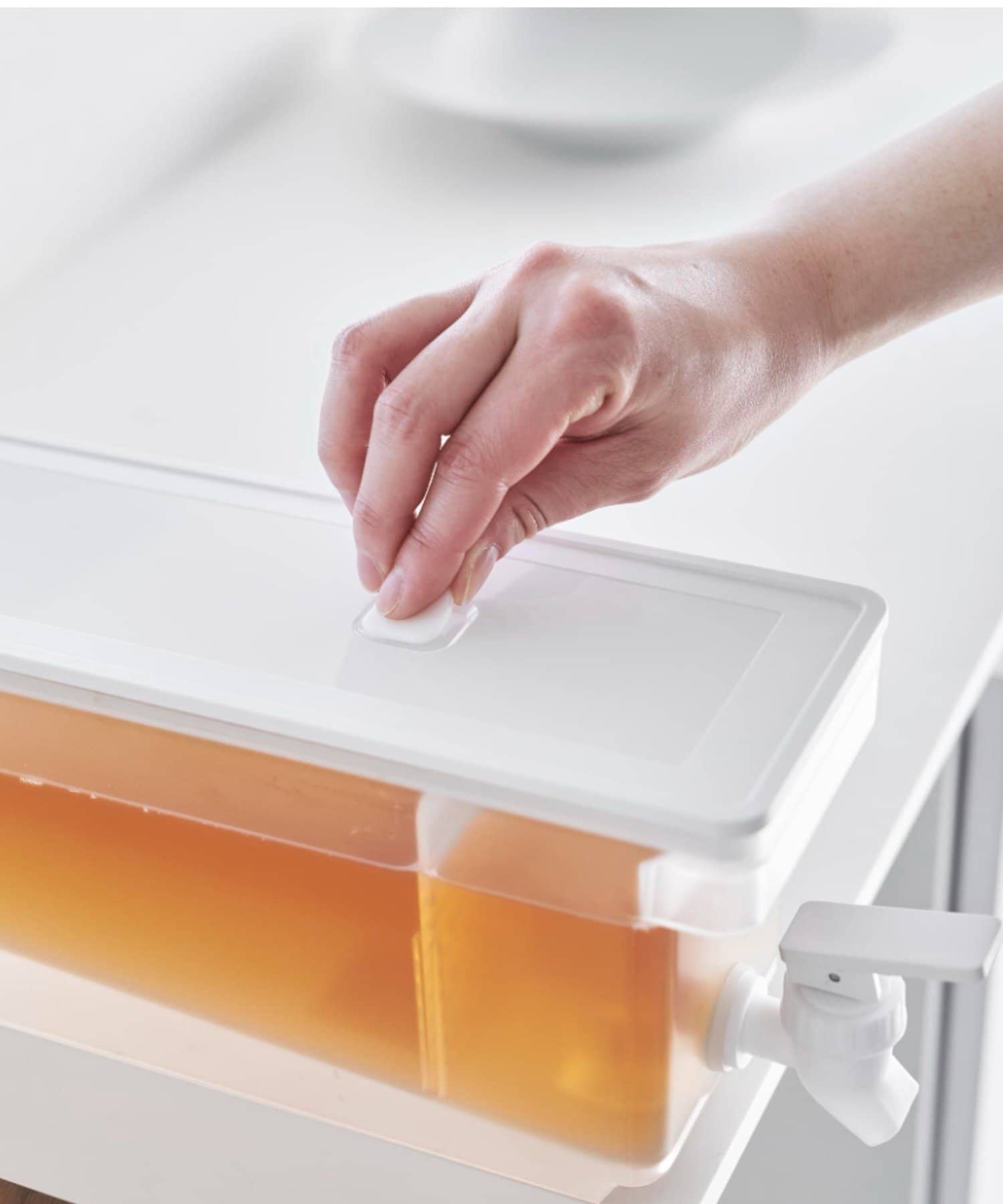 レバーを上下に倒すだけで冷たいお茶を簡単に注げる冷蔵庫ドリンクサーバーです。冷水筒を取り出さずに冷蔵庫から直接ドリンクを注げて便利。キッチンカウンターに設置すれば、いつでも手軽にお茶やフレーバーウォーターを飲むことができます。仕切りがあるのでティーパックやフレーバーウォーターの具材が注ぎ口を塞がずスムーズに注げます。レバーは上下共にロックでき、レバーから手を離して注げる点も便利です。パーツは全て分解して洗うことができるので清潔に保て、食洗機にも対応しています。同じシリーズで2.8Lの大容量タイプもございます。別ページをご覧ください。