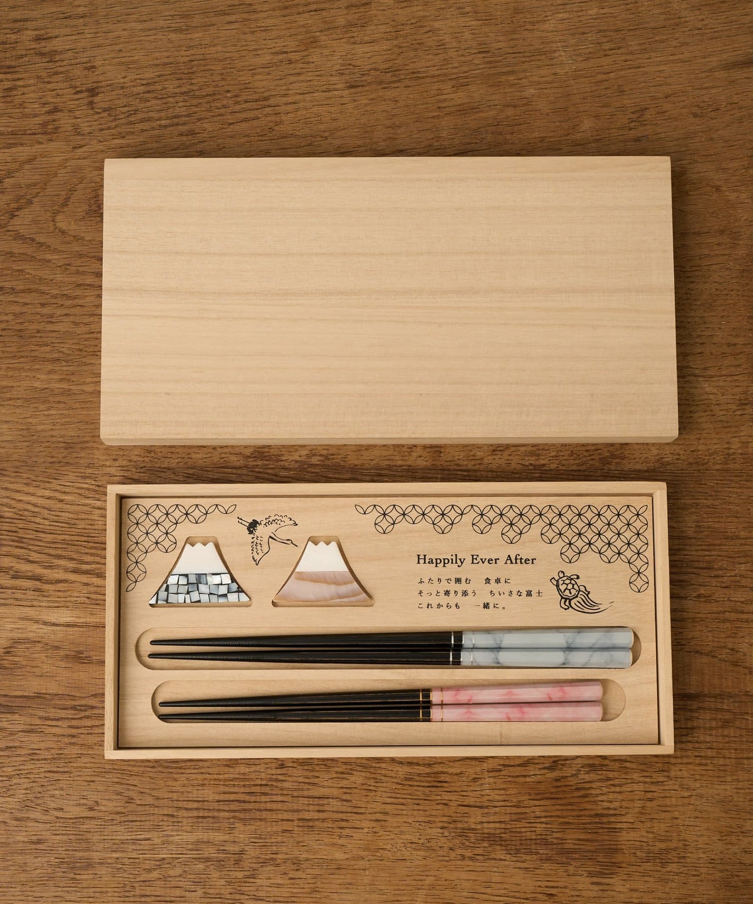 彩り豊かなお箸と、縁起物でもある富士山をモチーフにした箸置きのおめでたい贈り物にぴったりのセット。
