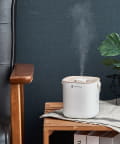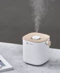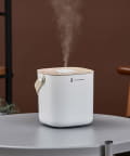 丸みのあるボックスデザインと、天面にあしらったリアルな木目柄が目を惹く充電式の加湿器。