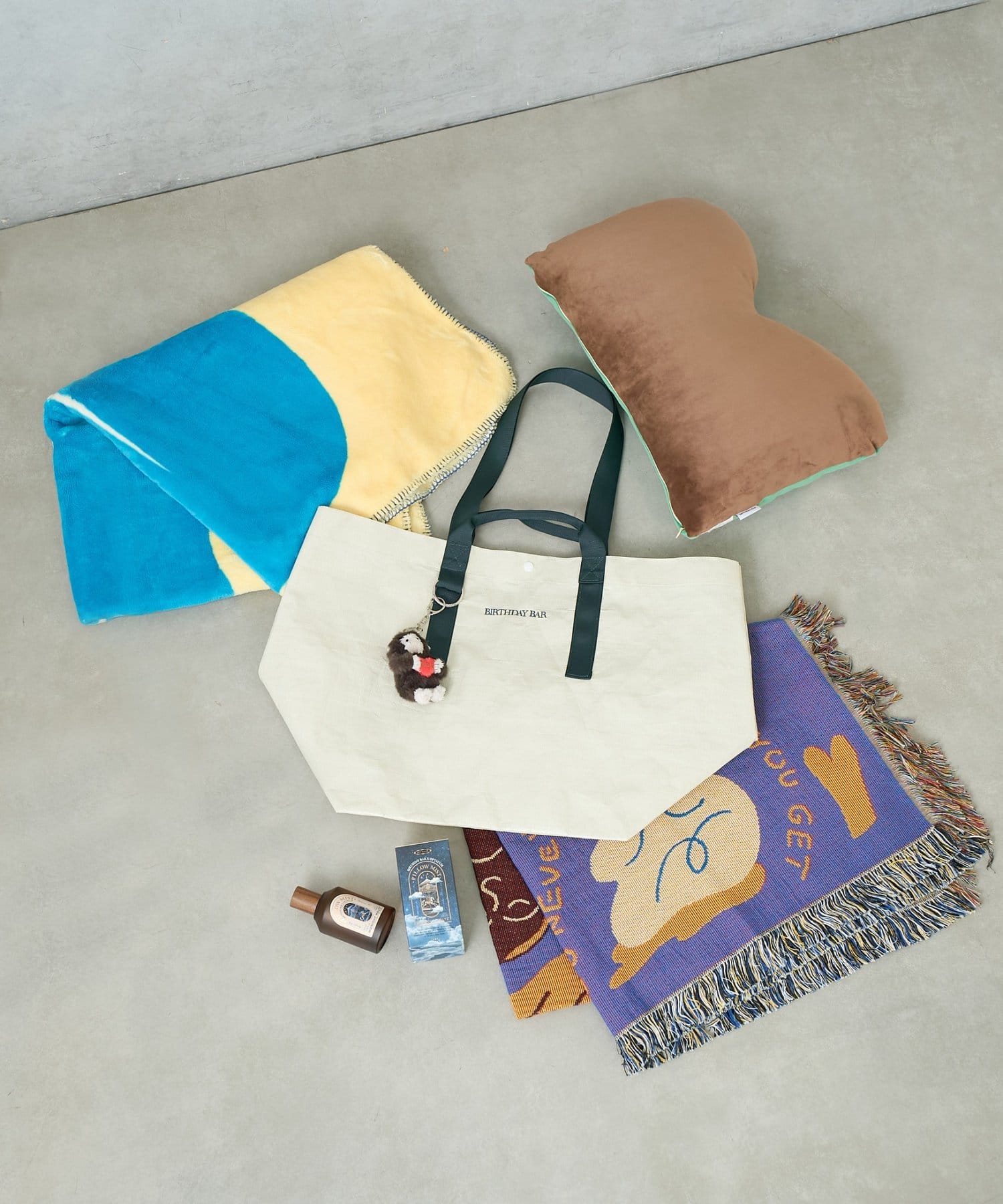 セット内容:①OPTATUMピローミストMidnight Waltz ②norahi x BIRTHDAY BAR スローケット ネイビー ③フリースブランケット ④ミニクッション ⑤ゴリラチャーム ⑥レジャーシートトートバッグ