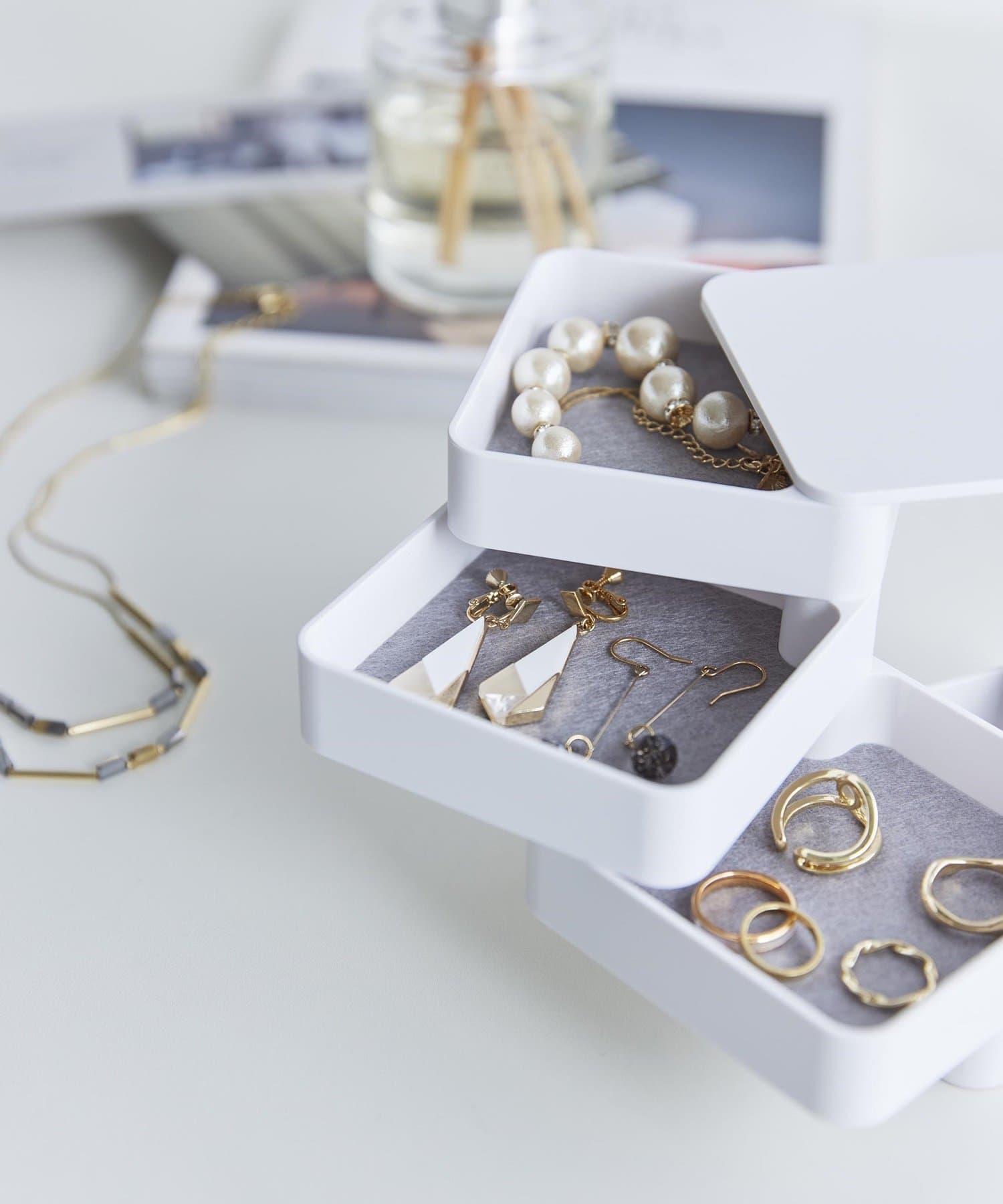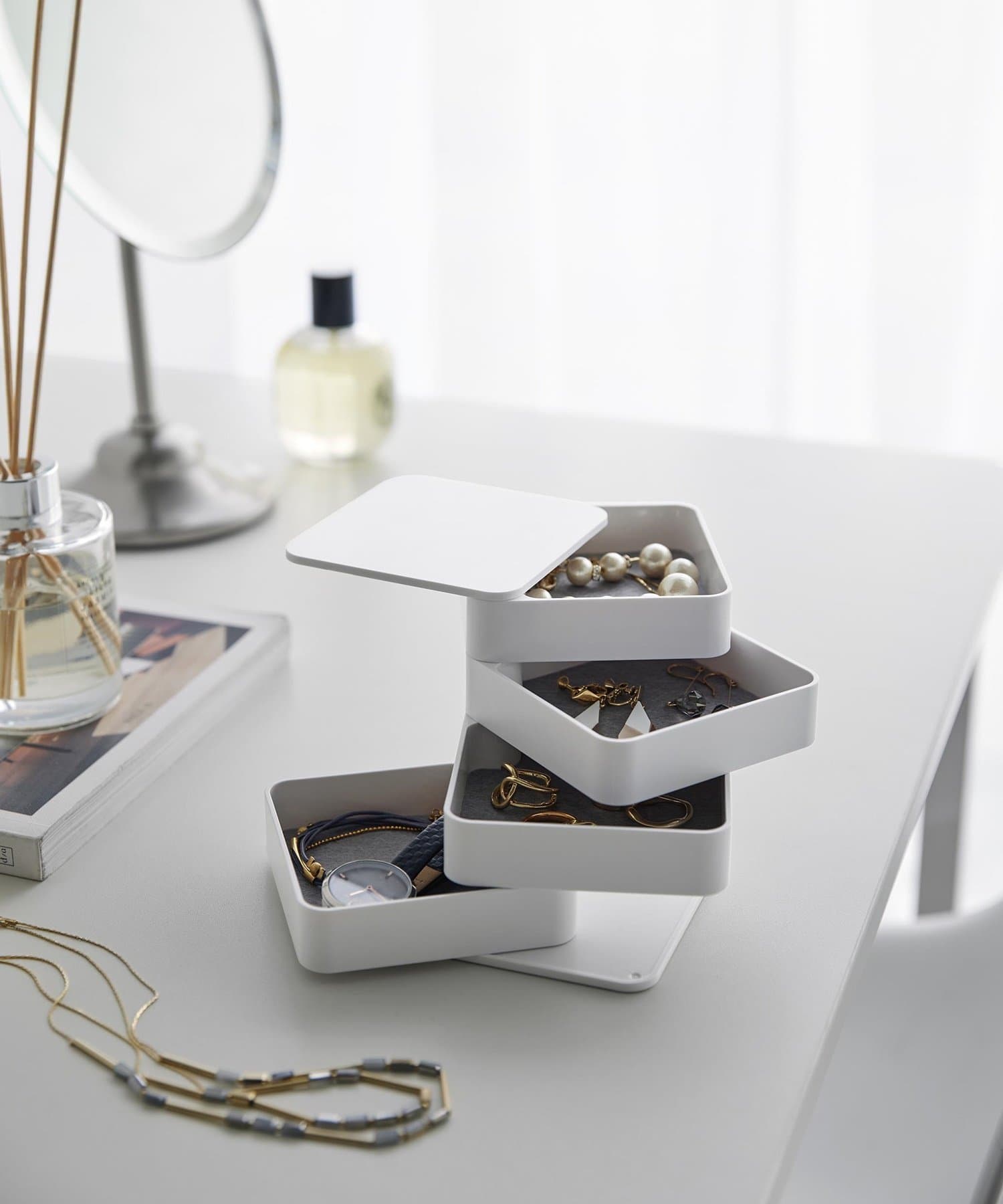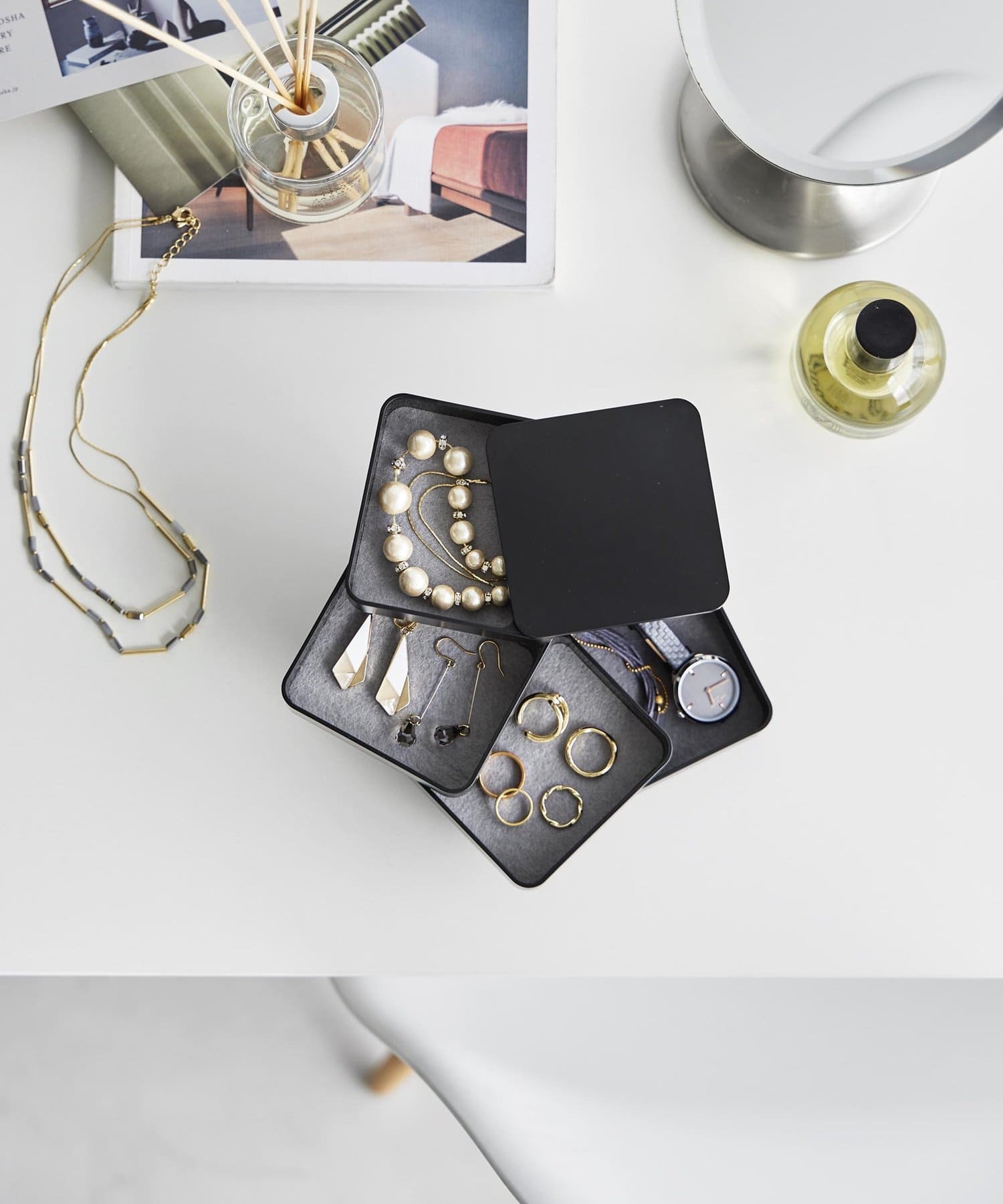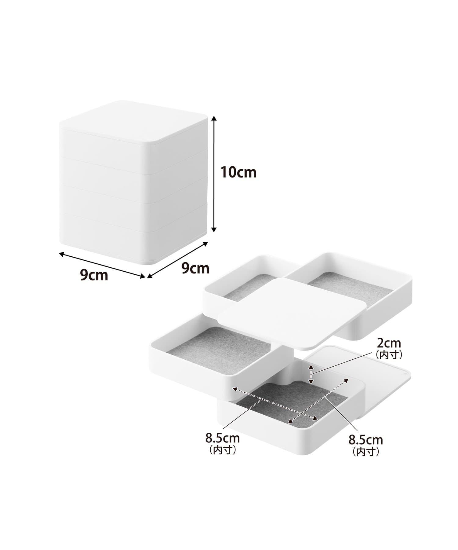 回転式で取り出しやすいスクエア型アクセサリートレー4段。アクセサリーをはじめ、コスメや腕時計など毎日身に着ける小物の収納に最適です。回転式になっているので、必要な段のトレーをスライドさせれば取りたい物が簡単に取り出せます。使わない時はトレー部分を重ねてコンパクトに。アクセサリーをキズつけにくいフェルトマット付き。蓋付きなのでほこりも防止できます。