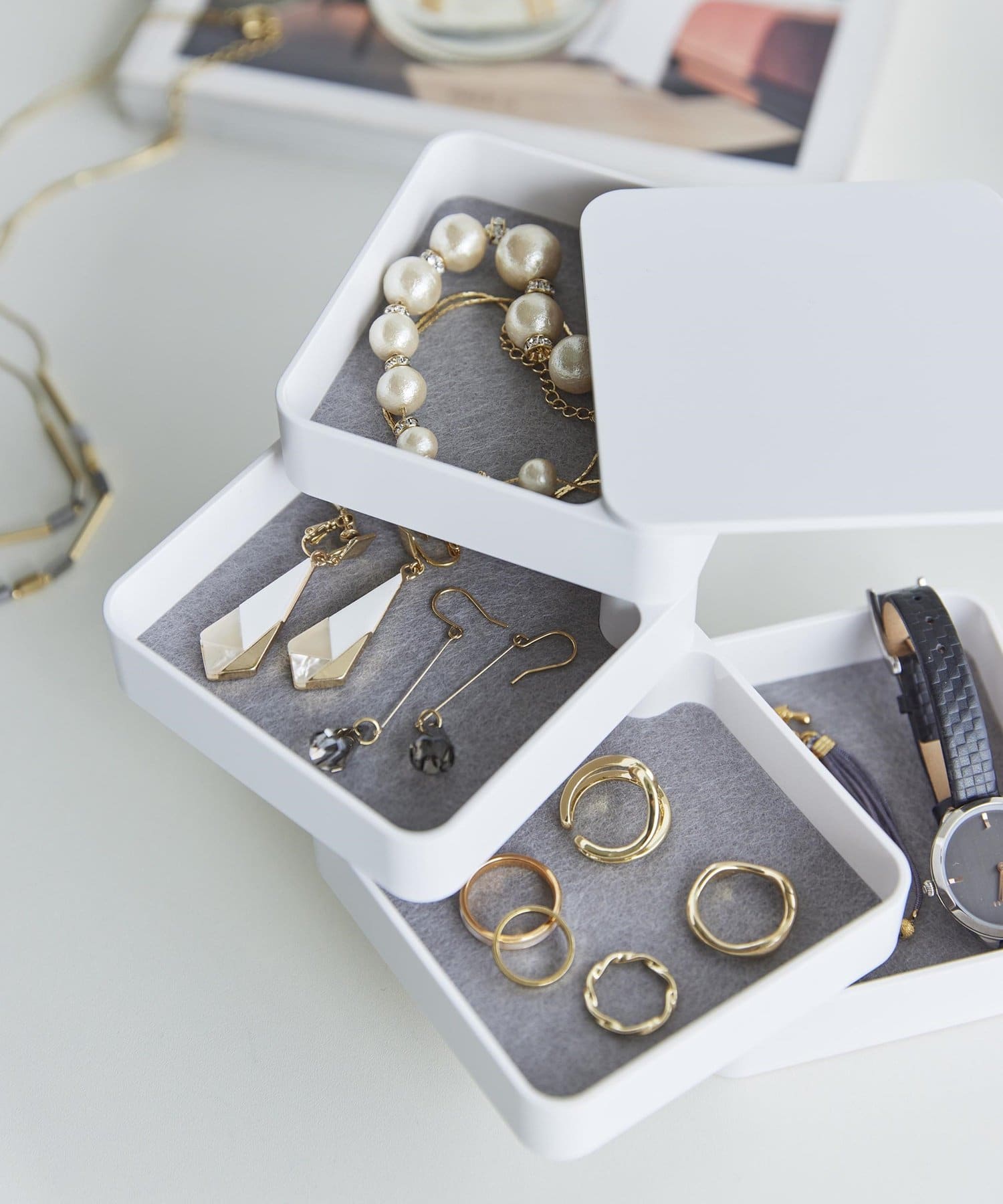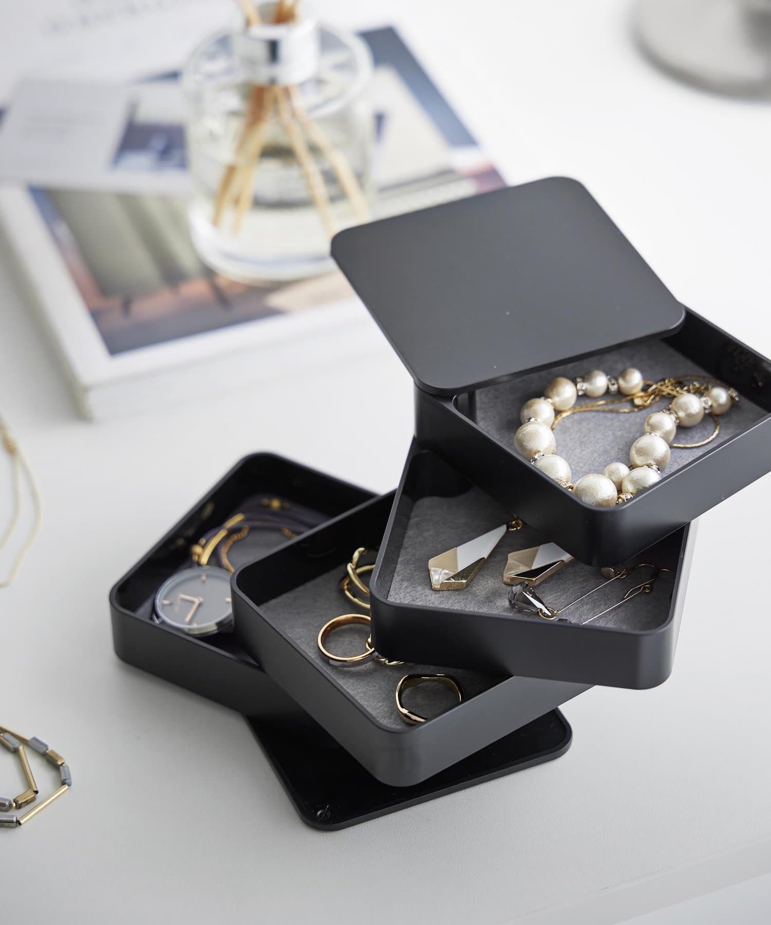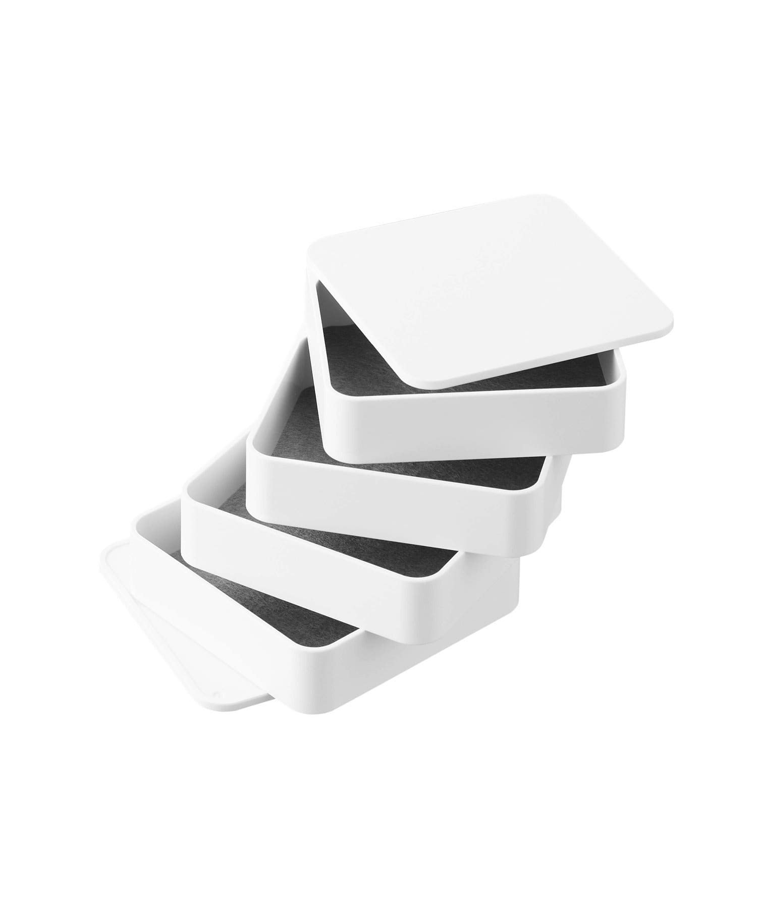 回転式で取り出しやすいスクエア型アクセサリートレー4段。アクセサリーをはじめ、コスメや腕時計など毎日身に着ける小物の収納に最適です。回転式になっているので、必要な段のトレーをスライドさせれば取りたい物が簡単に取り出せます。使わない時はトレー部分を重ねてコンパクトに。アクセサリーをキズつけにくいフェルトマット付き。蓋付きなのでほこりも防止できます。