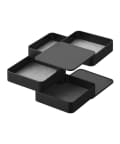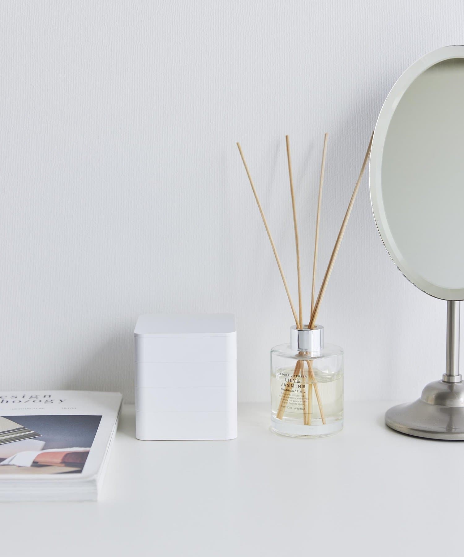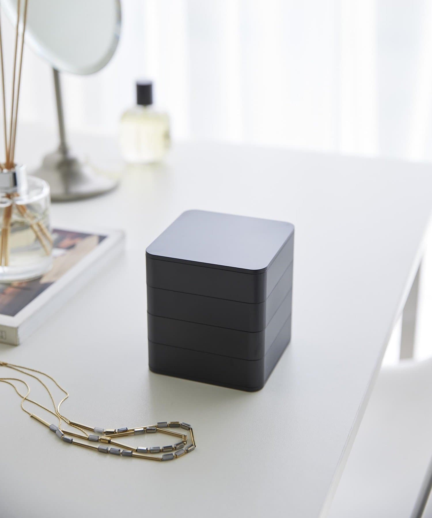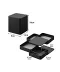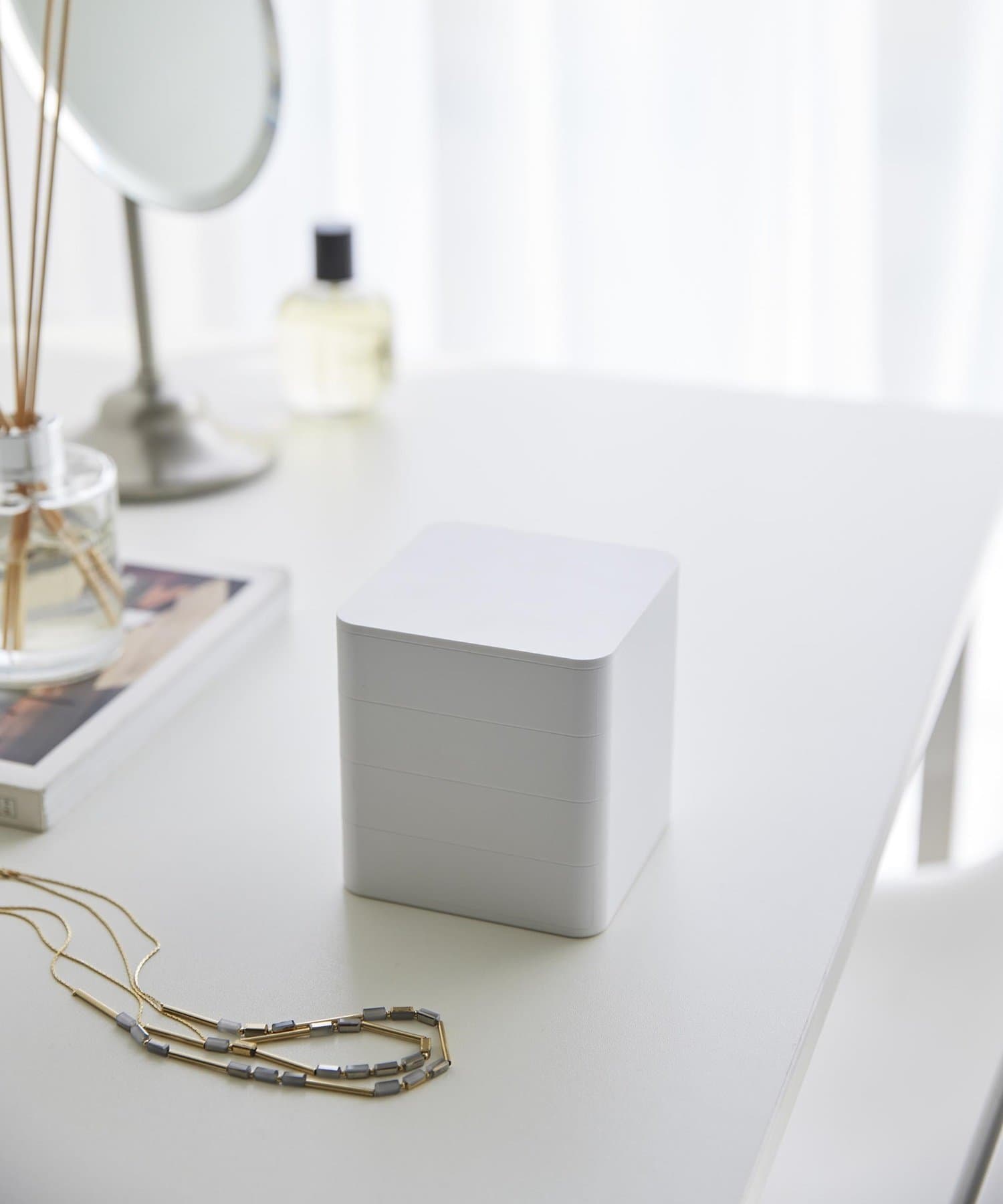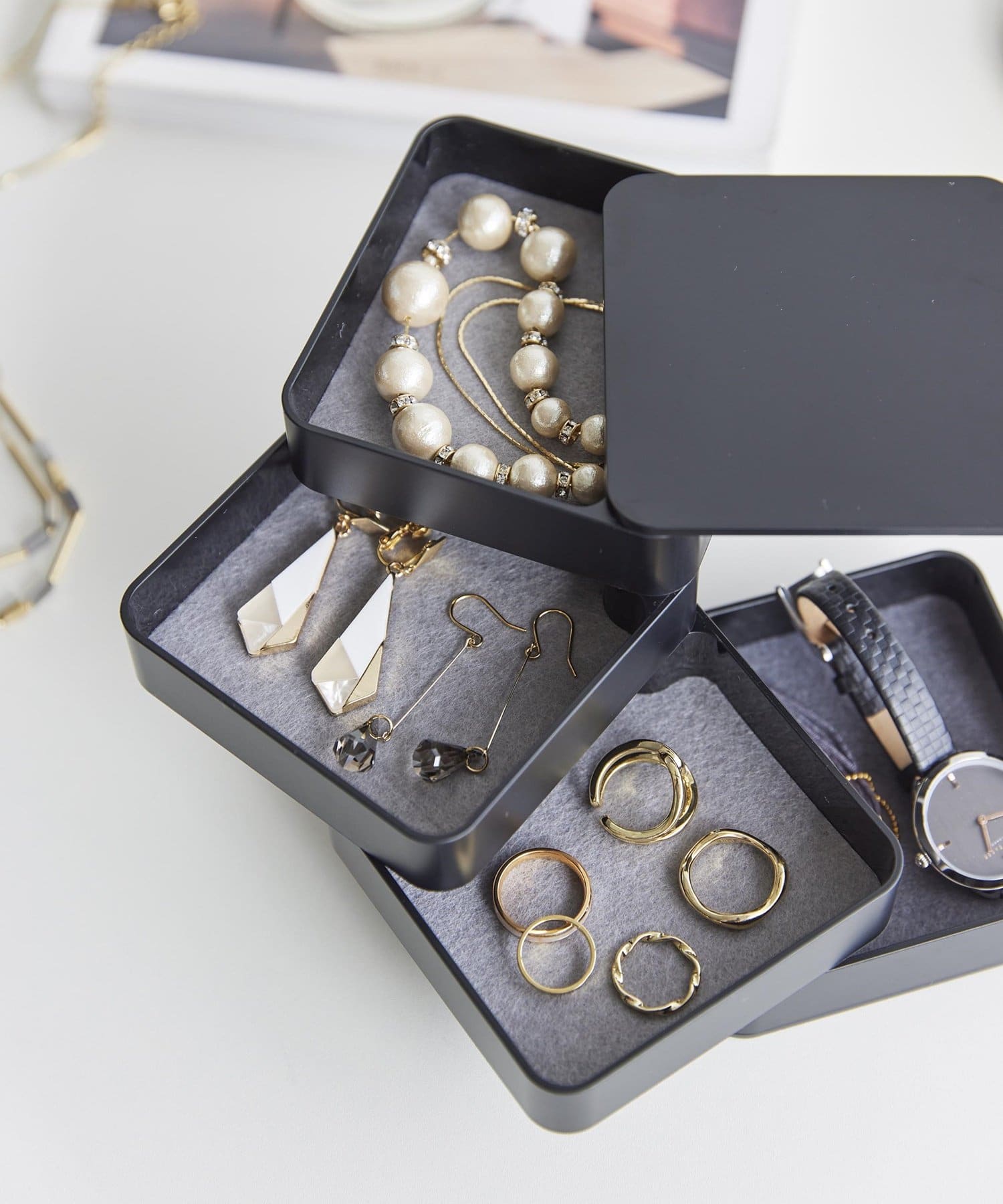 回転式で取り出しやすいスクエア型アクセサリートレー4段。アクセサリーをはじめ、コスメや腕時計など毎日身に着ける小物の収納に最適です。回転式になっているので、必要な段のトレーをスライドさせれば取りたい物が簡単に取り出せます。使わない時はトレー部分を重ねてコンパクトに。アクセサリーをキズつけにくいフェルトマット付き。蓋付きなのでほこりも防止できます。