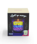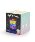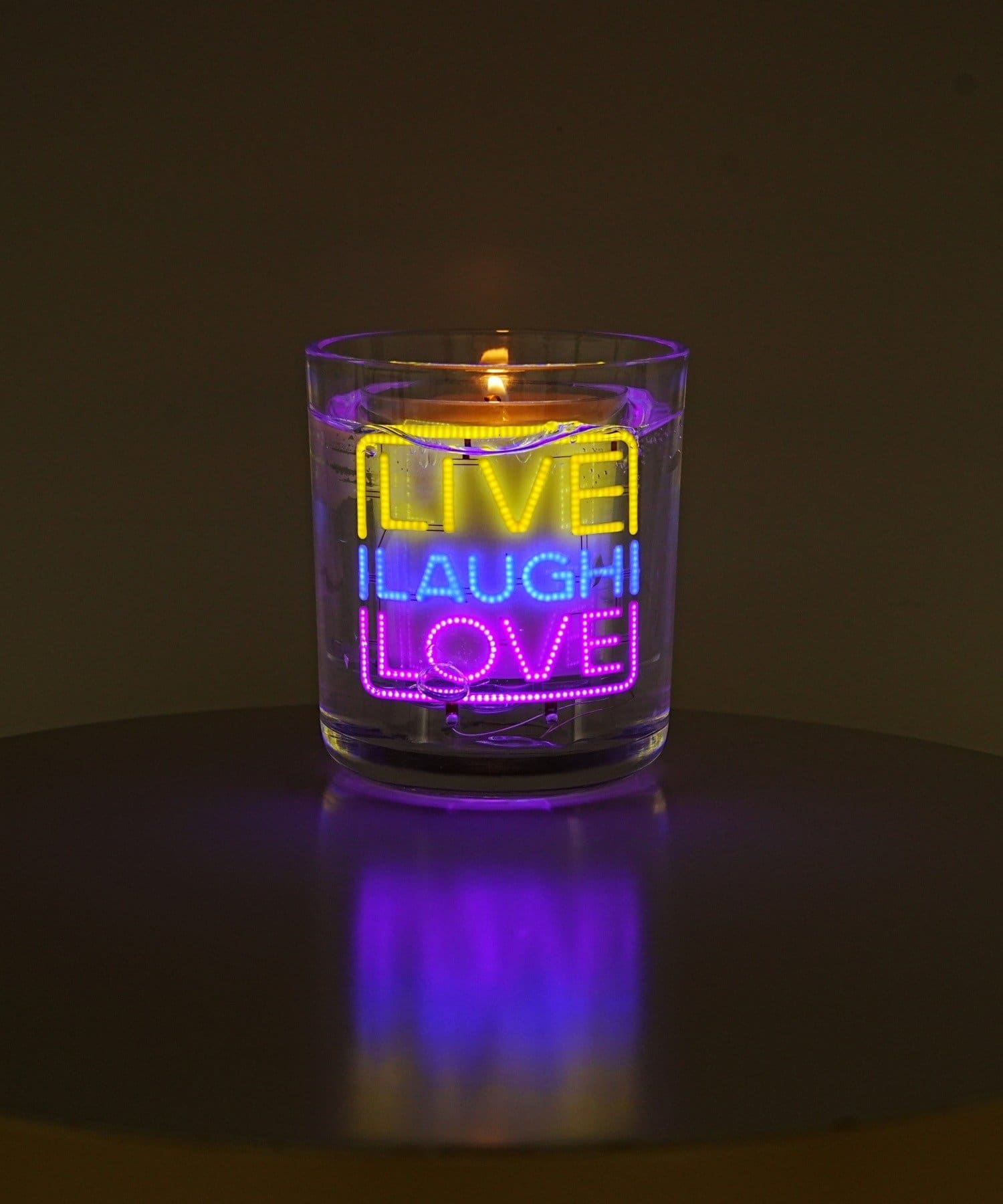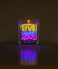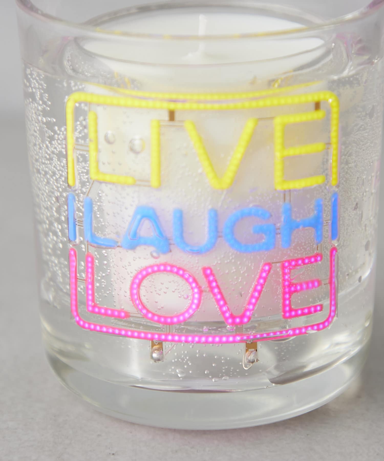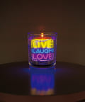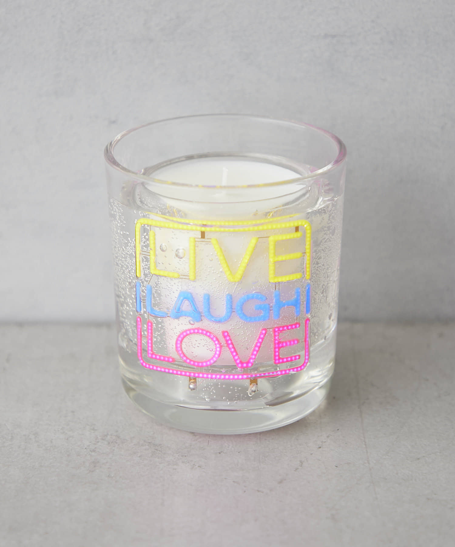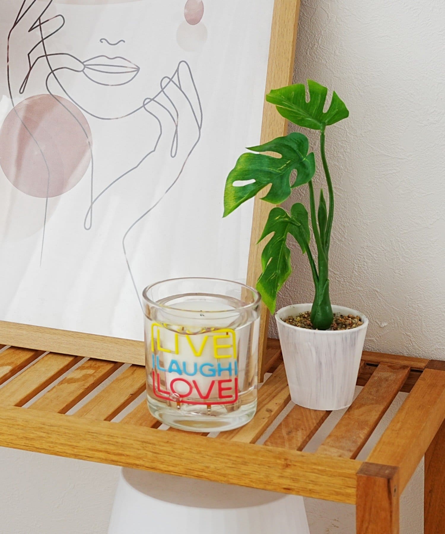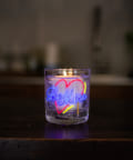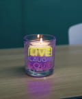 カラフルなメッセージが目を引くデザインのガラスジャーに入ったキャンドル。