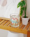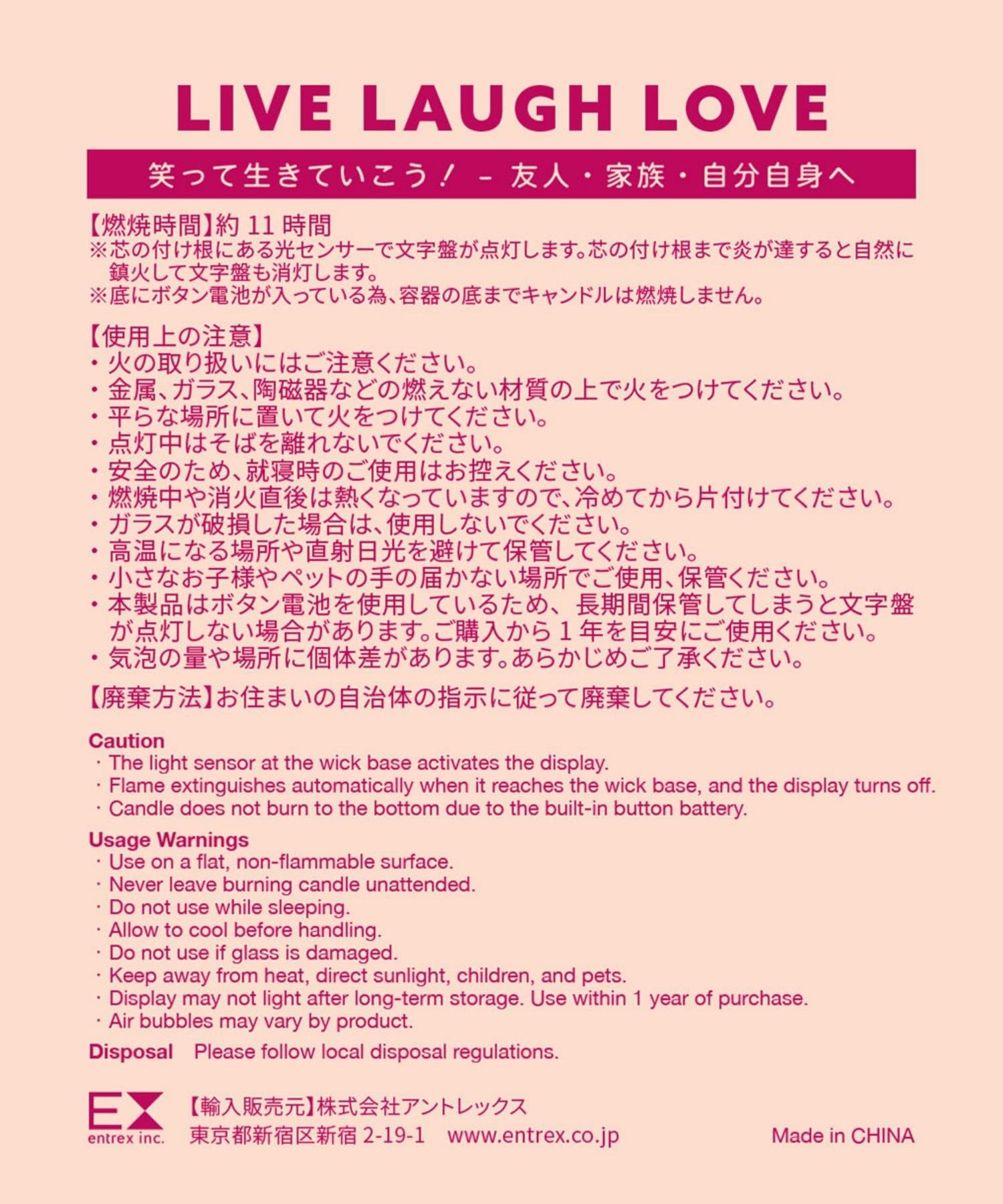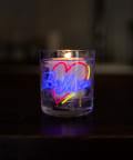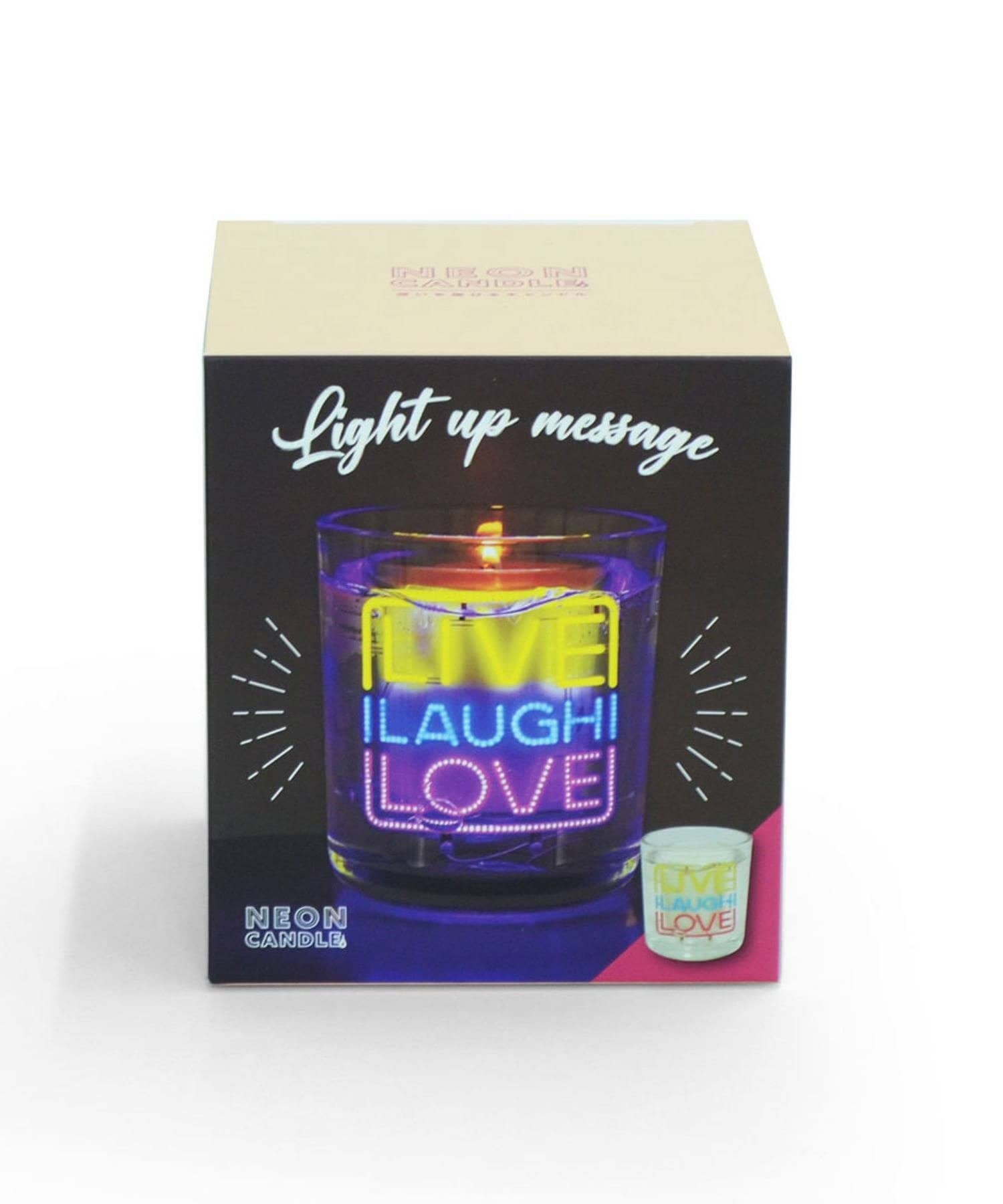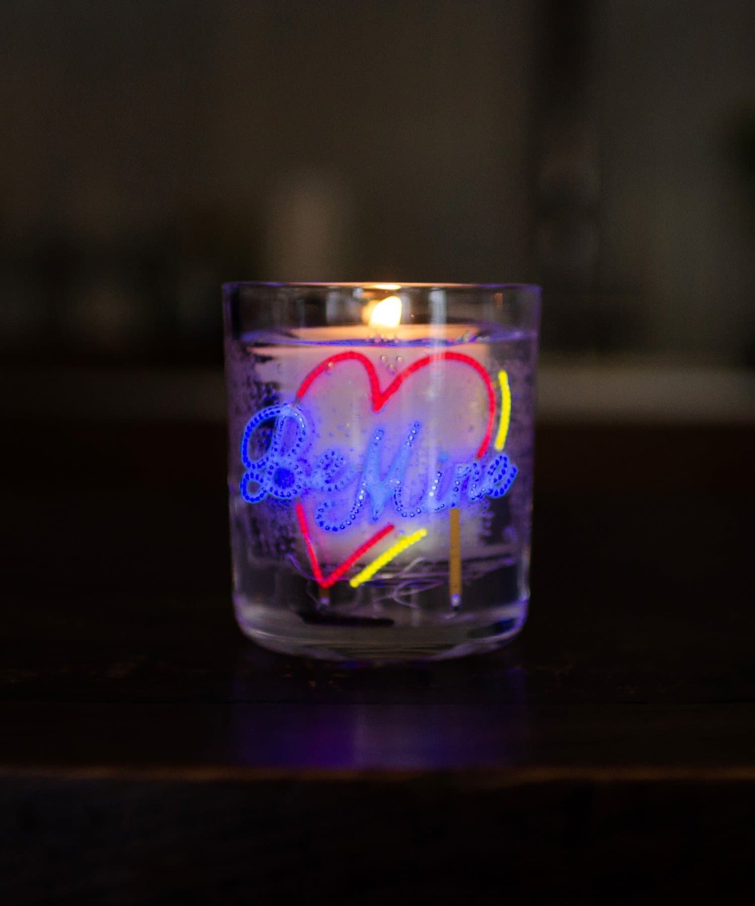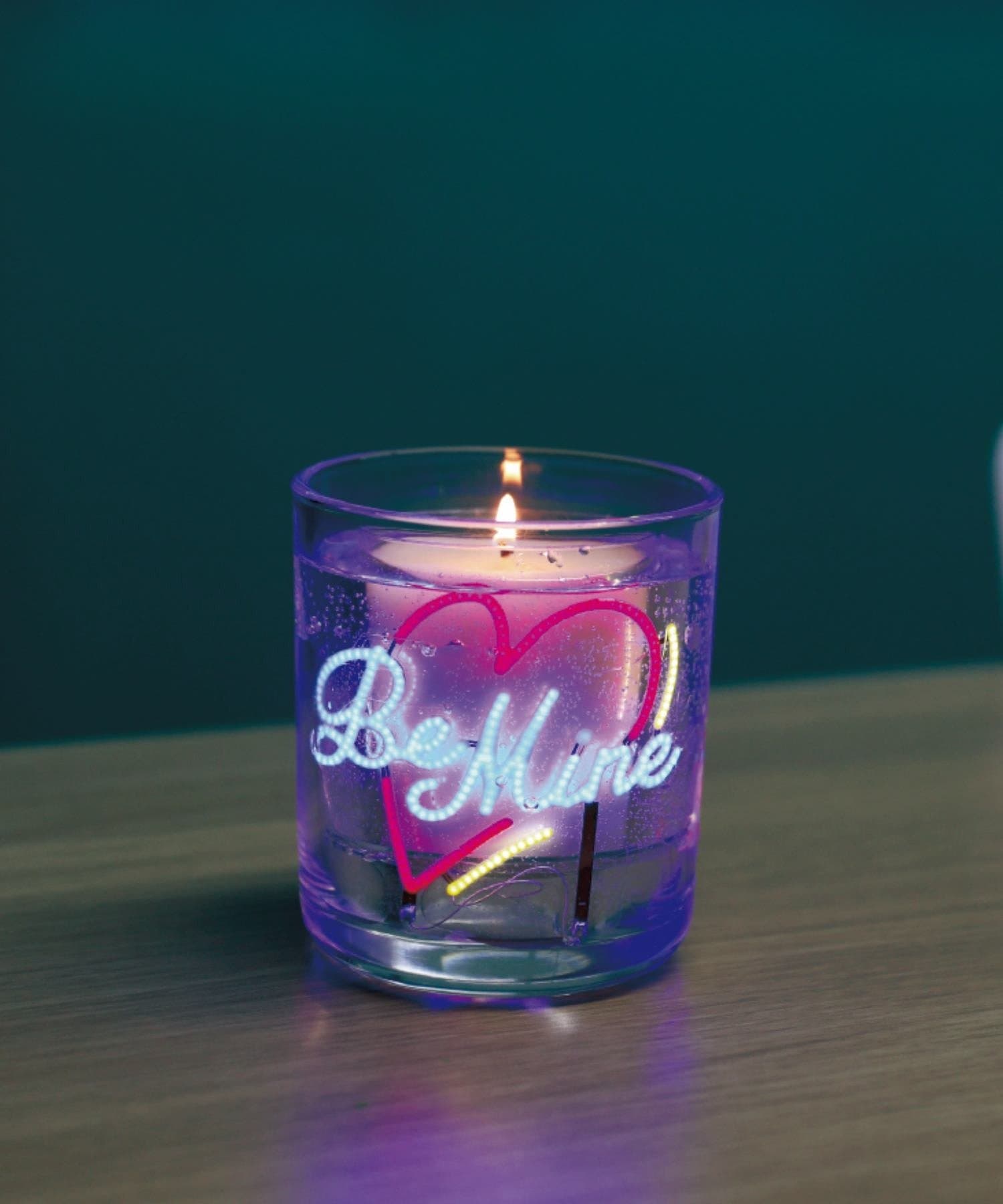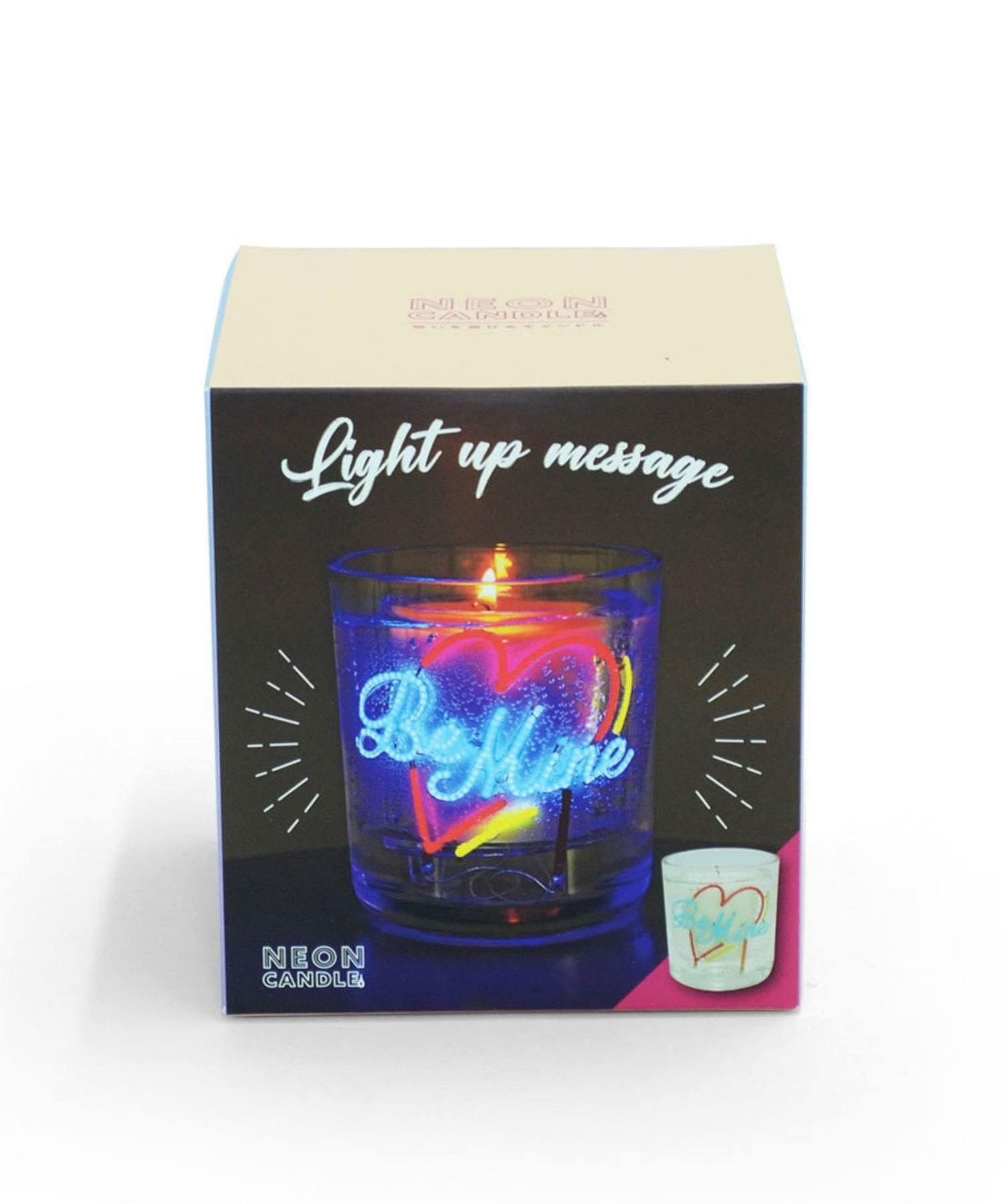 カラフルなメッセージが目を引くデザインのガラスジャーに入ったキャンドル。